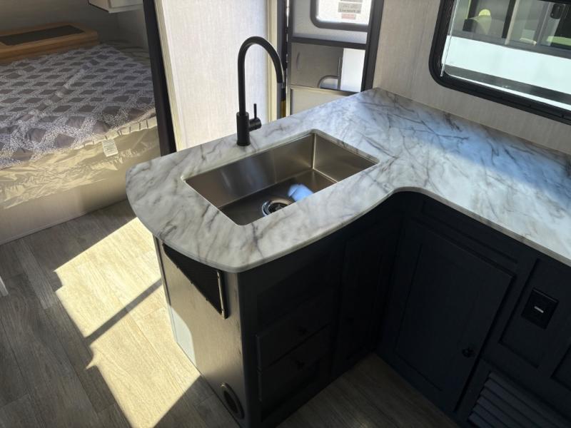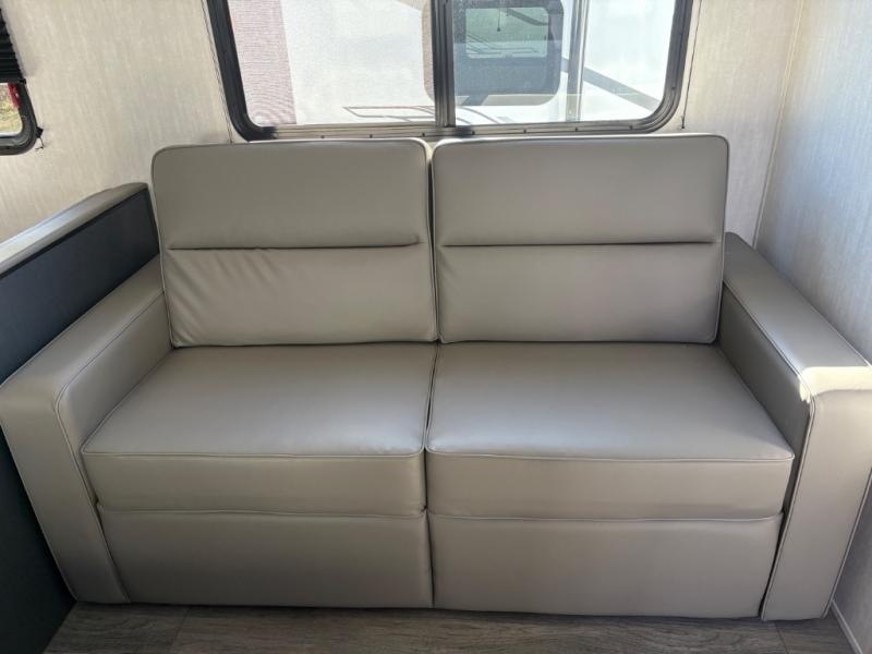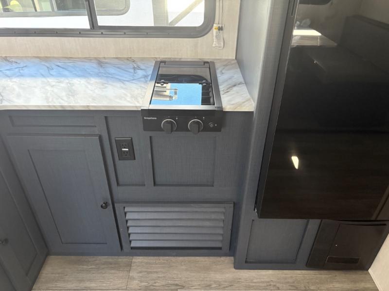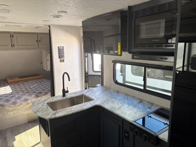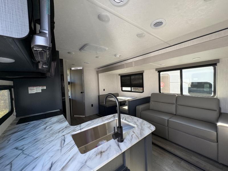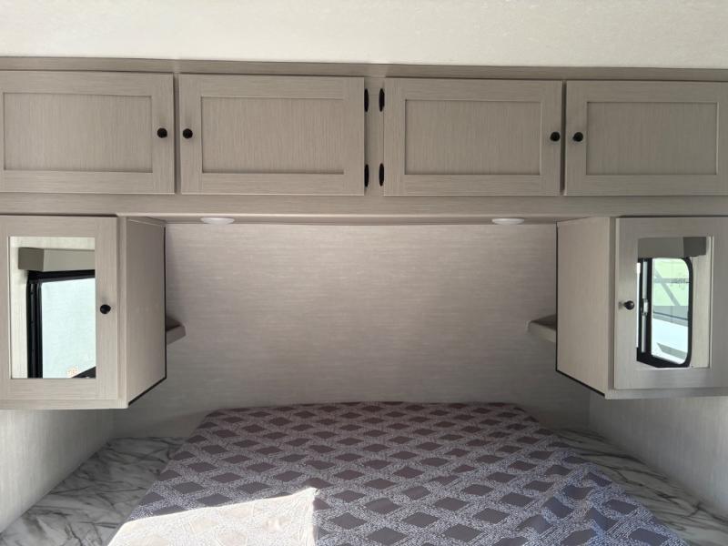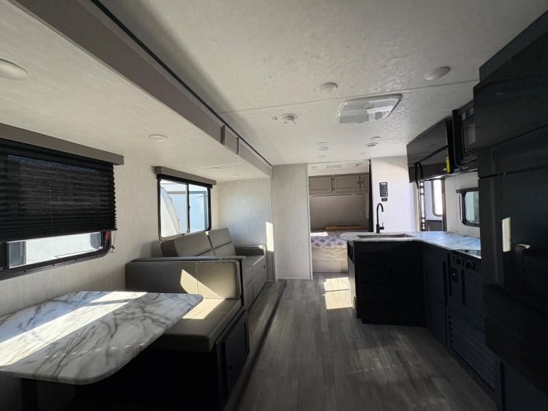 Make each camping trip count in this spacious travel trailer! You will love having your own bedroom up front that includes a queen bed with super storage below plus an overhead cabinet for books and more. A large slide out in the combined kitchen and living area houses the sofa and booth dinette, and these pieces of furniture can double as sleeping space for guests as well. The chef of your group will appreciate the L-shaped kitchen counter with a large sink, a microwave and range plus a refrigerator and pantry for food storage. This unit also includes 30" x 74" double-size bunks for your guests or kids!