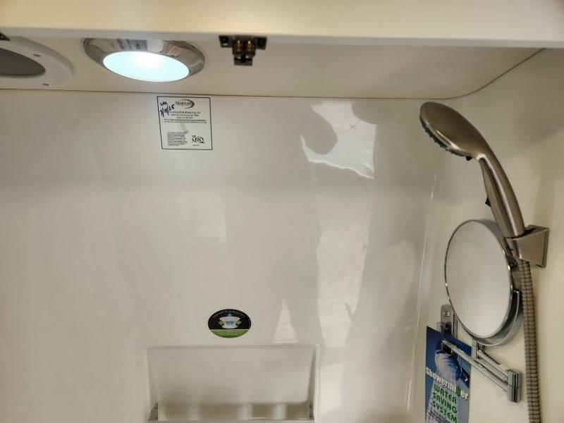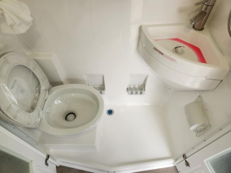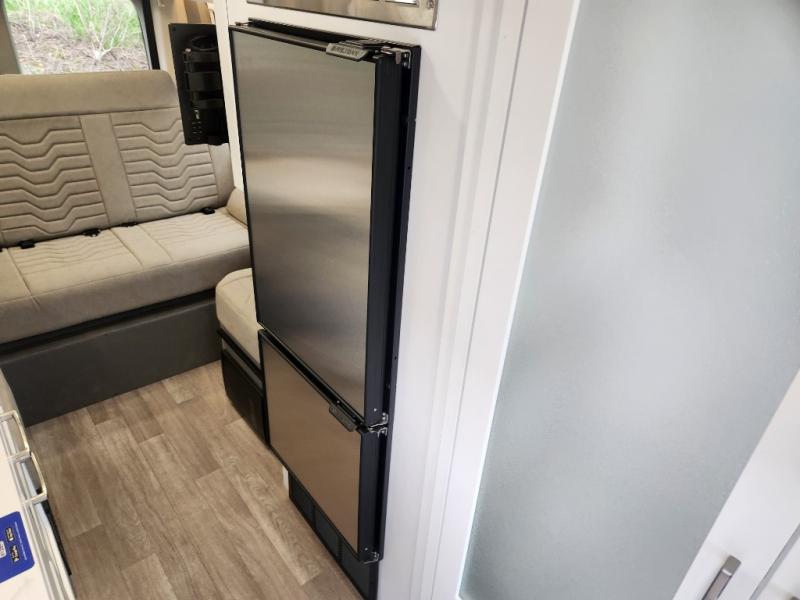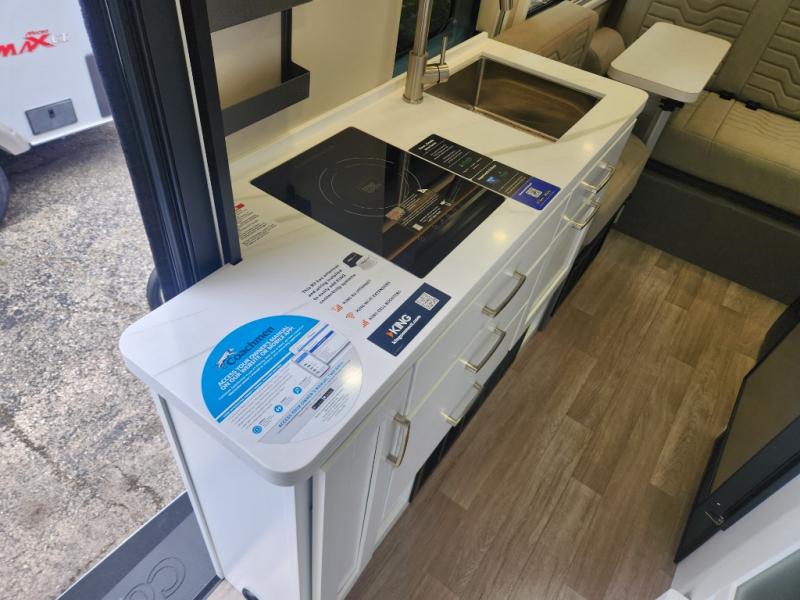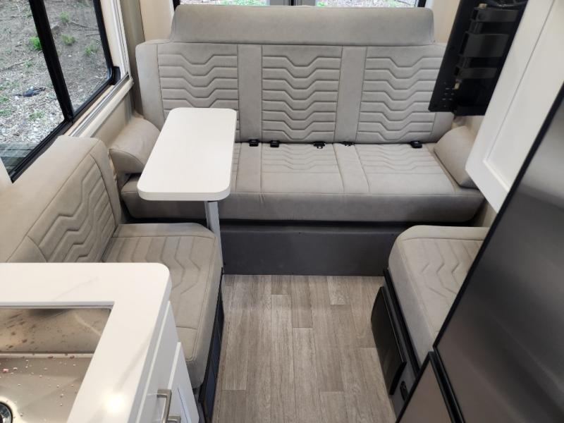 This all-wheel drive coach is perfect for trips near and far. Once you park, you can swivel the captain's seats around to enjoy lunch at the removeable table, and you can freshen up in the convenient wet bath before heading out to stretch your legs. There is an induction cooktop, a round sink, plus a Nova Kool compressor refrigerator for your perishables. The two jump seats and rear power sofa will convert to a comfortable bed at night, and the lagun table in between will allow you to play a game of cards before bed. And don't worry about storage space since this model includes overhead compartments and a wardrobe to keep your clothes wrinkle-free!