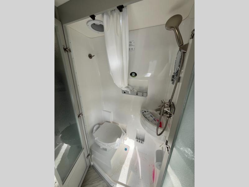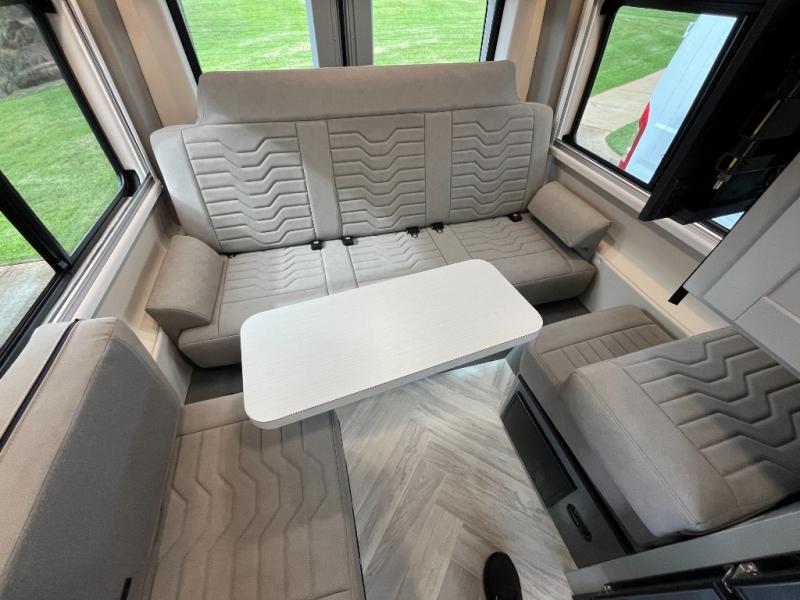 This all-wheel drive coach is perfect for trips near and far. Once you park, you can swivel the captain's seats around to enjoy lunch at the removeable table, and you can freshen up in the convenient wet bath before heading out to stretch your legs. There is an induction cooktop, a round sink, plus a Nova Kool compressor refrigerator for your perishables. The two jump seats and rear power sofa will convert to a comfortable bed at night, and the lagun table in between will allow you to play a game of cards before bed. And don't worry about storage space since this model includes overhead compartments and a wardrobe to keep your clothes wrinkle-free!
