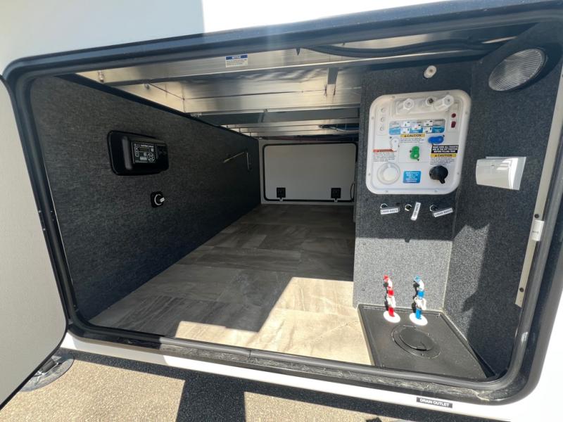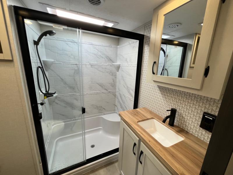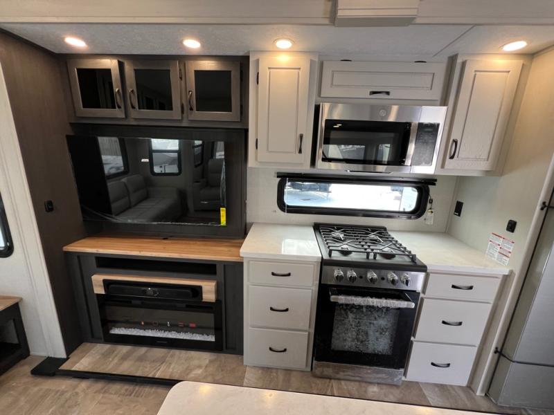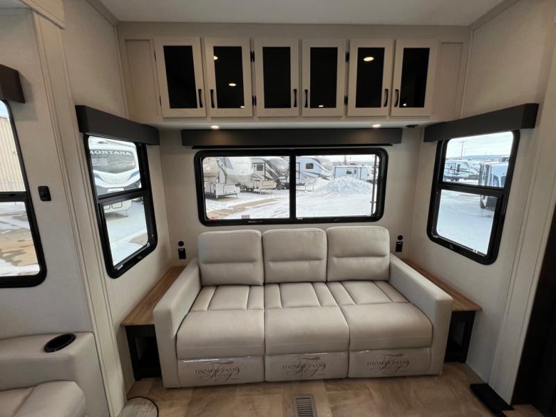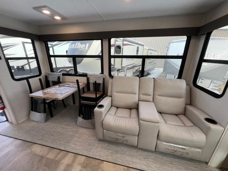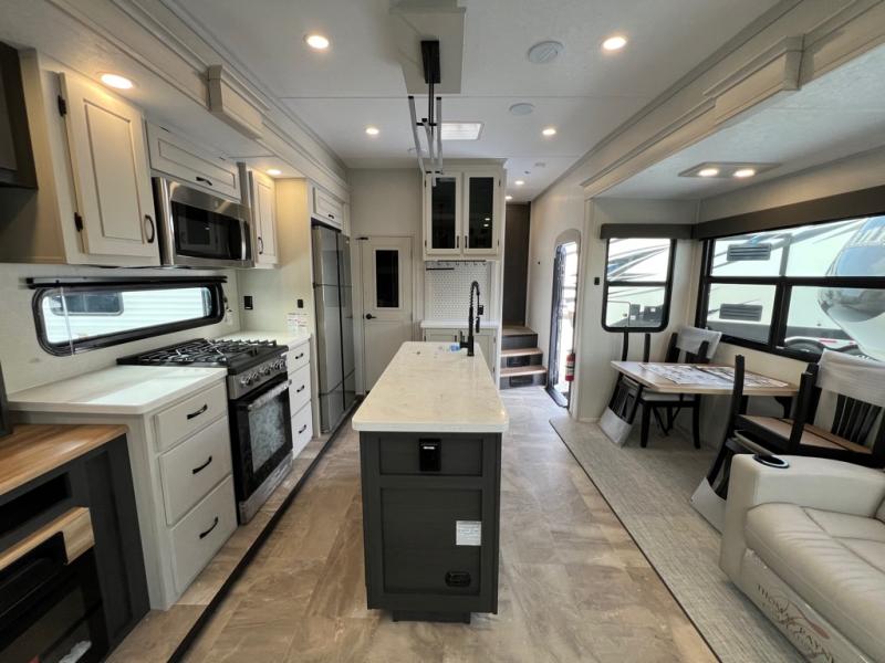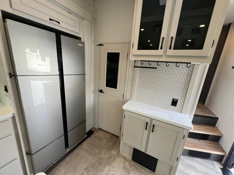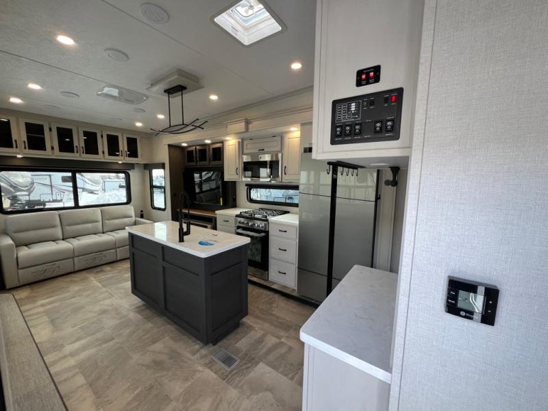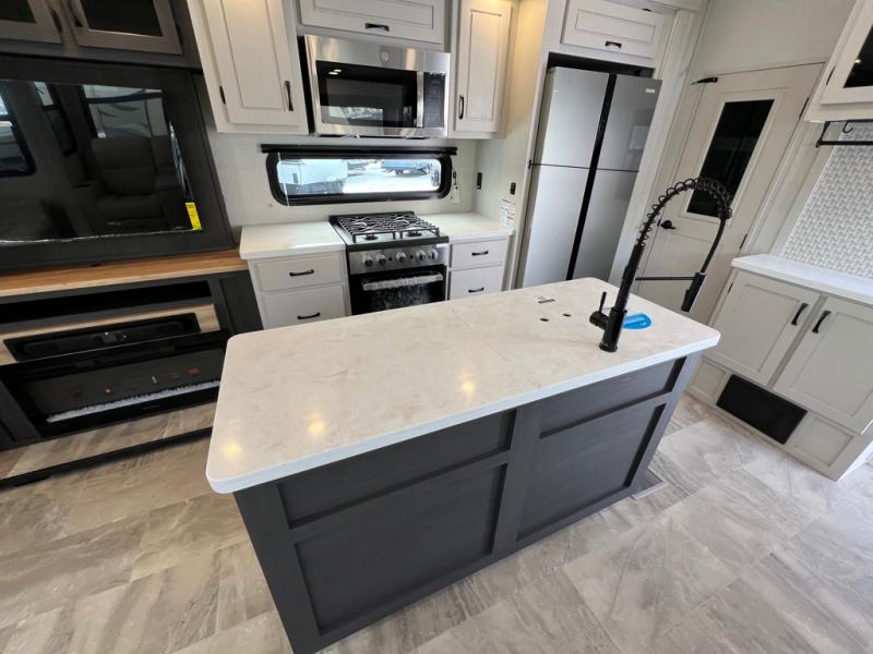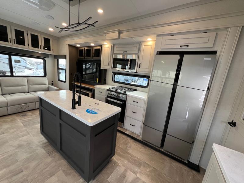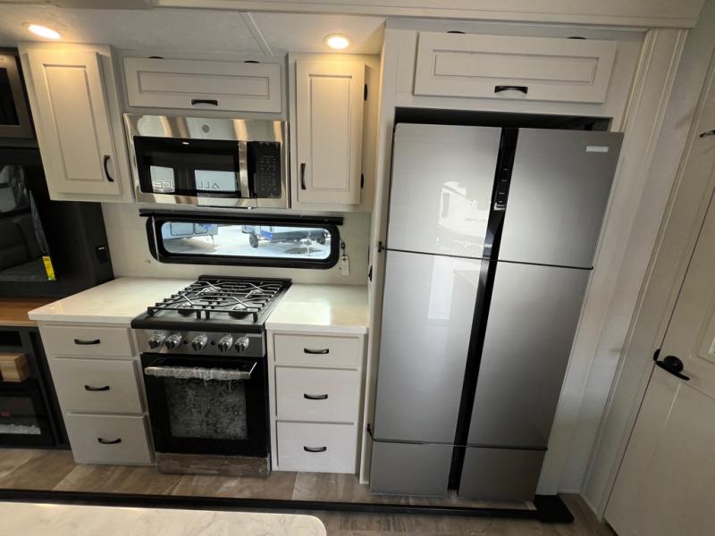 The great outdoors is calling your name in this triple slide out fifth wheel. The kitchen is any chef's dream with its kitchen island, residential 15.6 cu. ft. 12V refrigerator, and large transom window at the cooktop to let a breeze in. The theater seating is directly across from the entertainment center for easy viewing, and you'll find additional seating on the 78" tri-fold hide-a-bed sofa and free-standing table. Cleaning up each day will be a breeze with the shower with a seat and sliding glass doors. The front private bedroom includes a king bed slide out, a large front wardrobe, plus washer and dryer prep to make camping even easier.