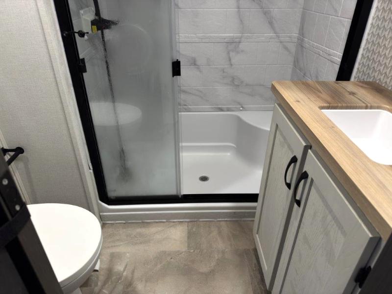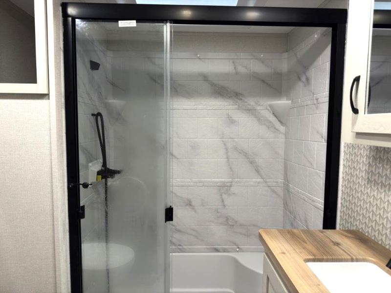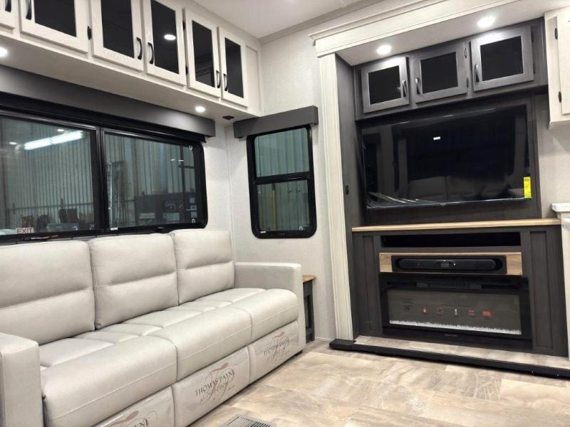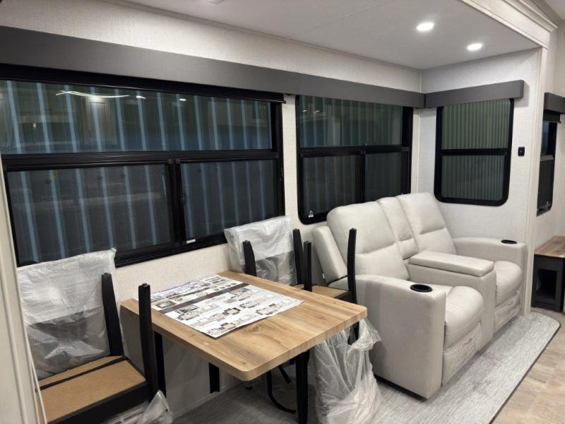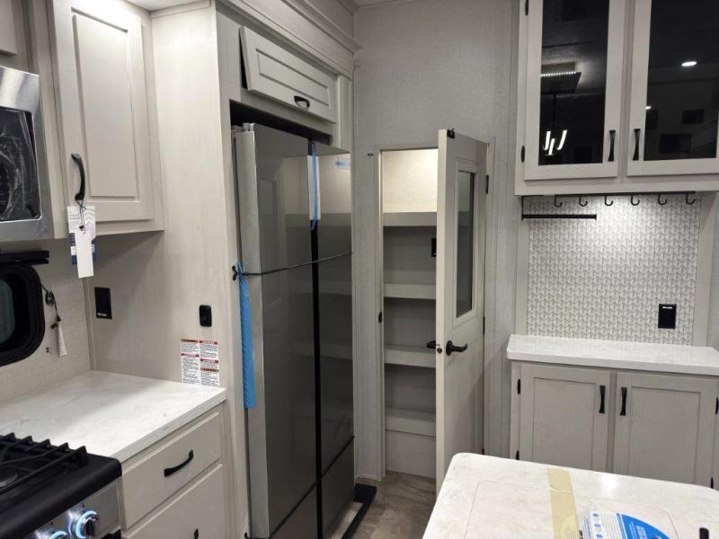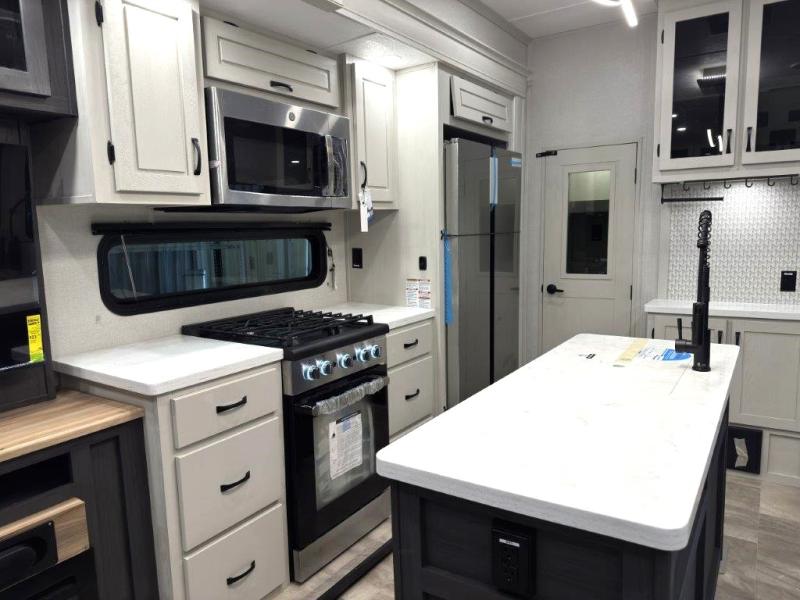 The great outdoors is calling your name in this triple slide out fifth wheel. The kitchen is any chef's dream with its kitchen island, residential 15.6 cu. ft. 12V refrigerator, and large transom window at the cooktop to let a breeze in. The theater seating is directly across from the entertainment center for easy viewing, and you'll find additional seating on the 78" tri-fold hide-a-bed sofa and free-standing table. Cleaning up each day will be a breeze with the shower with a seat and sliding glass doors. The front private bedroom includes a king bed slide out, a large front wardrobe, plus washer and dryer prep to make camping even easier.