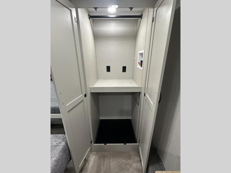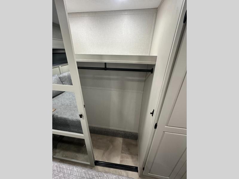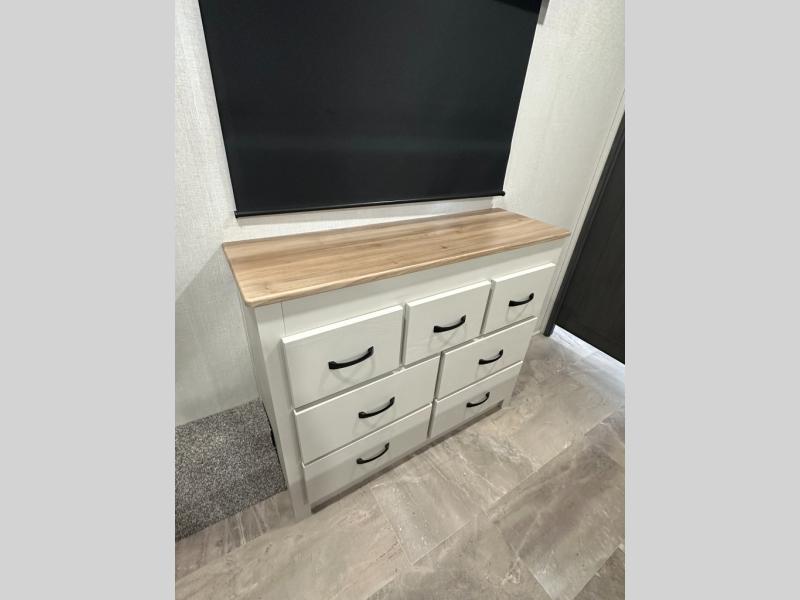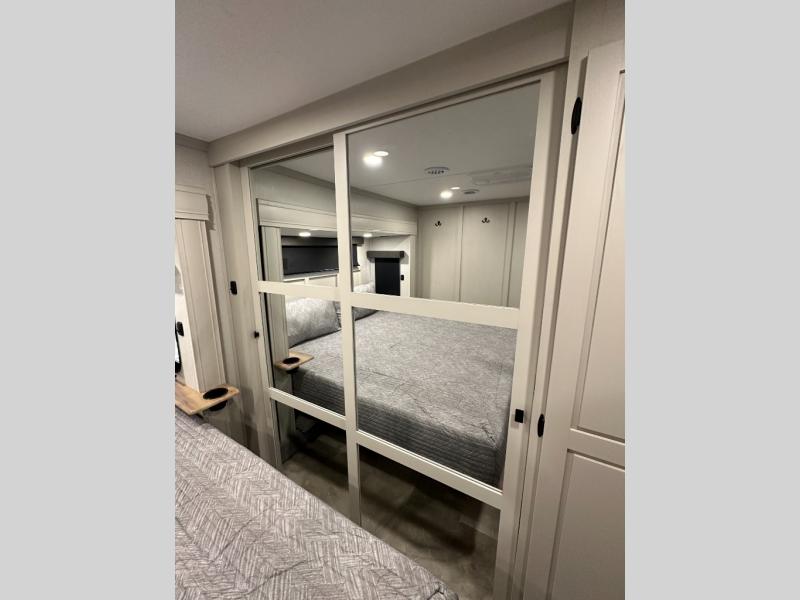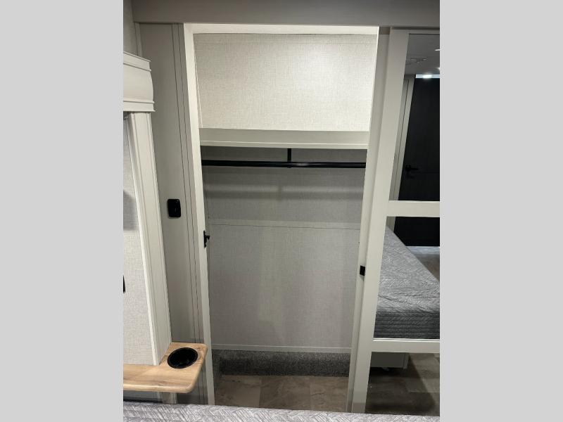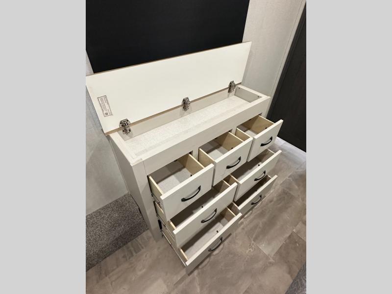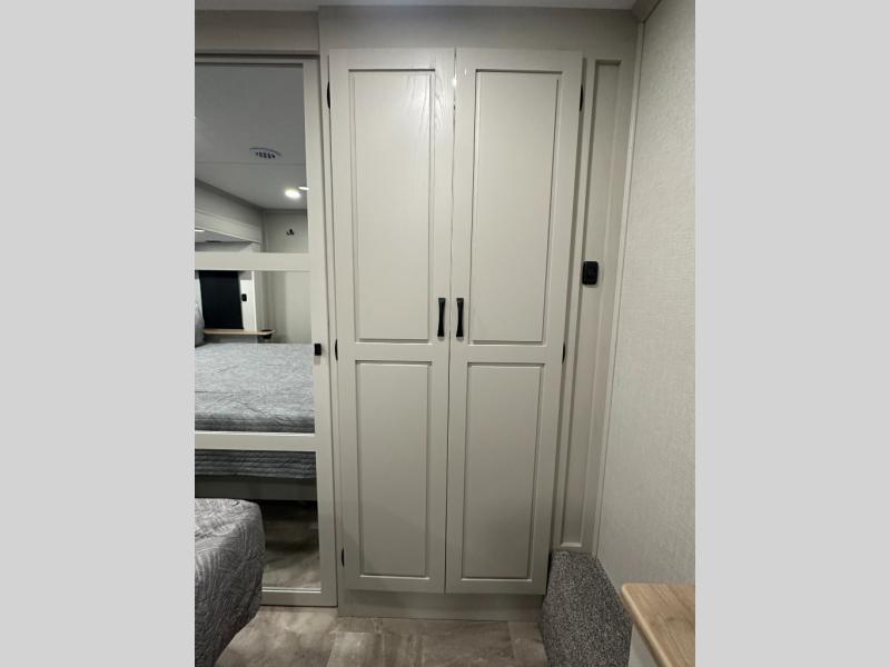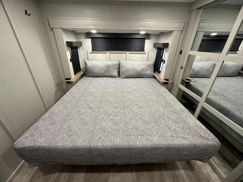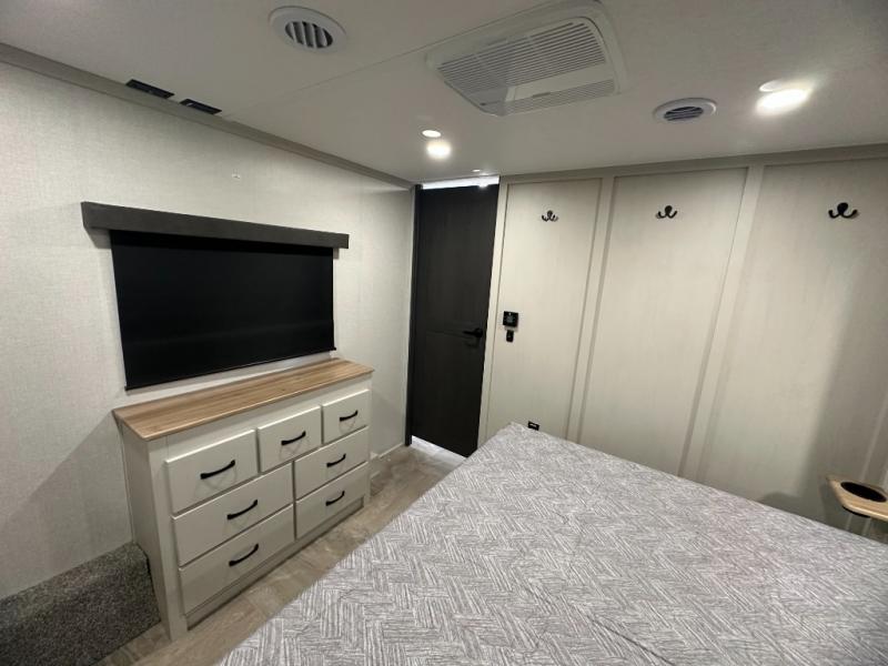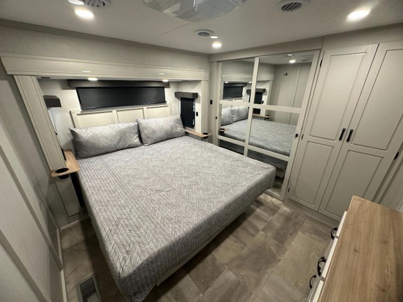 Bedroom: Front king bed slide-out, under-bed storage, full wardrobe, dresser, plus washer/dryer prep closet
