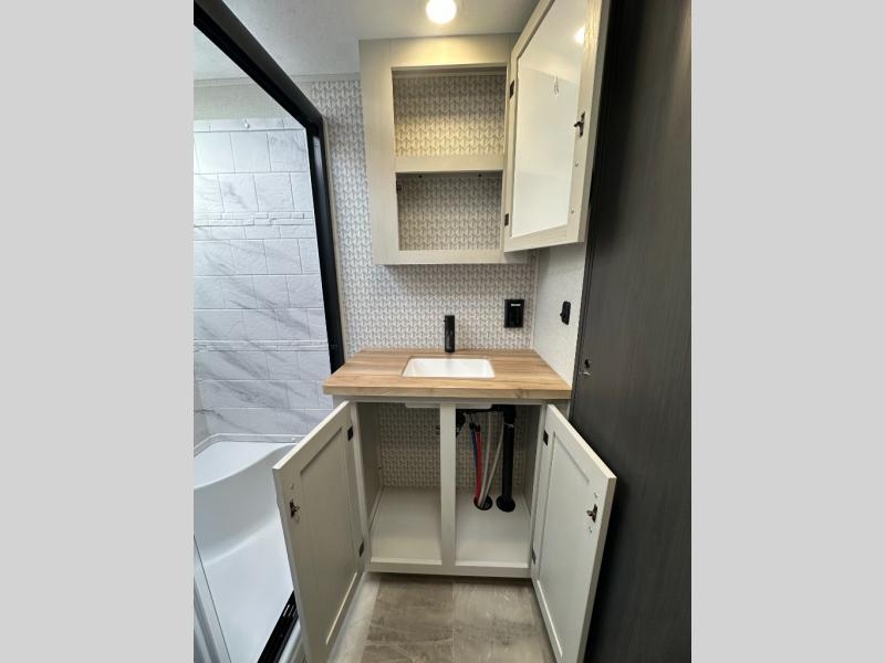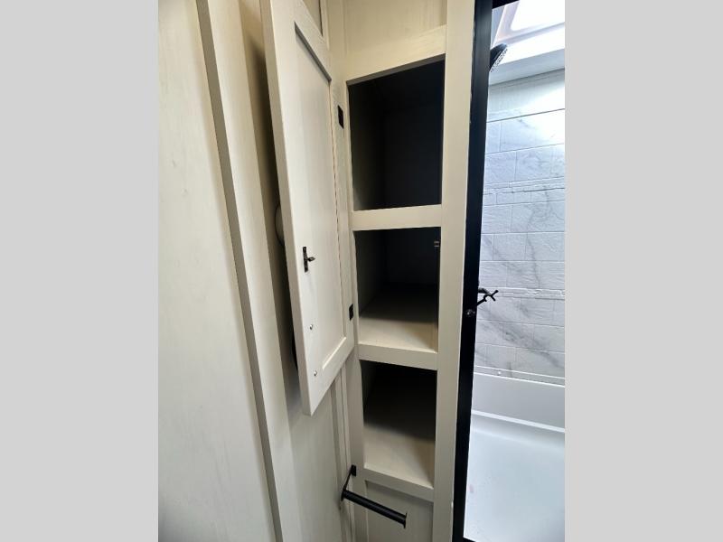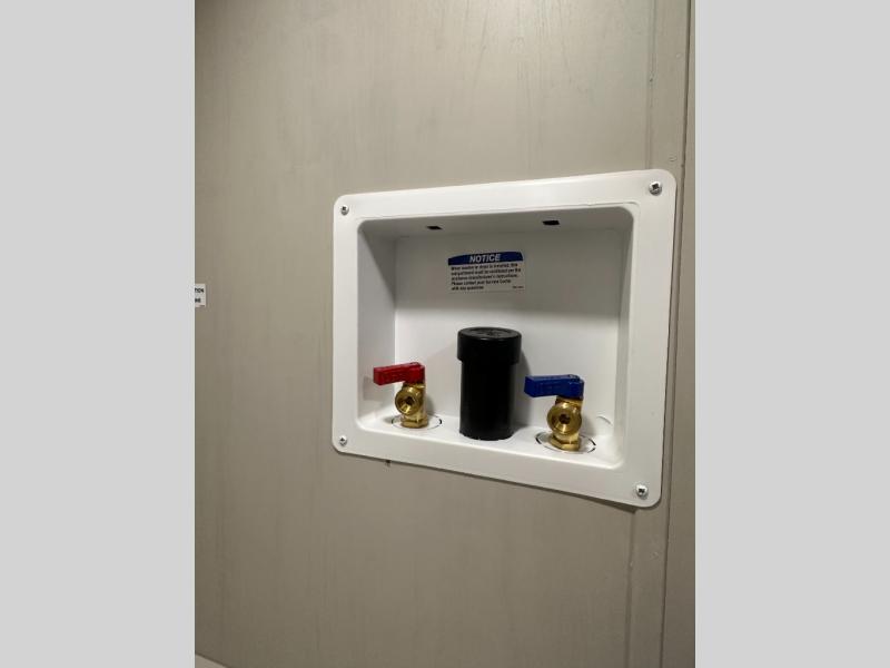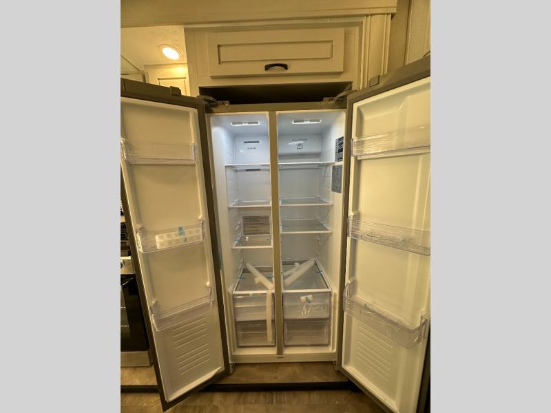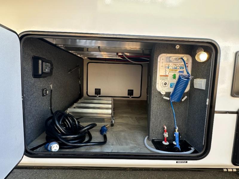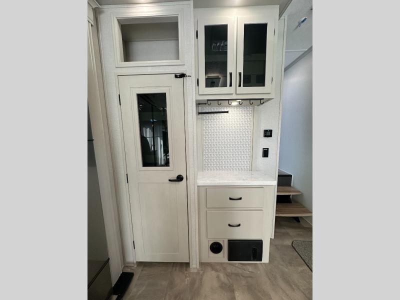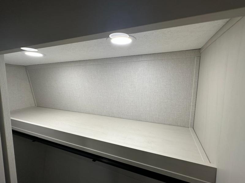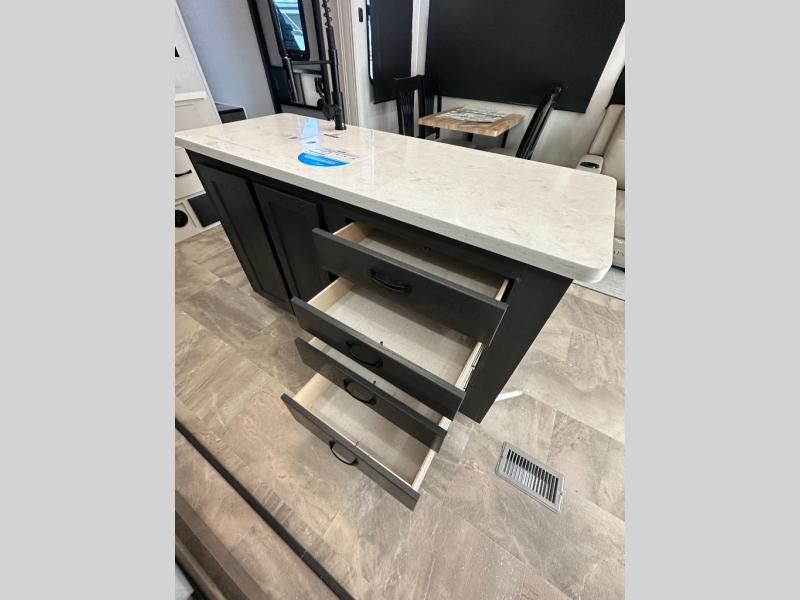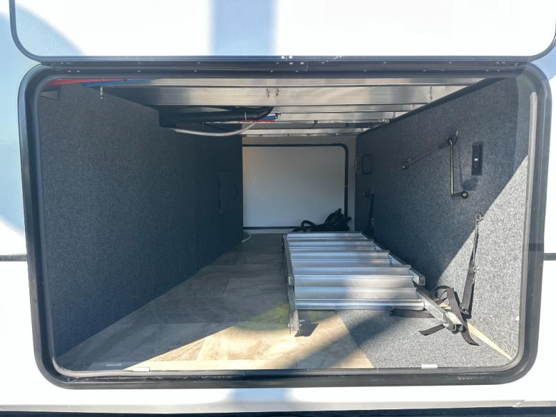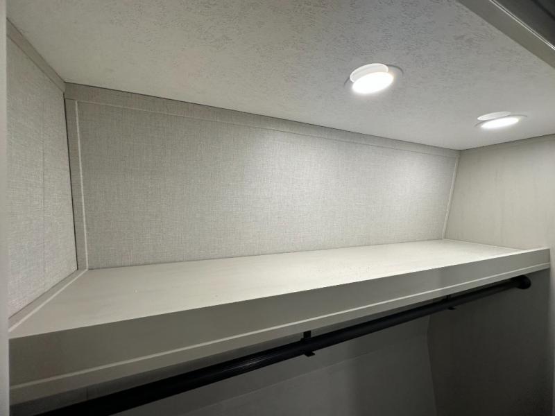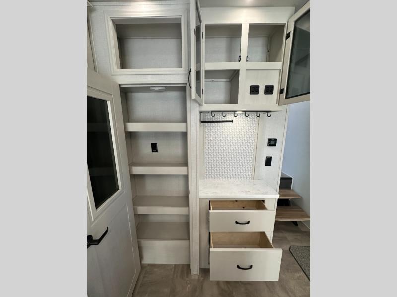 Bedroom: Front king bed slide-out, under-bed storage, full wardrobe, dresser, plus washer/dryer prep closet