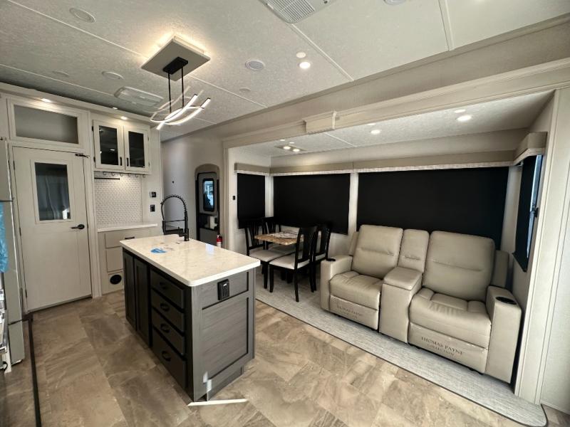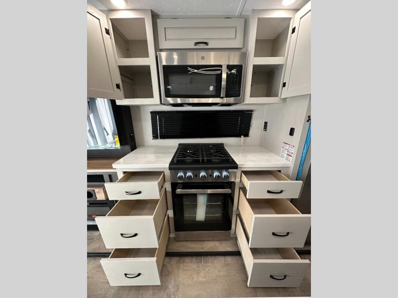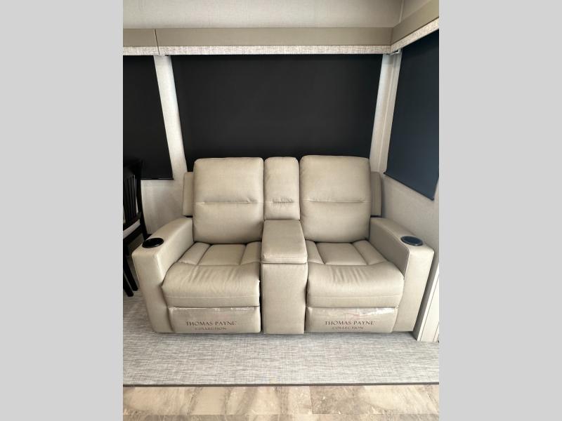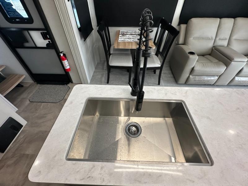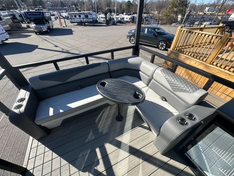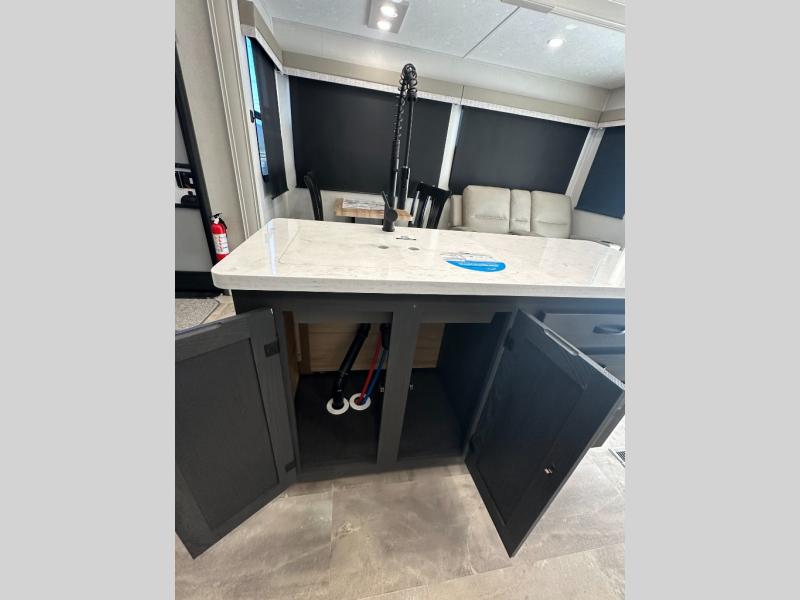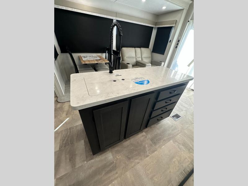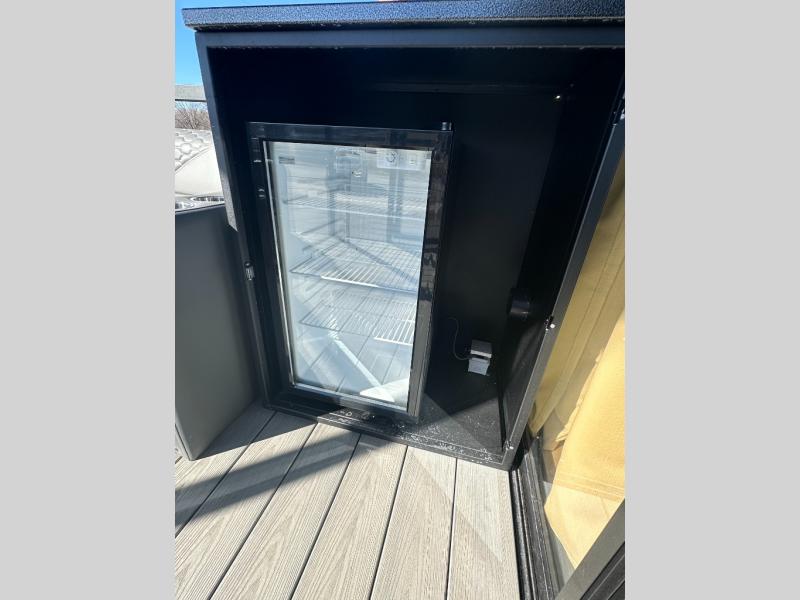The standout feature of this model is the rear pontoon deck—a marine-grade lounging area Coachmen dubs “the first-ever rear pontoon in a fifth-wheel.” It includes: