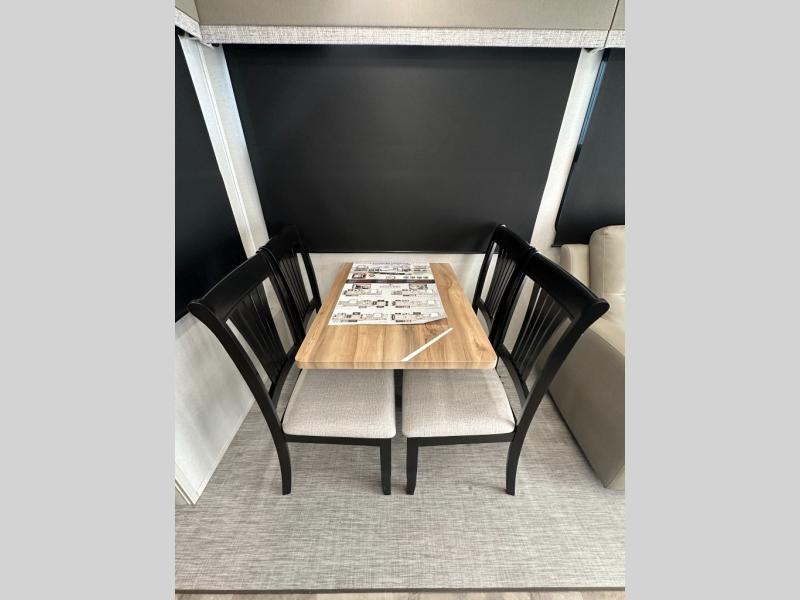 Living Area: Theater seating facing a smart TV with soundbar and a fireplace. A free-standing dinette with hidden storage is adjacent