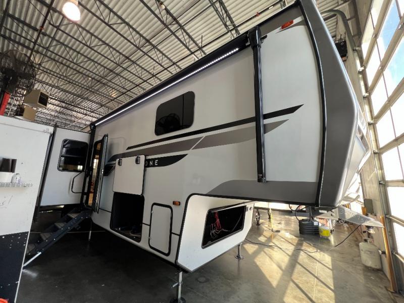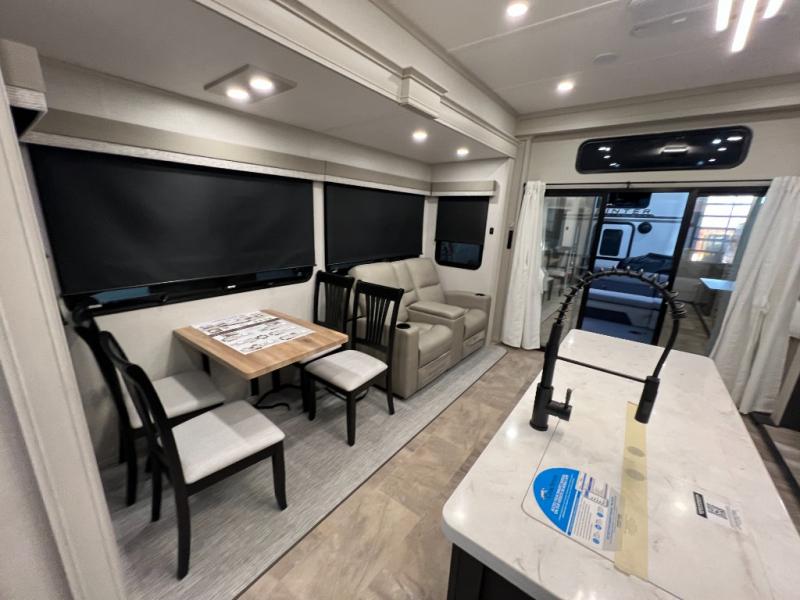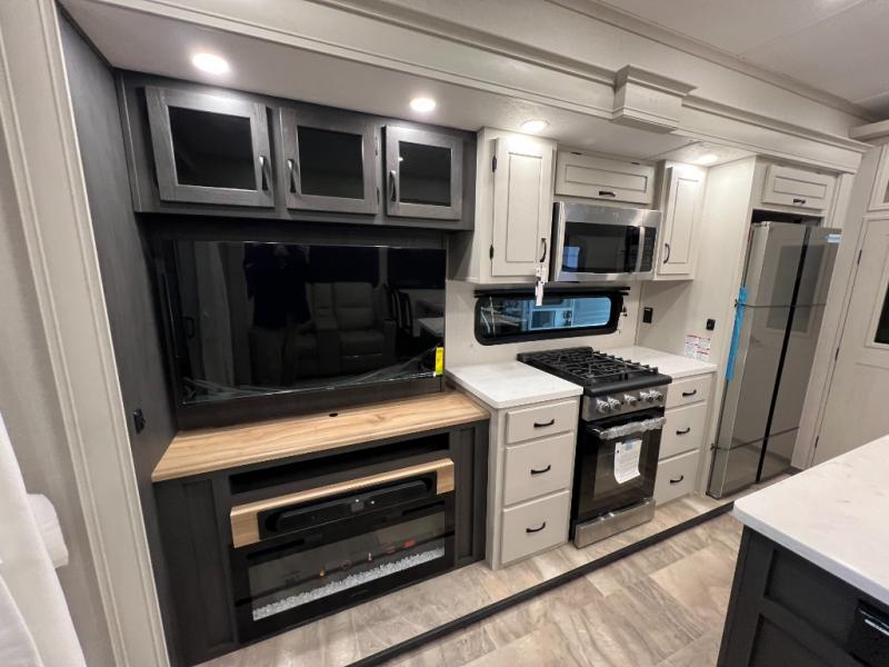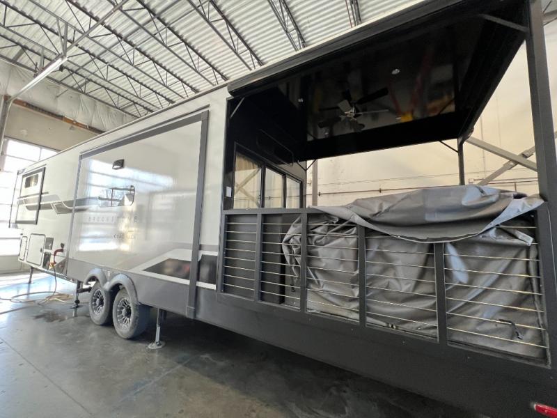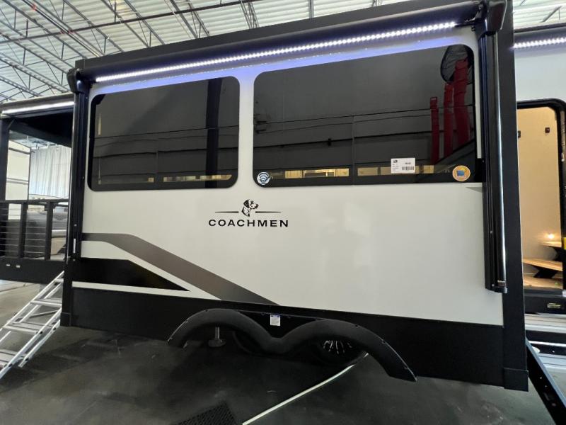 The Brookstone fifth wheels by Coachmen are coming to you with wide-body comfort, home-like amenities, and unique designs for a truly luxurious RV. The Weather Shield+ consists of a 6X double Azdel aluminum cage sidewall system, a Radiant Pro weather barrier system, and more that will help you extend your camping season or go full-time. Head inside to find solid surface countertops in the kitchen, an 4K Smart LED TV in the living room, slow rise roller night shades, and the list of comforts goes on! The Brookstone also includes 6-point electric auto-leveling, four Solid Step entry steps, an electric awning with LED lights, and many more exterior conveniences!