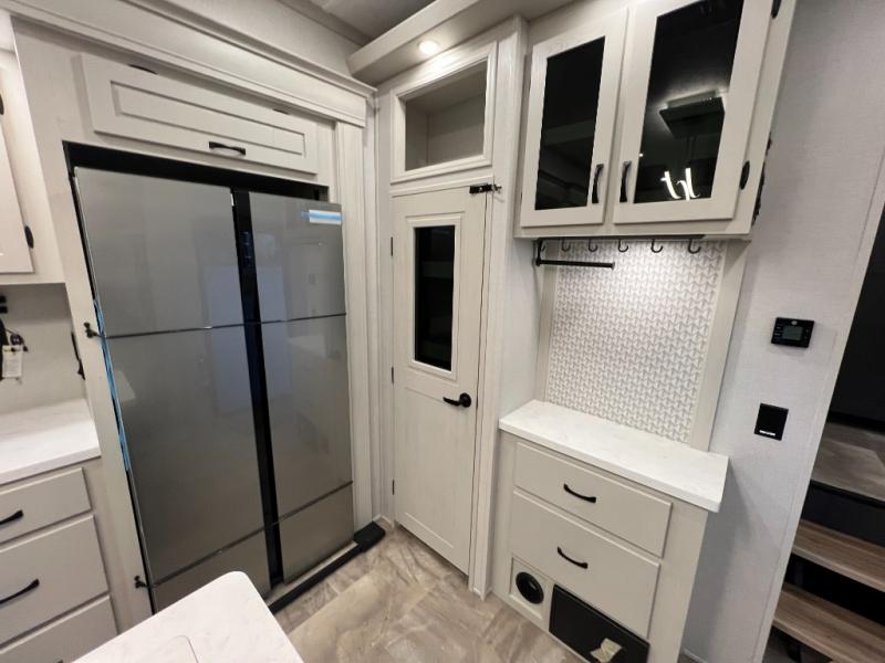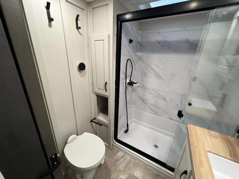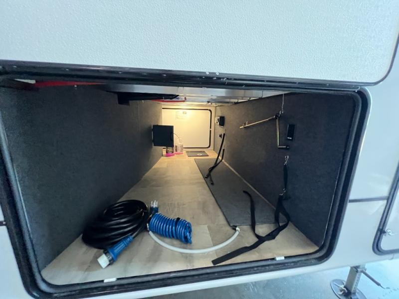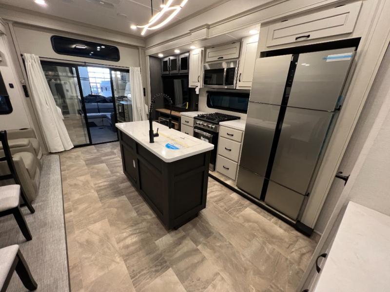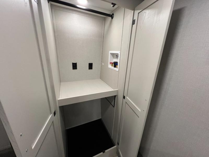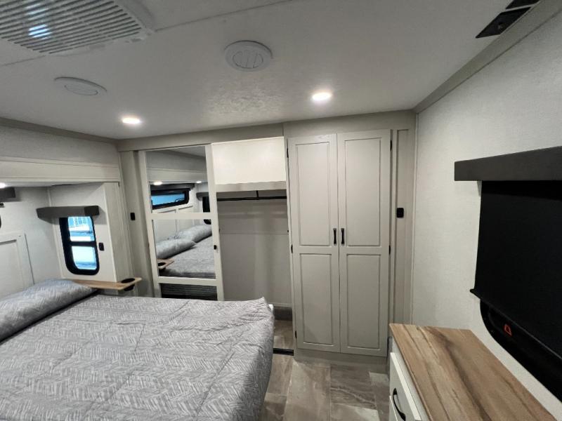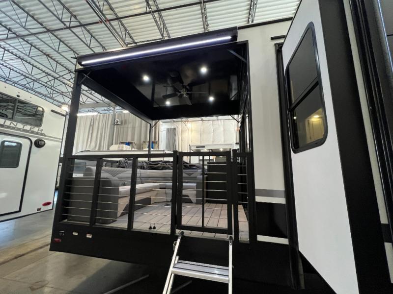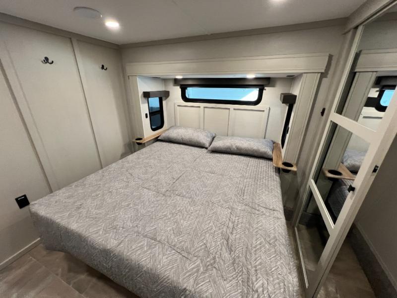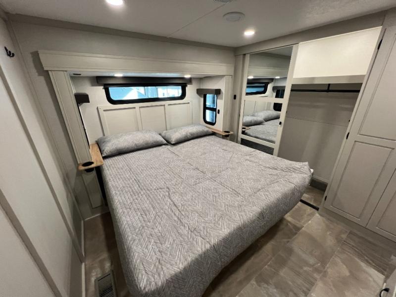 Step outside and enjoy the fresh air on our covered patio, complete with a refrigerator and optional L-shaped sofa, which is the perfect place to relax and unwind after a long day of adventure. Inside, the kitchen/living room area will make you feel an at-home experience, featuring overhead cabinets, an entertainment center, theater seating, a free-spanning table, a kitchen island, a microwave, a refrigerator, and a pantry. Perfect for cooking up a storm, entertaining friends and family, or simply relaxing and enjoying the comforts of home. The full bathroom is a spacious oasis, complete with a shower with a seat, a linen closet, and more. Plus, with a front bedroom featuring a king bed, dresser, washer and dryer prep, and a large wardrobe, you'll have the perfect place to rest and recharge after a long day of adventure. With two entry/exit doors and a massive 20’ awning, you'll have easy access to the RV and plenty of shade and protection from the weather.