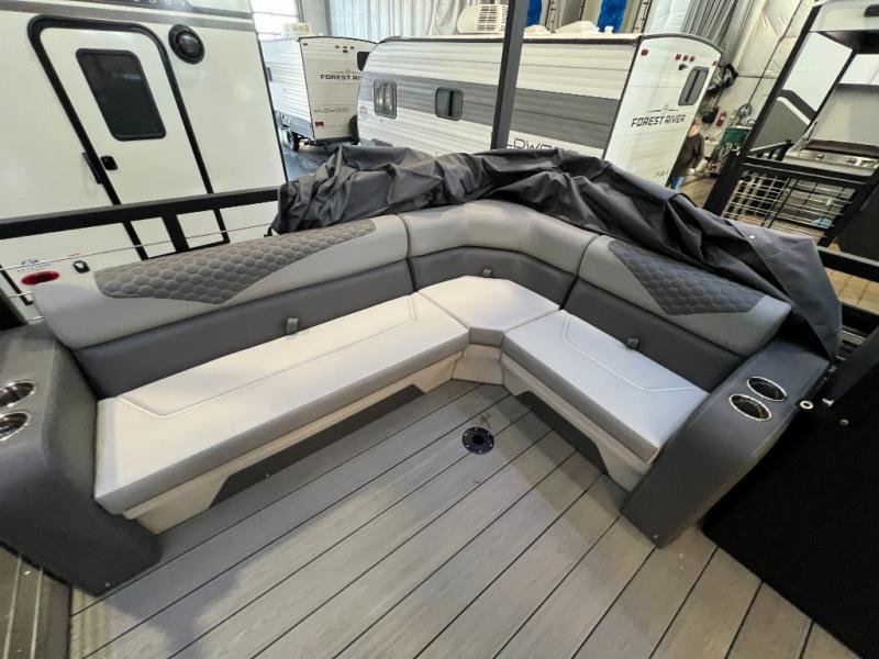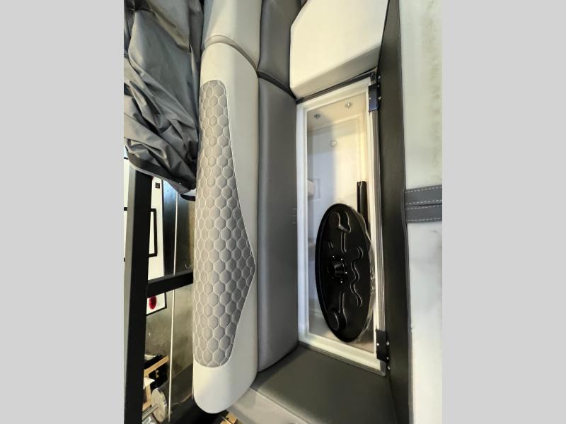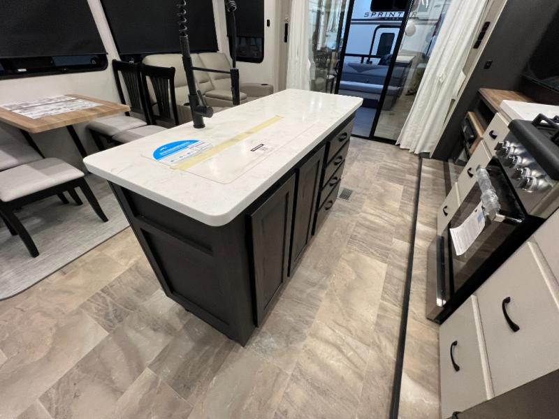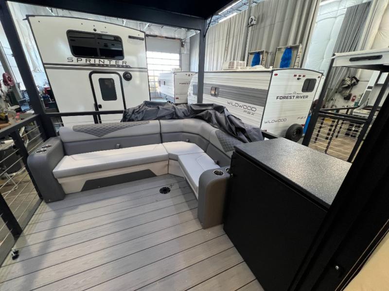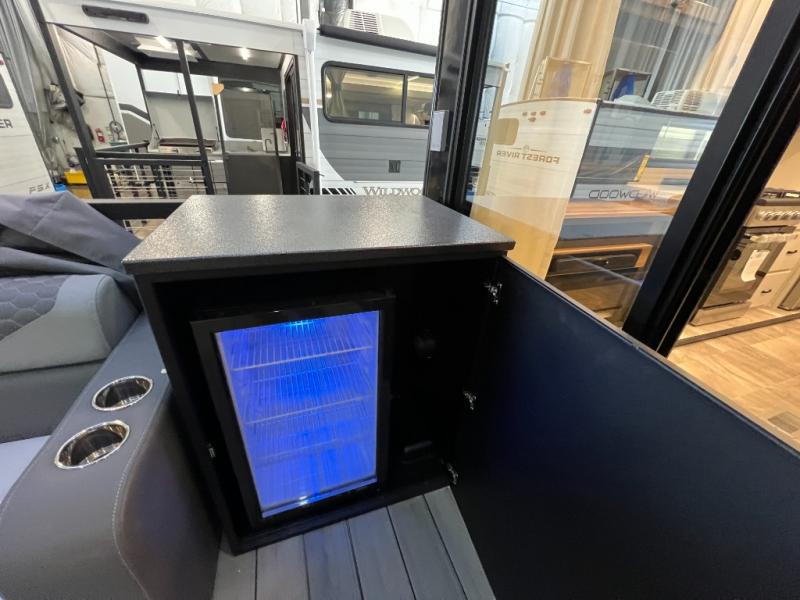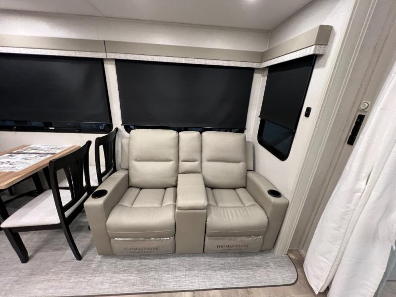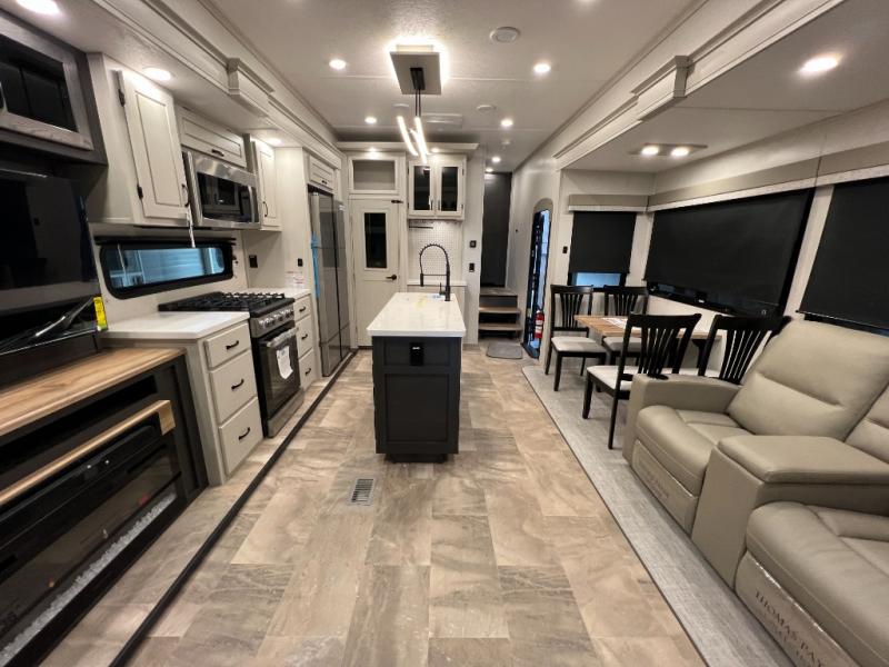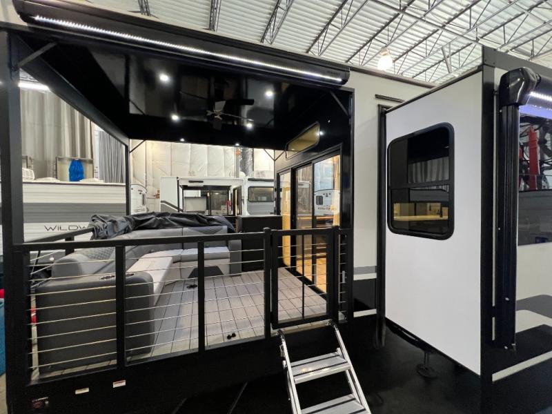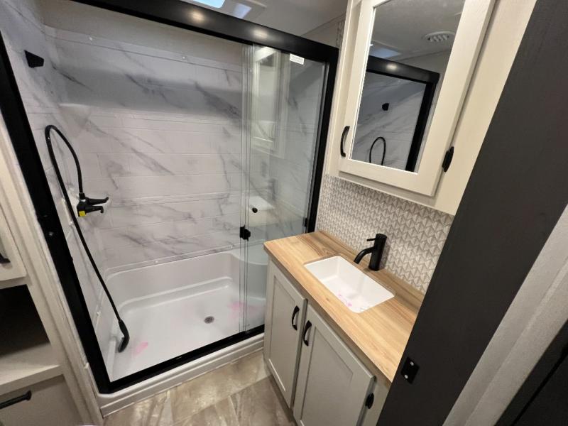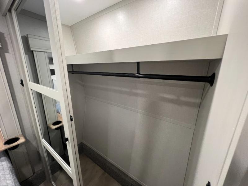 Step outside and enjoy the fresh air on our covered patio, complete with a refrigerator and optional L-shaped sofa, which is the perfect place to relax and unwind after a long day of adventure. Inside, the kitchen/living room area will make you feel an at-home experience, featuring overhead cabinets, an entertainment center, theater seating, a free-spanning table, a kitchen island, a microwave, a refrigerator, and a pantry. Perfect for cooking up a storm, entertaining friends and family, or simply relaxing and enjoying the comforts of home. The full bathroom is a spacious oasis, complete with a shower with a seat, a linen closet, and more. Plus, with a front bedroom featuring a king bed, dresser, washer and dryer prep, and a large wardrobe, you'll have the perfect place to rest and recharge after a long day of adventure. With two entry/exit doors and a massive 20’ awning, you'll have easy access to the RV and plenty of shade and protection from the weather.
