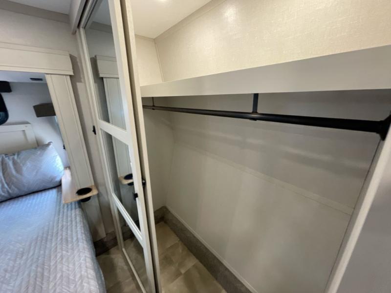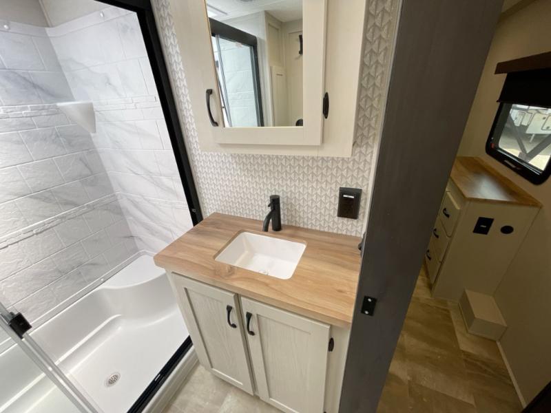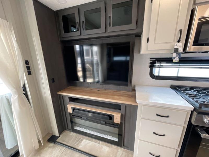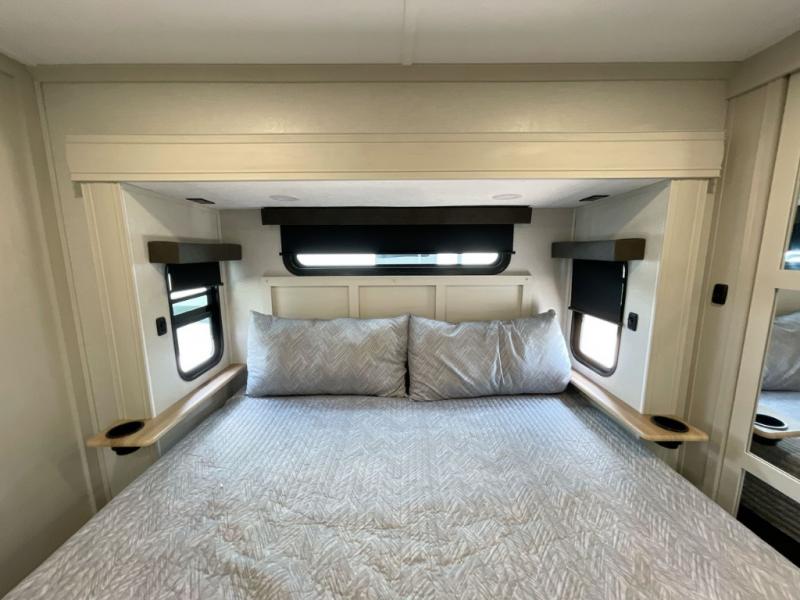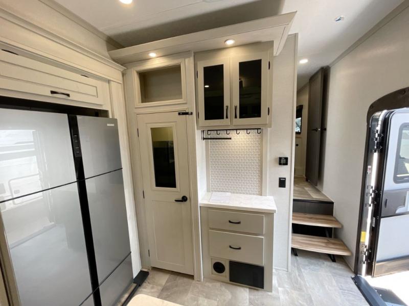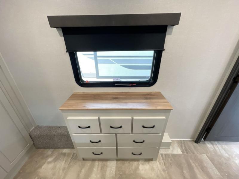 Step outside and enjoy the fresh air on our covered patio, complete with a refrigerator and optional L-shaped sofa, which is the perfect place to relax and unwind after a long day of adventure. Inside, the kitchen/living room area will make you feel an at-home experience, featuring overhead cabinets, an entertainment center, theater seating, a free-spanning table, a kitchen island, a microwave, a refrigerator, and a pantry. Perfect for cooking up a storm, entertaining friends and family, or simply relaxing and enjoying the comforts of home. The full bathroom is a spacious oasis, complete with a shower with a seat, a linen closet, and more. Plus, with a front bedroom featuring a king bed, dresser, washer and dryer prep, and a large wardrobe, you'll have the perfect place to rest and recharge after a long day of adventure. With two entry/exit doors and a massive 20’ awning, you'll have easy access to the RV and plenty of shade and protection from the weather.