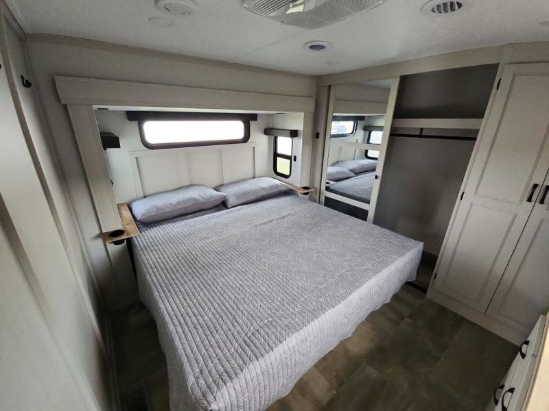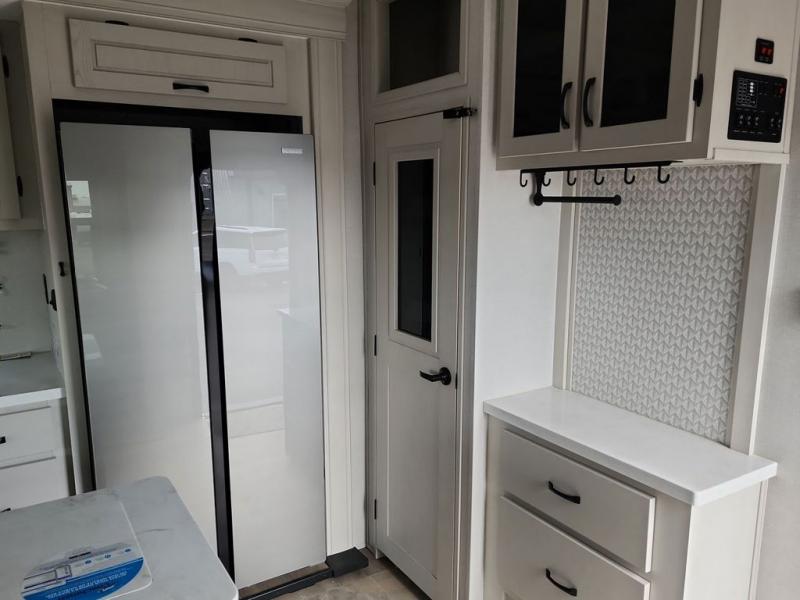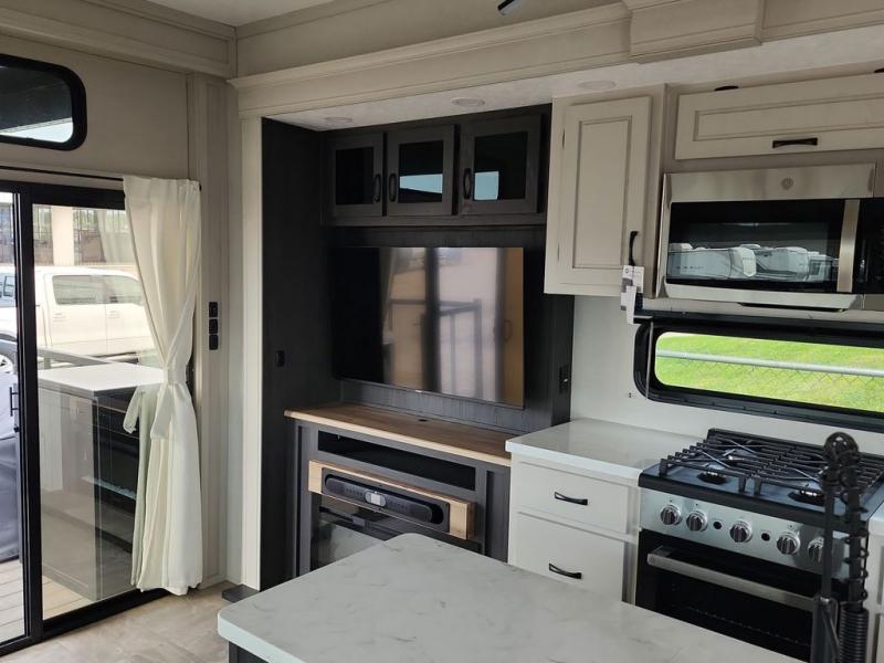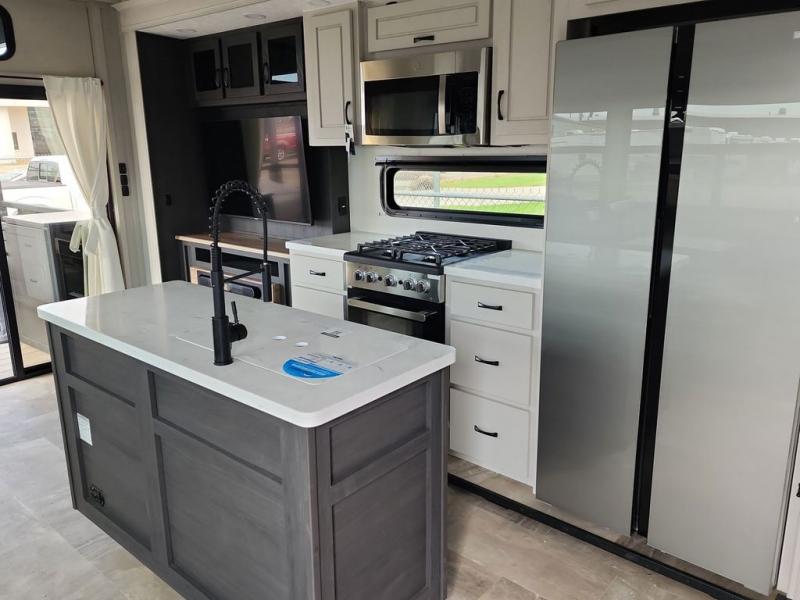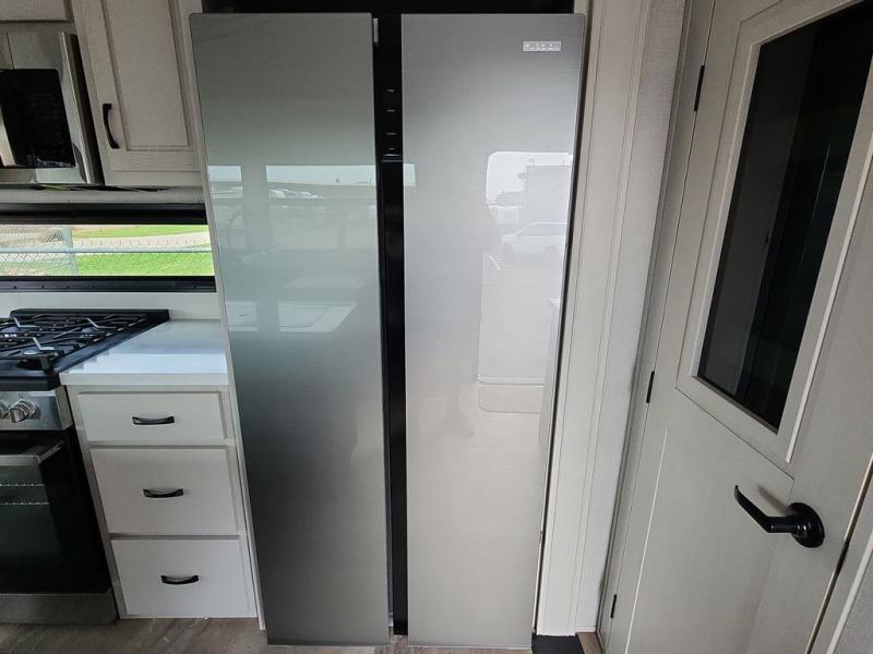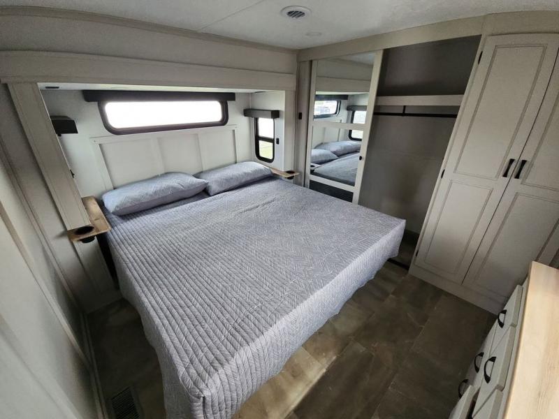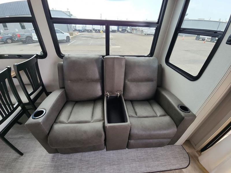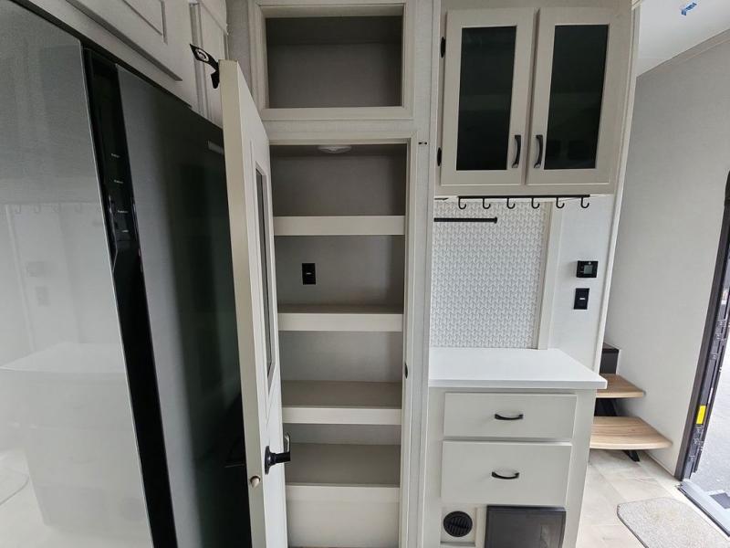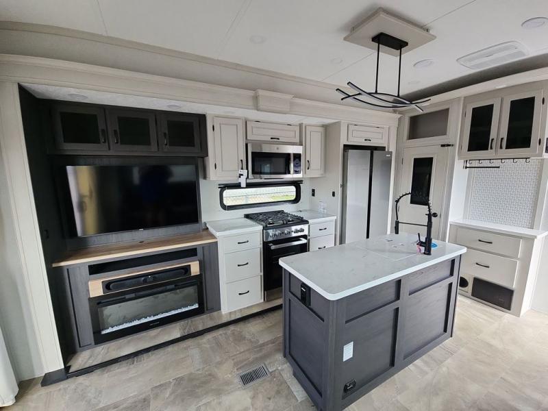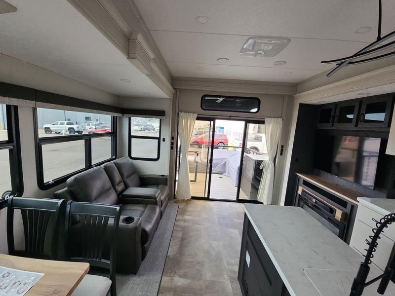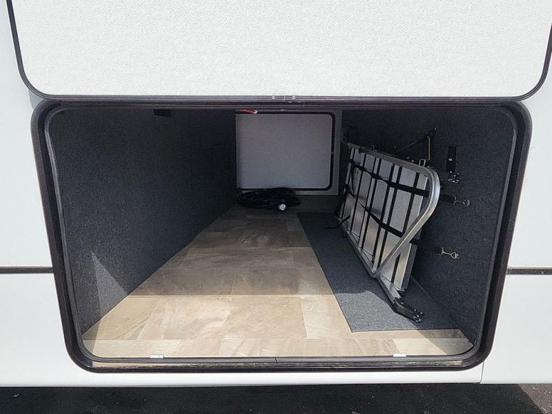 Step outside and enjoy the fresh air on our covered patio, complete with a refrigerator and optional L-shaped sofa, which is the perfect place to relax and unwind after a long day of adventure. Inside, the kitchen/living room area will make you feel an at-home experience, featuring overhead cabinets, an entertainment center, theater seating, a free-spanning table, a kitchen island, a microwave, a refrigerator, and a pantry. Perfect for cooking up a storm, entertaining friends and family, or simply relaxing and enjoying the comforts of home. The full bathroom is a spacious oasis, complete with a shower with a seat, a linen closet, and more. Plus, with a front bedroom featuring a king bed, dresser, washer and dryer prep, and a large wardrobe, you'll have the perfect place to rest and recharge after a long day of adventure. With two entry/exit doors and a massive 20’ awning, you'll have easy access to the RV and plenty of shade and protection from the weather.