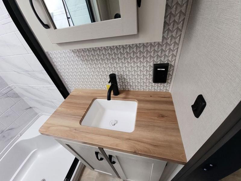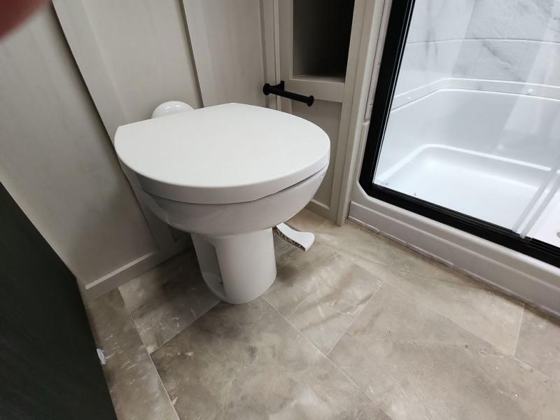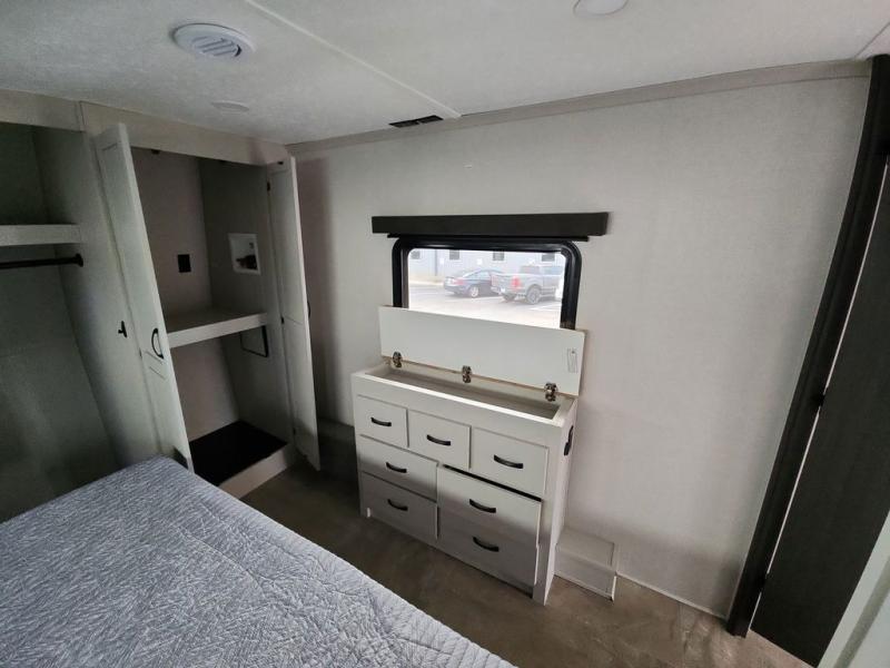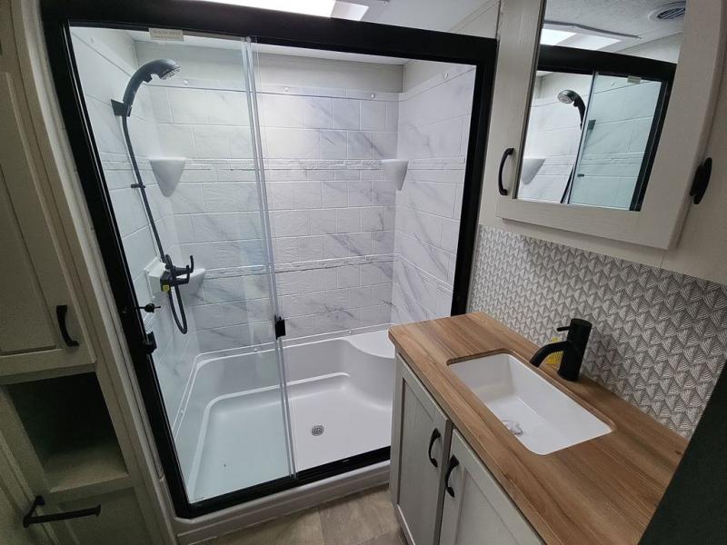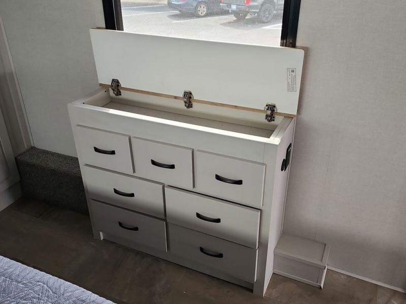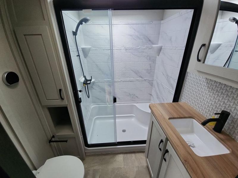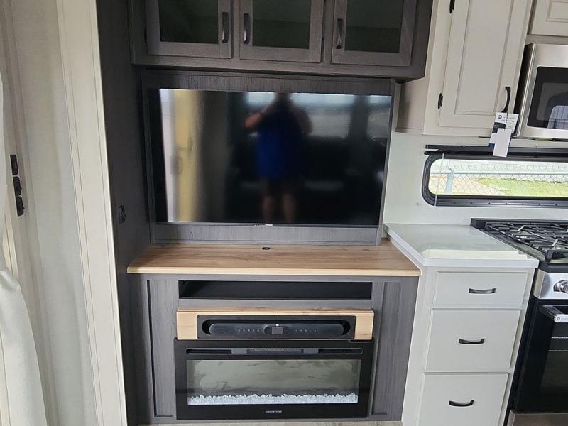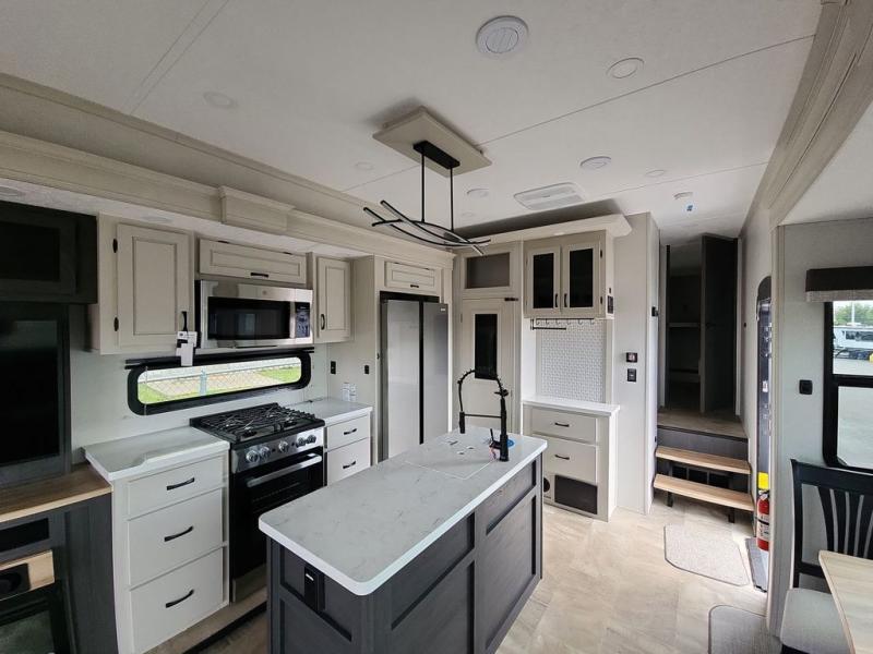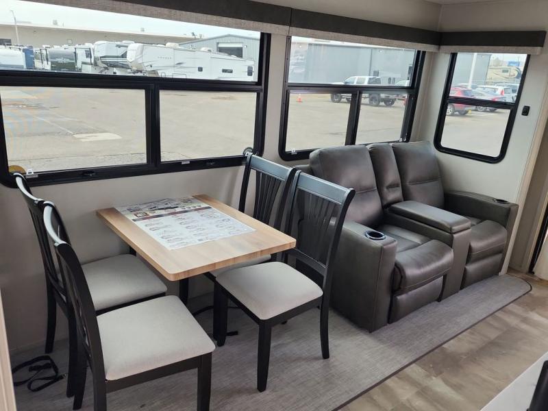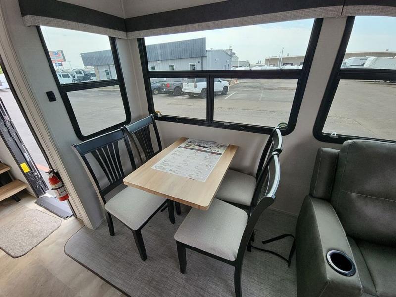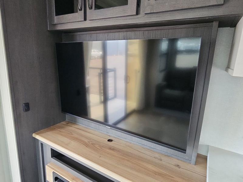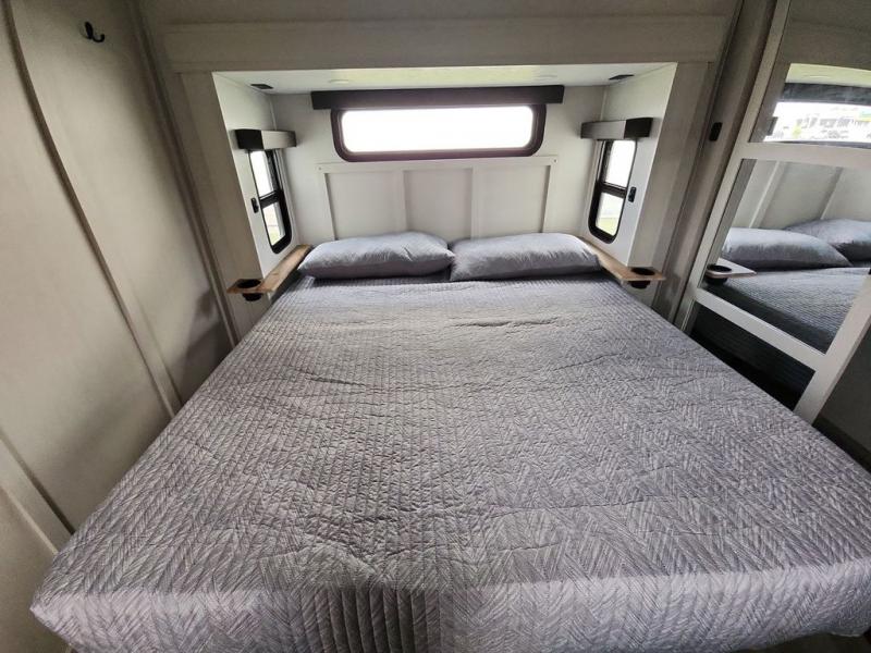 Step outside and enjoy the fresh air on our covered patio, complete with a refrigerator and optional L-shaped sofa, which is the perfect place to relax and unwind after a long day of adventure. Inside, the kitchen/living room area will make you feel an at-home experience, featuring overhead cabinets, an entertainment center, theater seating, a free-spanning table, a kitchen island, a microwave, a refrigerator, and a pantry. Perfect for cooking up a storm, entertaining friends and family, or simply relaxing and enjoying the comforts of home. The full bathroom is a spacious oasis, complete with a shower with a seat, a linen closet, and more. Plus, with a front bedroom featuring a king bed, dresser, washer and dryer prep, and a large wardrobe, you'll have the perfect place to rest and recharge after a long day of adventure. With two entry/exit doors and a massive 20’ awning, you'll have easy access to the RV and plenty of shade and protection from the weather.