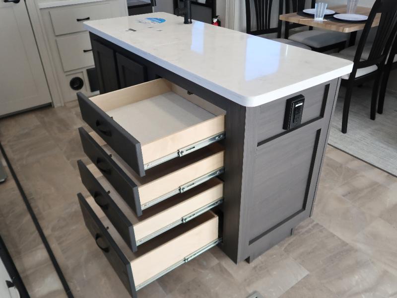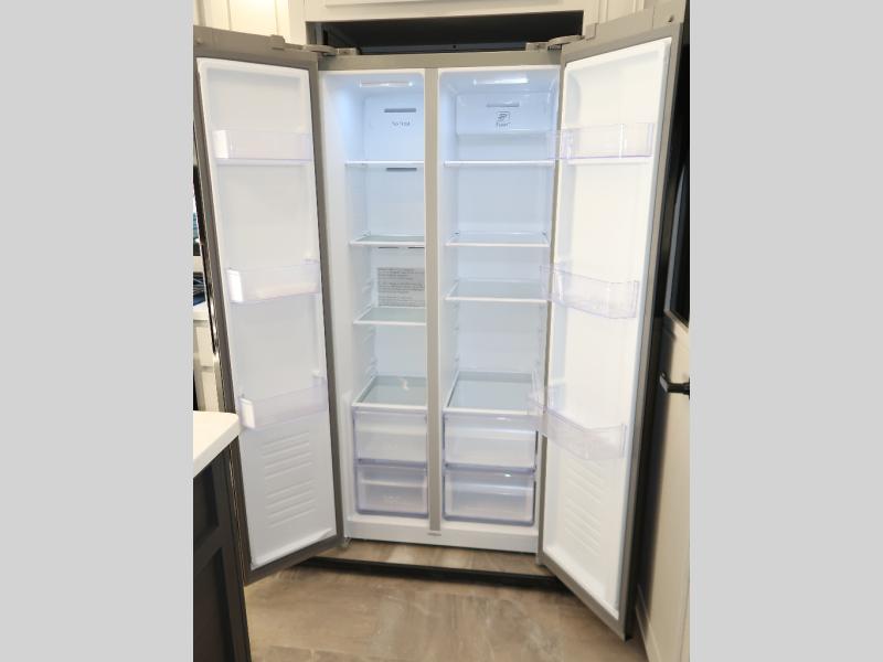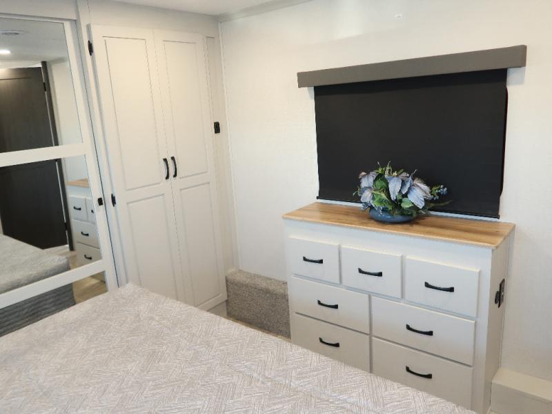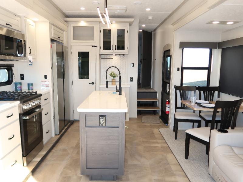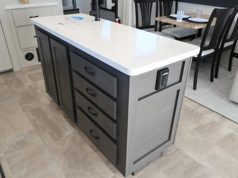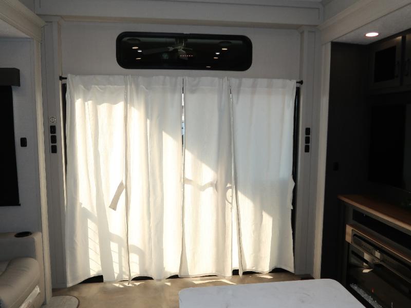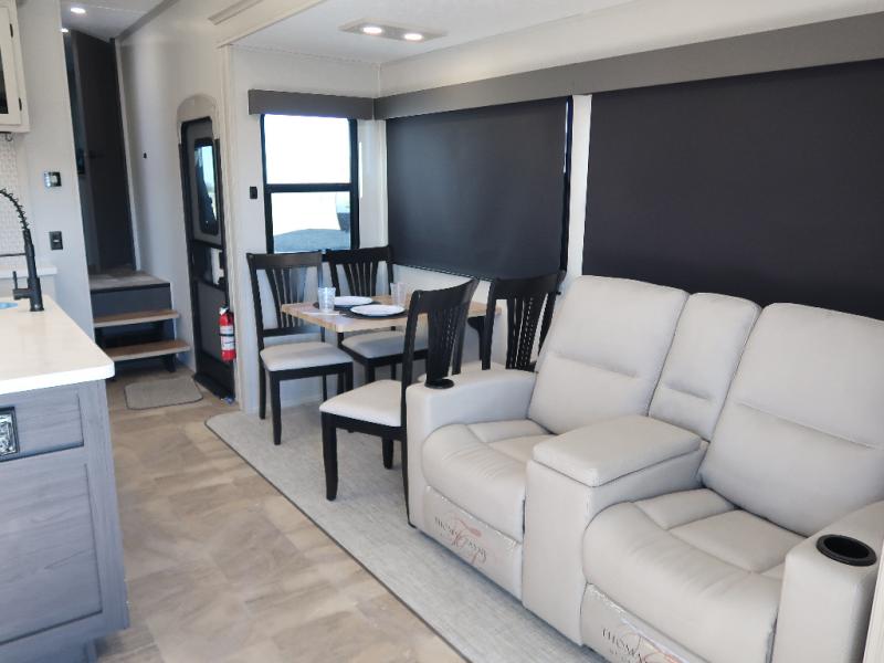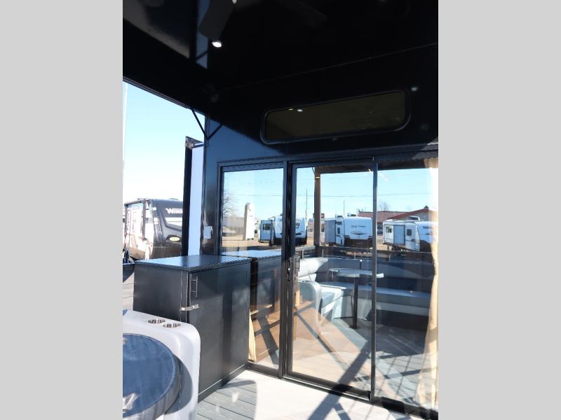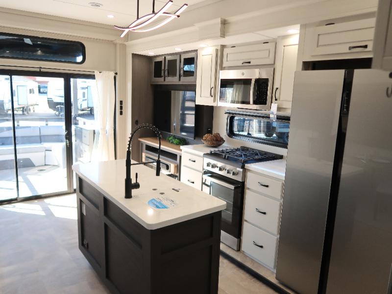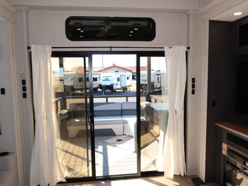 Step outside and enjoy the fresh air on our covered patio, complete with a refrigerator and optional L-shaped sofa, which is the perfect place to relax and unwind after a long day of adventure. Inside, the kitchen/living room area will make you feel an at-home experience, featuring overhead cabinets, an entertainment center, theater seating, a free-spanning table, a kitchen island, a microwave, a refrigerator, and a pantry. Perfect for cooking up a storm, entertaining friends and family, or simply relaxing and enjoying the comforts of home. The full bathroom is a spacious oasis, complete with a shower with a seat, a linen closet, and more. Plus, with a front bedroom featuring a king bed, dresser, washer and dryer prep, and a large wardrobe, you'll have the perfect place to rest and recharge after a long day of adventure. With two entry/exit doors and a massive 20’ awning, you'll have easy access to the RV and plenty of shade and protection from the weather.
