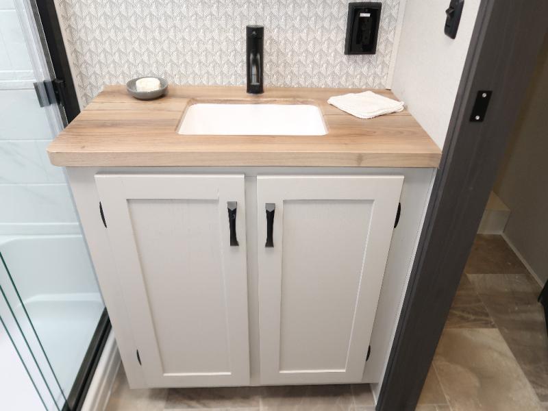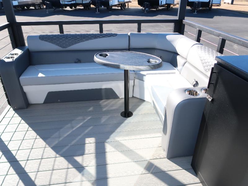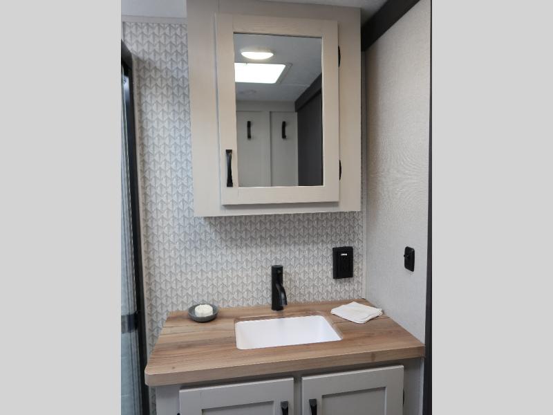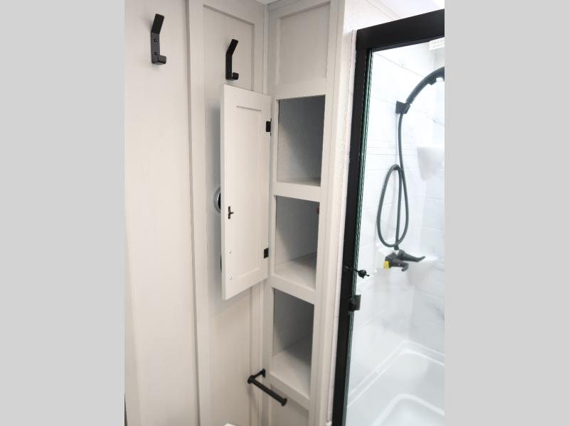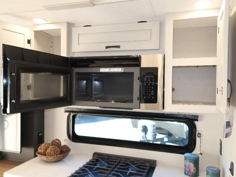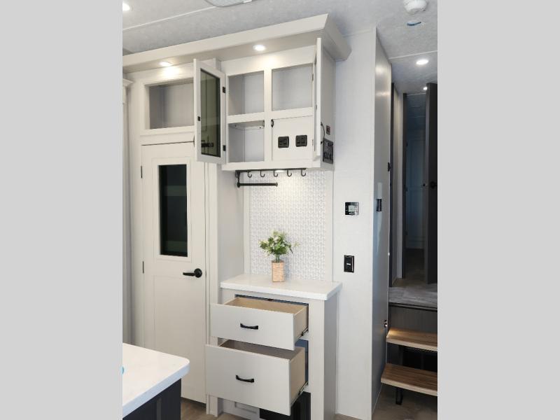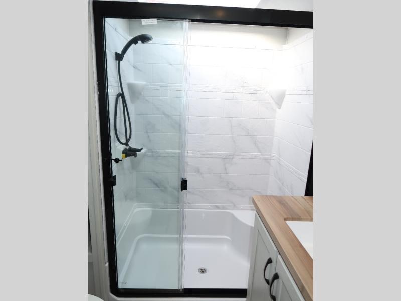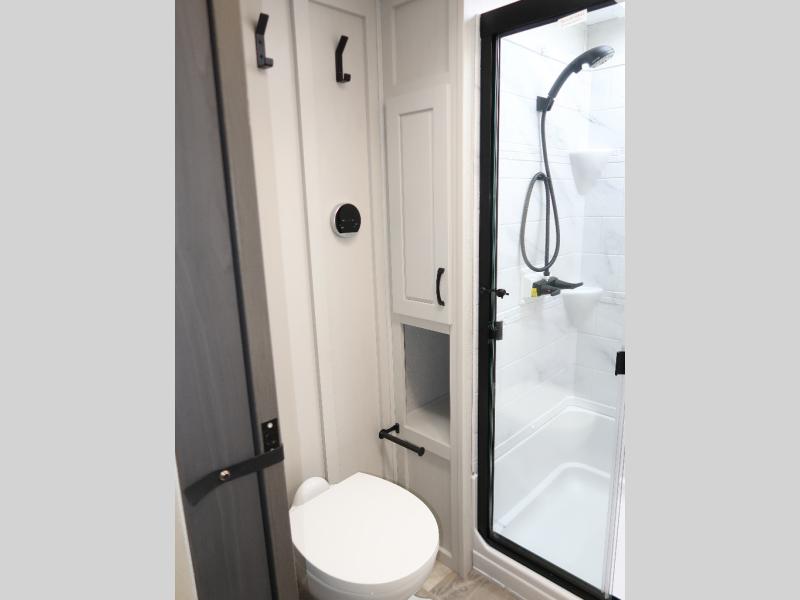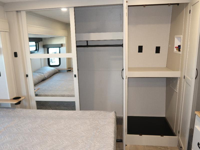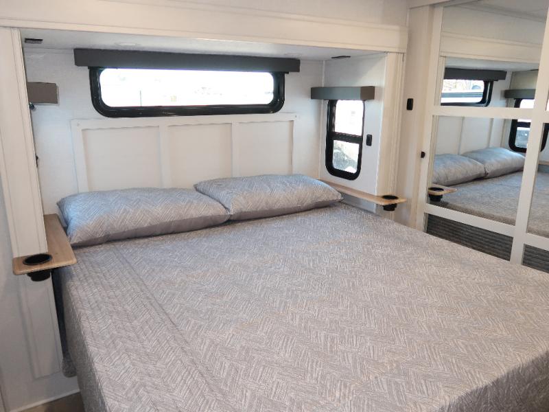 Step outside and enjoy the fresh air on our covered patio, complete with a refrigerator and optional L-shaped sofa, which is the perfect place to relax and unwind after a long day of adventure. Inside, the kitchen/living room area will make you feel an at-home experience, featuring overhead cabinets, an entertainment center, theater seating, a free-spanning table, a kitchen island, a microwave, a refrigerator, and a pantry. Perfect for cooking up a storm, entertaining friends and family, or simply relaxing and enjoying the comforts of home. The full bathroom is a spacious oasis, complete with a shower with a seat, a linen closet, and more. Plus, with a front bedroom featuring a king bed, dresser, washer and dryer prep, and a large wardrobe, you'll have the perfect place to rest and recharge after a long day of adventure. With two entry/exit doors and a massive 20’ awning, you'll have easy access to the RV and plenty of shade and protection from the weather.