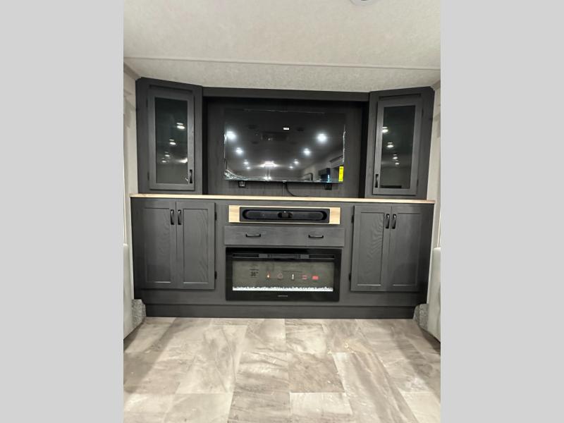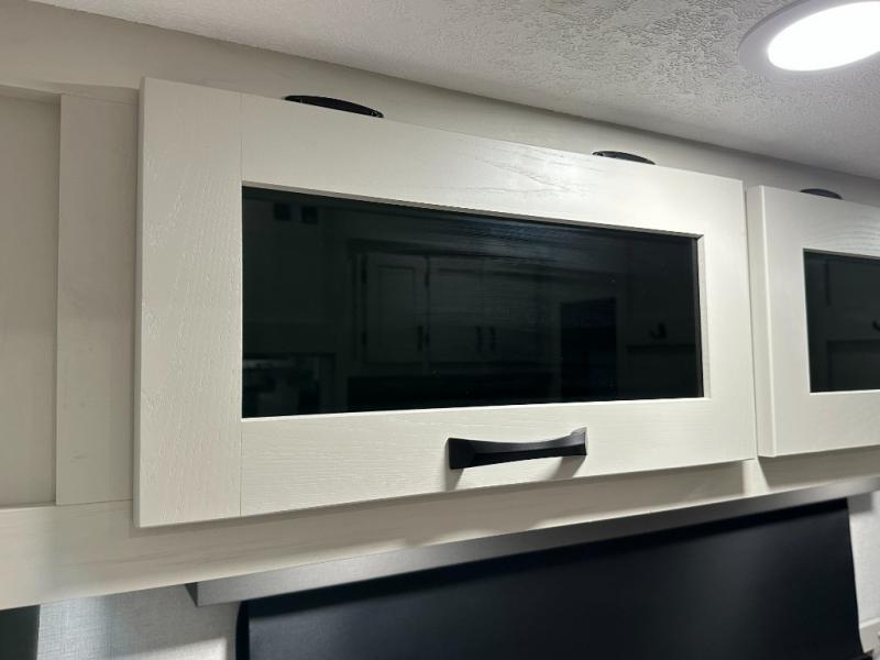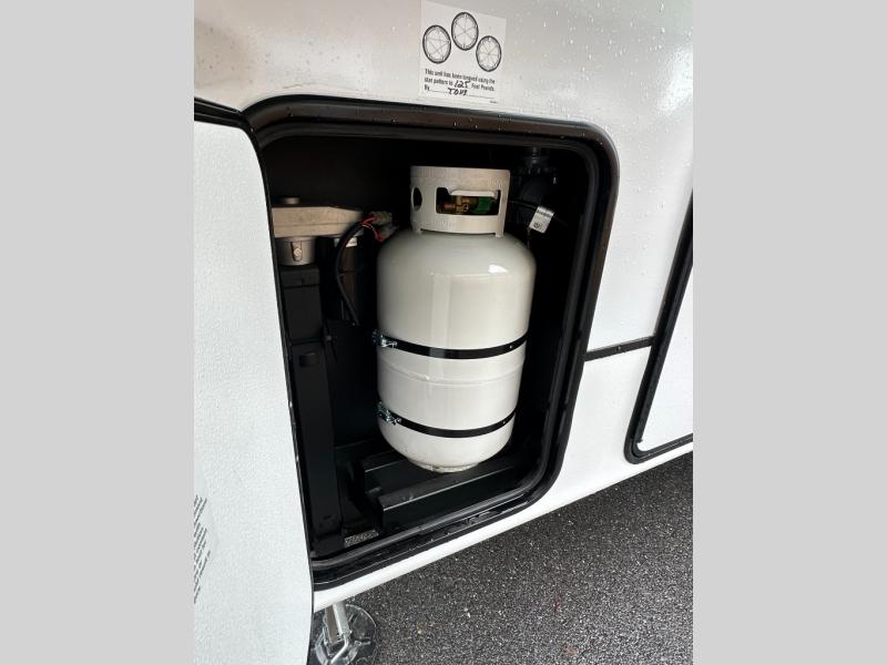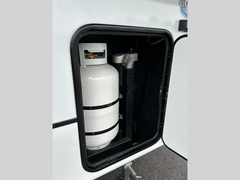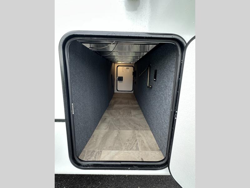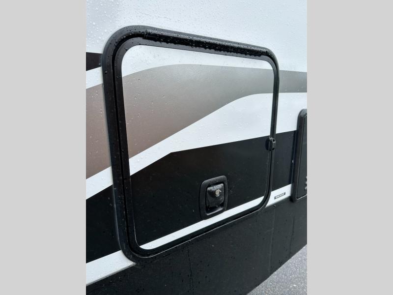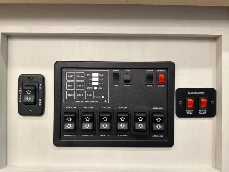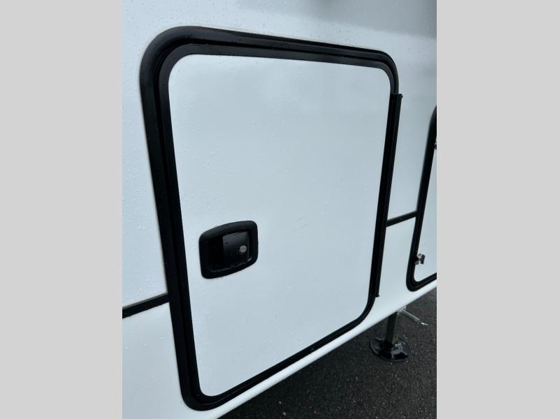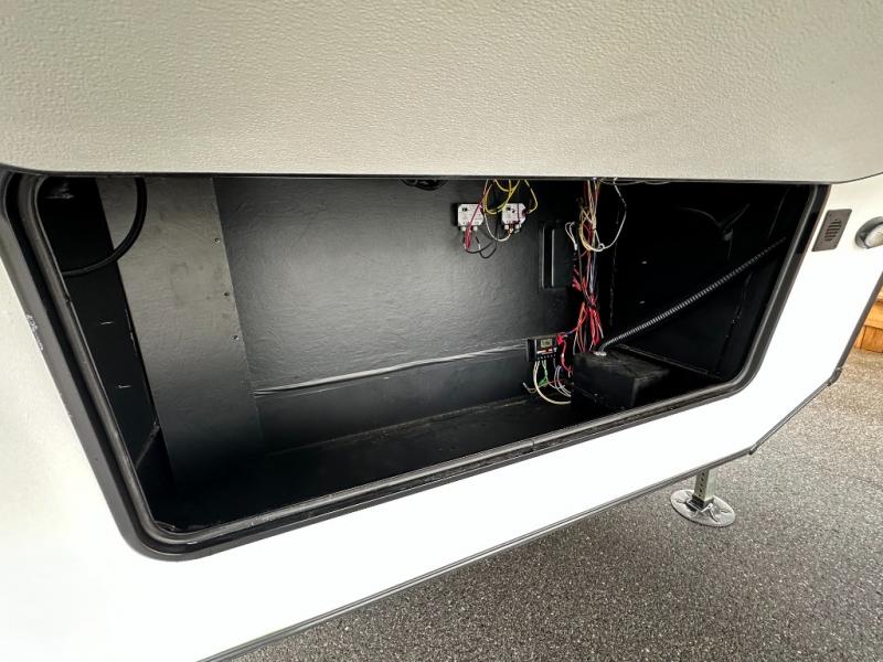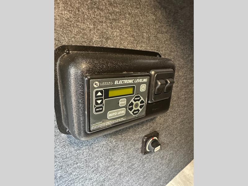 Exterior convenience features: auto-leveling (6-point electric), LED lighting (step, awning, under slide etc.), large pass-through storage, protective bumper, back-up/side-view camera prep.