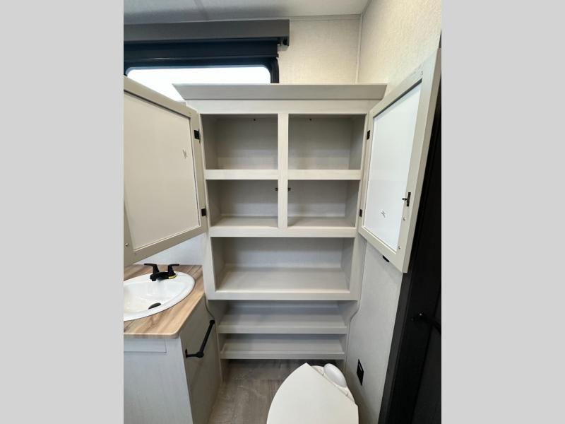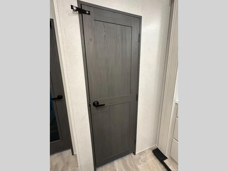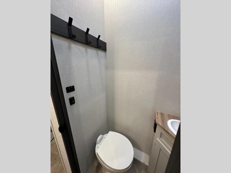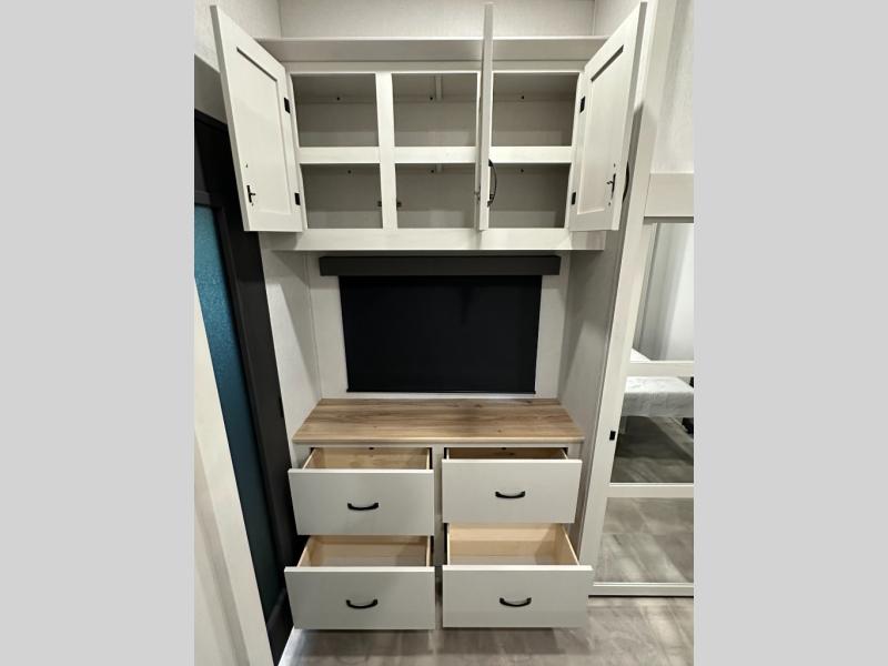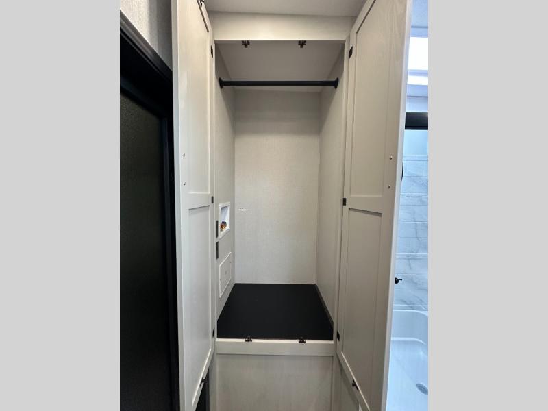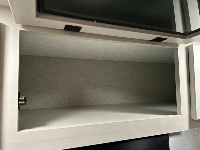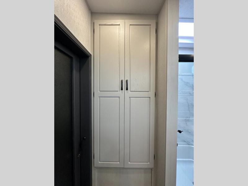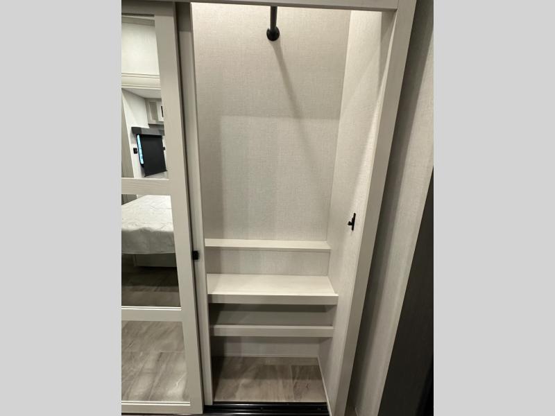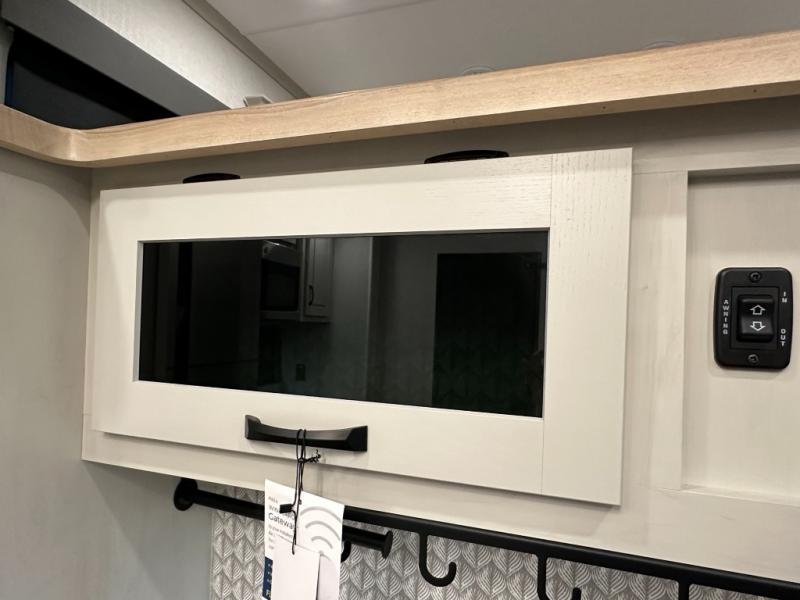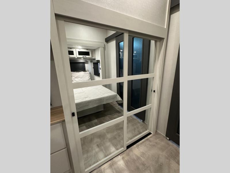 Exterior convenience features: auto-leveling (6-point electric), LED lighting (step, awning, under slide etc.), large pass-through storage, protective bumper, back-up/side-view camera prep.