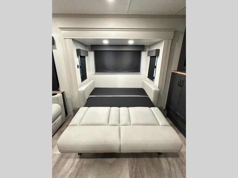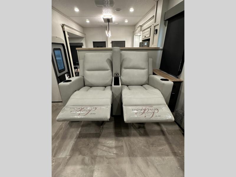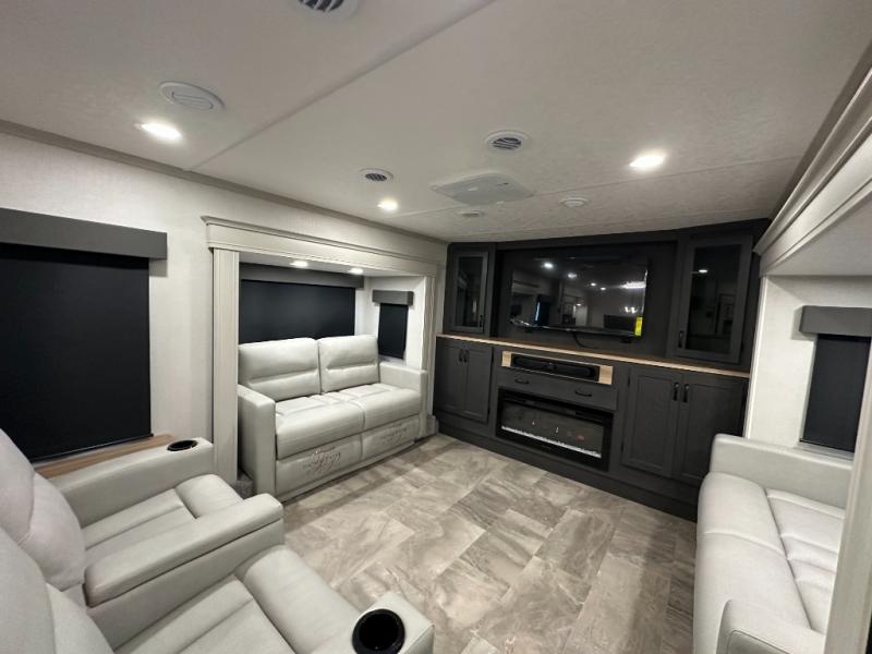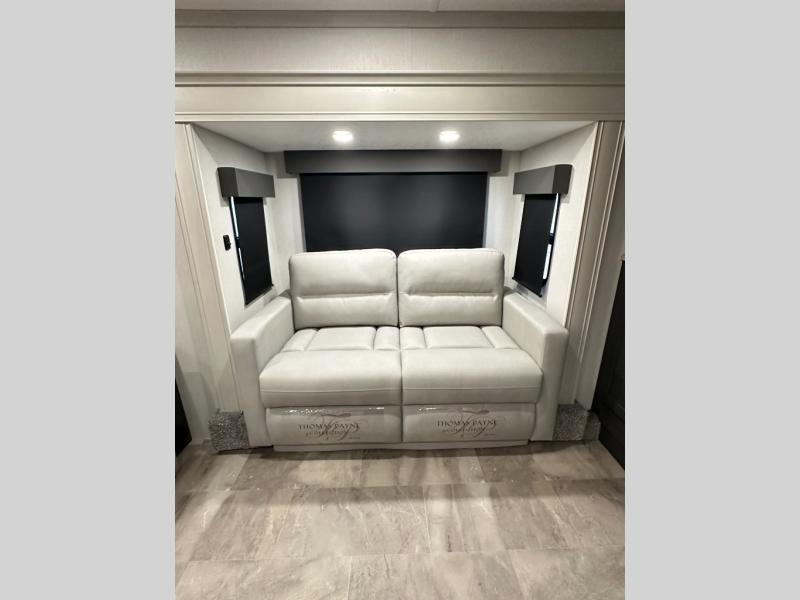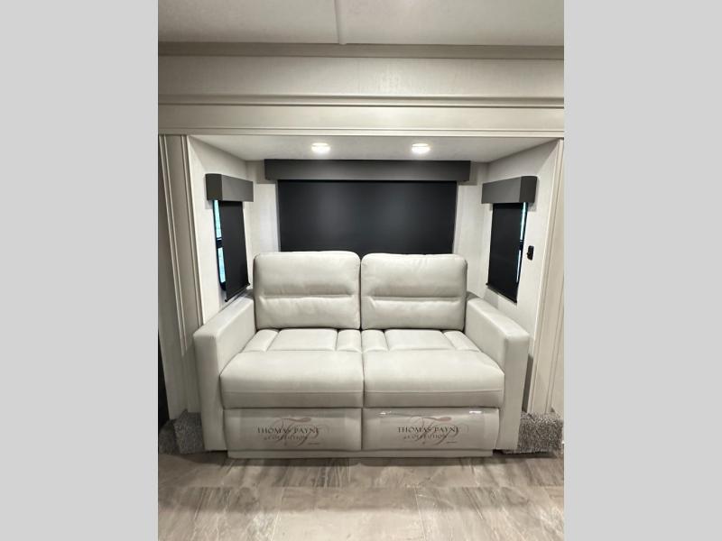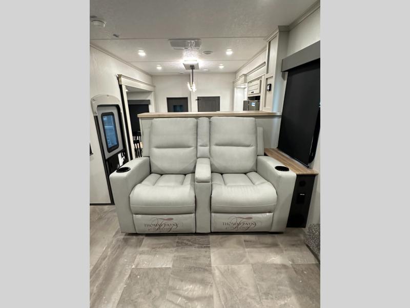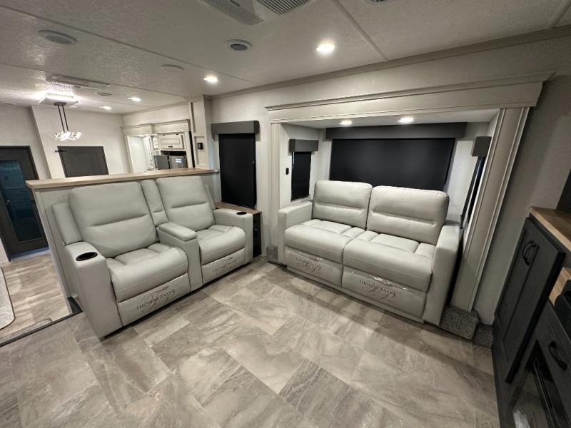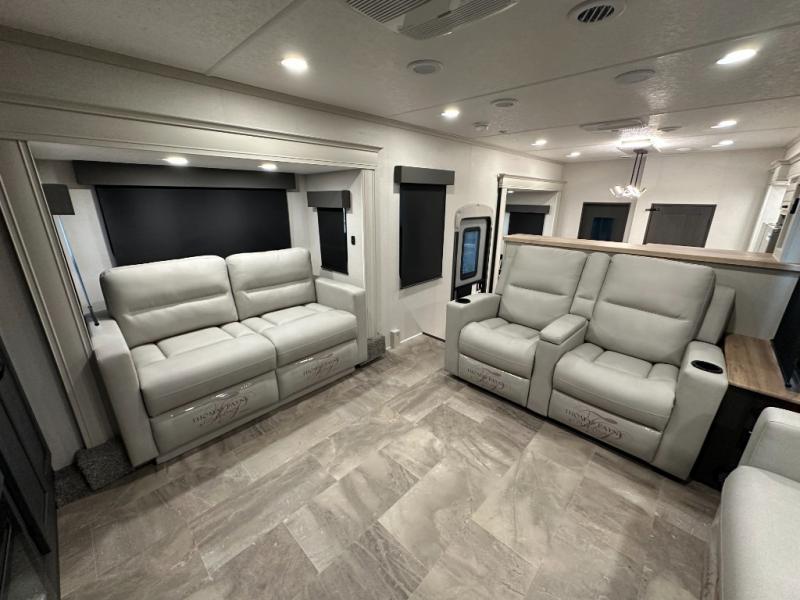 Interior luxuries: King bed, theatre seating, multiple sofas, kitchen island, high-end appliances (residential microwave, solid surface counters), upgraded lighting.