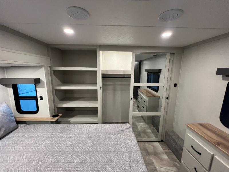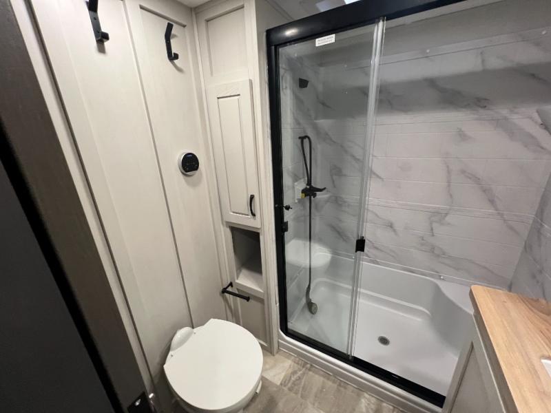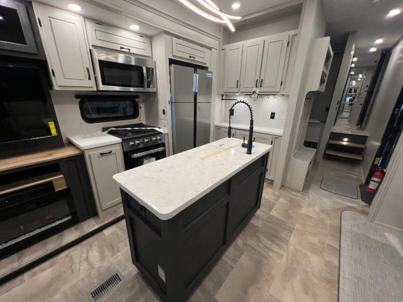 The rear living room is the perfect place to unwind, featuring a 78” trifold sofa, theater seating, overhead cabinets, and an entertainment center. Whether you're watching a movie, reading a book, or simply enjoying the company of loved ones, this room has everything you need to relax and recharge. The spacious kitchen is fitted with a kitchen island, refrigerator, microwave, free-standing table, hutch, and overhead cabinets. Perfect for preparing your favorite meals and enjoy with family. With a convenient coat bench, desk with flip-up storage, washer, and dryer, you'll have everything you need to stay organized and comfortable on the go. The full bathroom is an enormous oasis with a linen closet for added convenience. Also with a front bedroom featuring a king bed, dresser, shelves, and wardrobe, you'll have the perfect place to rest and recharge after a long day of adventure, also plenty of space for storing all your belongings and staying organized on the road.