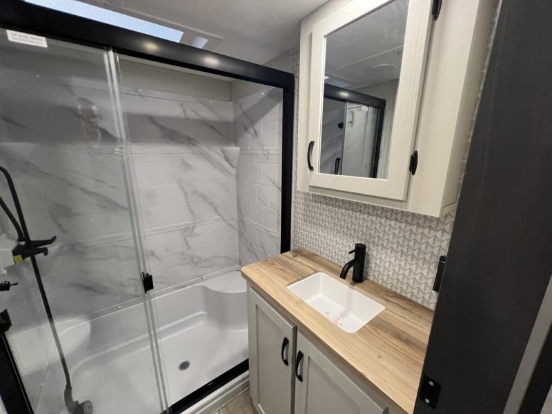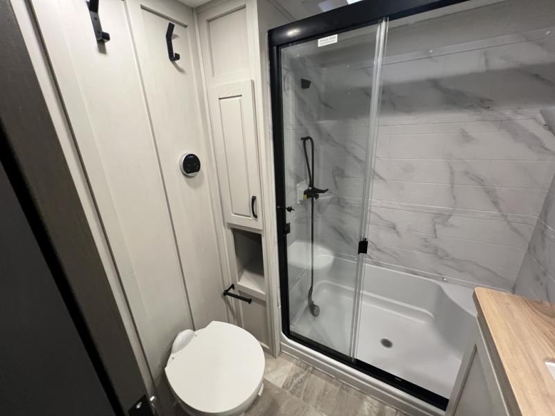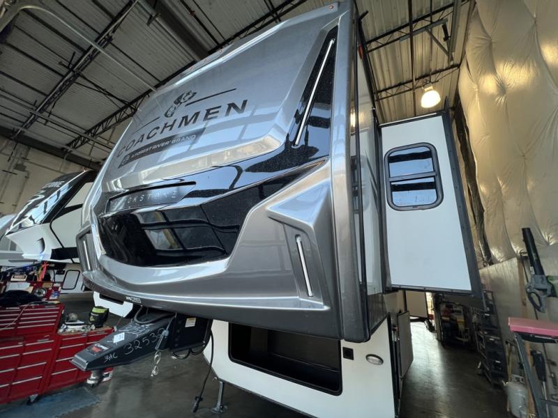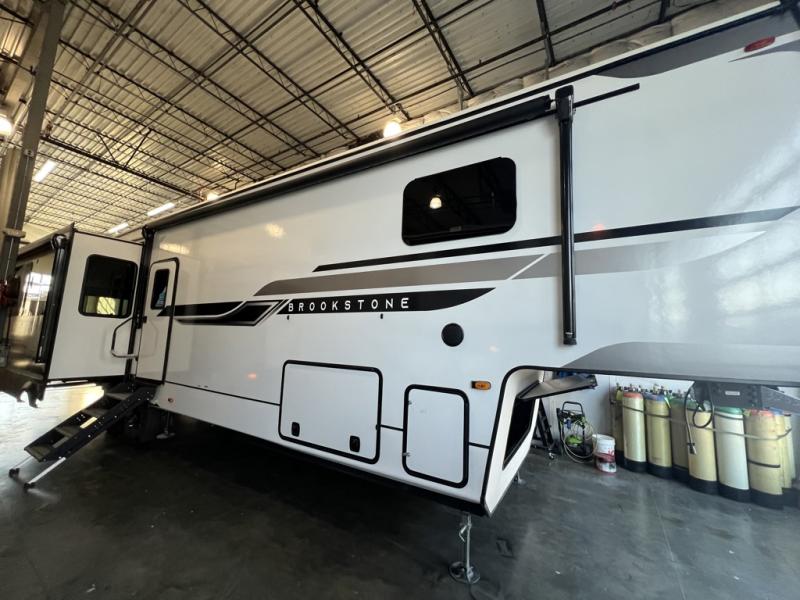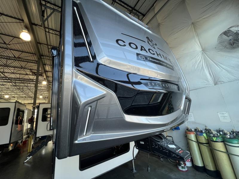 The Brookstone fifth wheels by Coachmen are coming to you with wide-body comfort, home-like amenities, and unique designs for a truly luxurious RV. The Weather Shield+ consists of a 6X double Azdel aluminum cage sidewall system, a Radiant Pro weather barrier system, and more that will help you extend your camping season or go full-time. Head inside to find solid surface countertops in the kitchen, an 4K Smart LED TV in the living room, slow rise roller night shades, and the list of comforts goes on! The Brookstone also includes 6-point electric auto-leveling, four Solid Step entry steps, an electric awning with LED lights, and many more exterior conveniences!