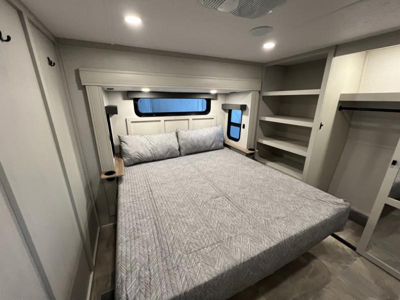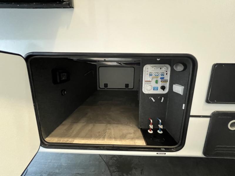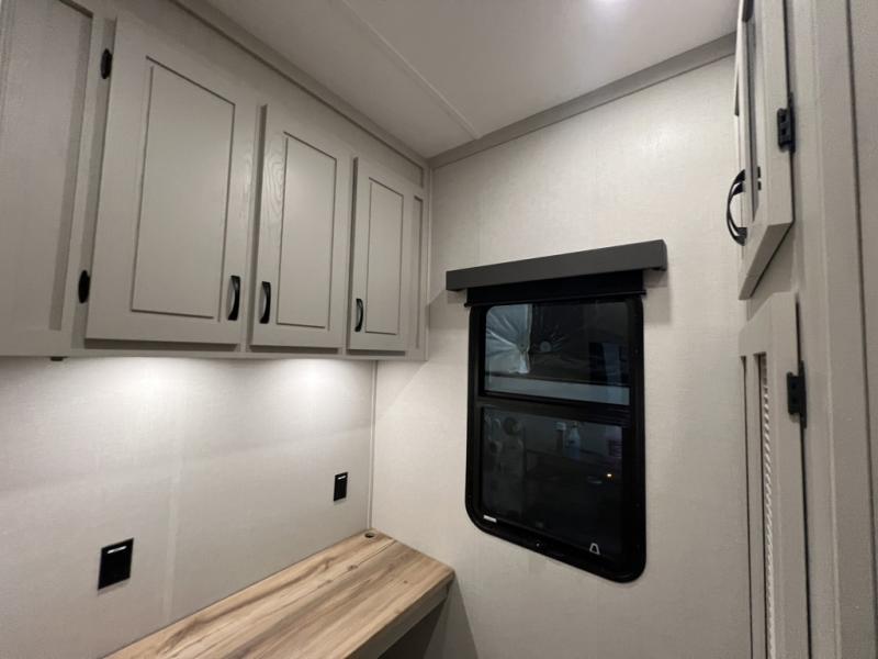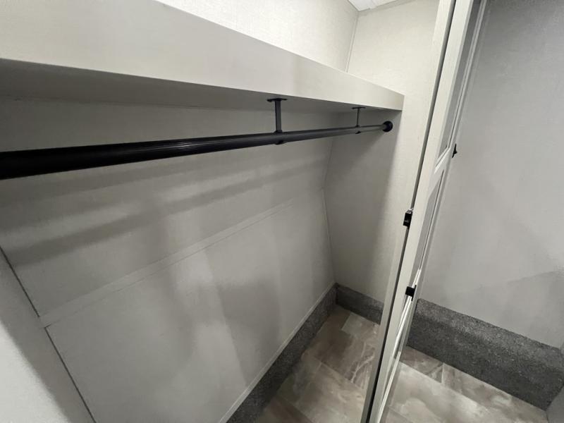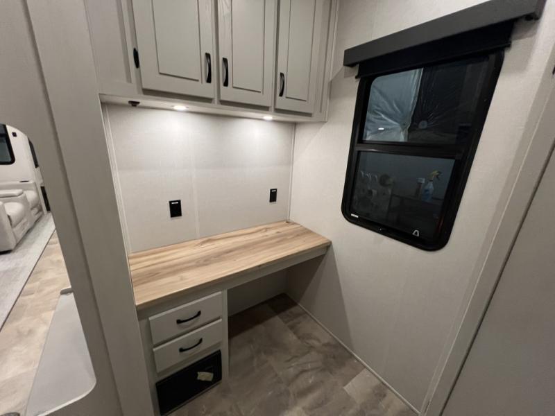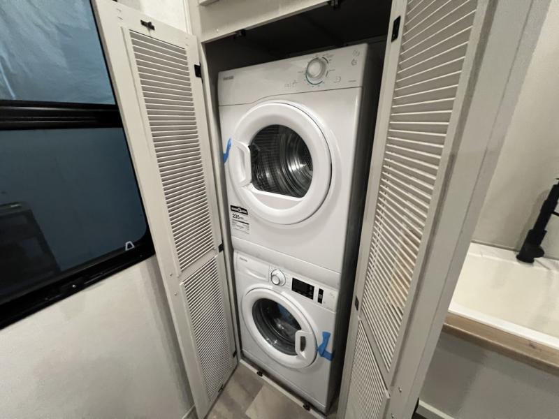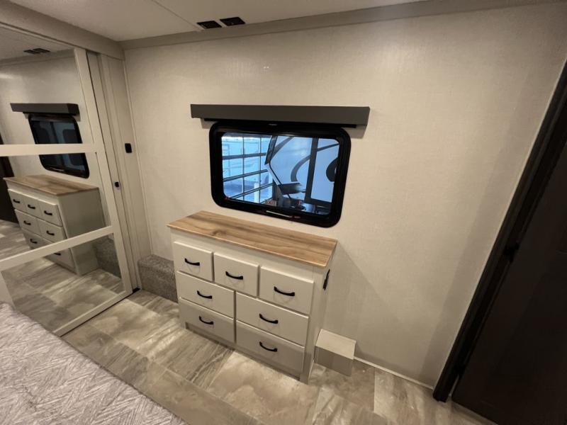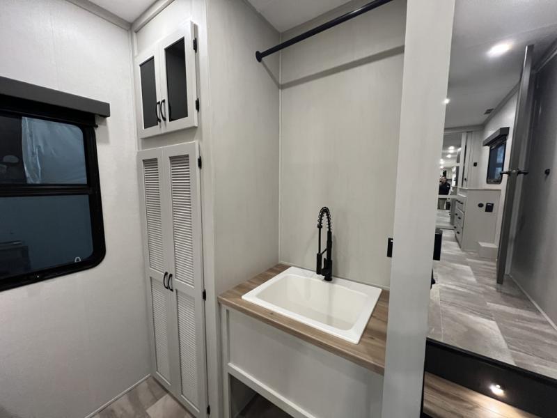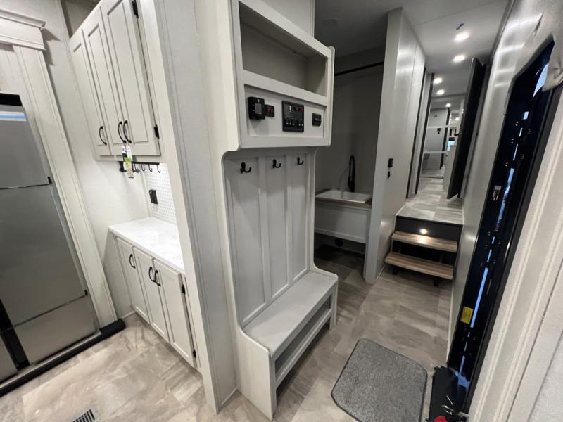 The rear living room is the perfect place to unwind, featuring a 78” trifold sofa, theater seating, overhead cabinets, and an entertainment center. Whether you're watching a movie, reading a book, or simply enjoying the company of loved ones, this room has everything you need to relax and recharge. The spacious kitchen is fitted with a kitchen island, refrigerator, microwave, free-standing table, hutch, and overhead cabinets. Perfect for preparing your favorite meals and enjoy with family. With a convenient coat bench, desk with flip-up storage, washer, and dryer, you'll have everything you need to stay organized and comfortable on the go. The full bathroom is an enormous oasis with a linen closet for added convenience. Also with a front bedroom featuring a king bed, dresser, shelves, and wardrobe, you'll have the perfect place to rest and recharge after a long day of adventure, also plenty of space for storing all your belongings and staying organized on the road.