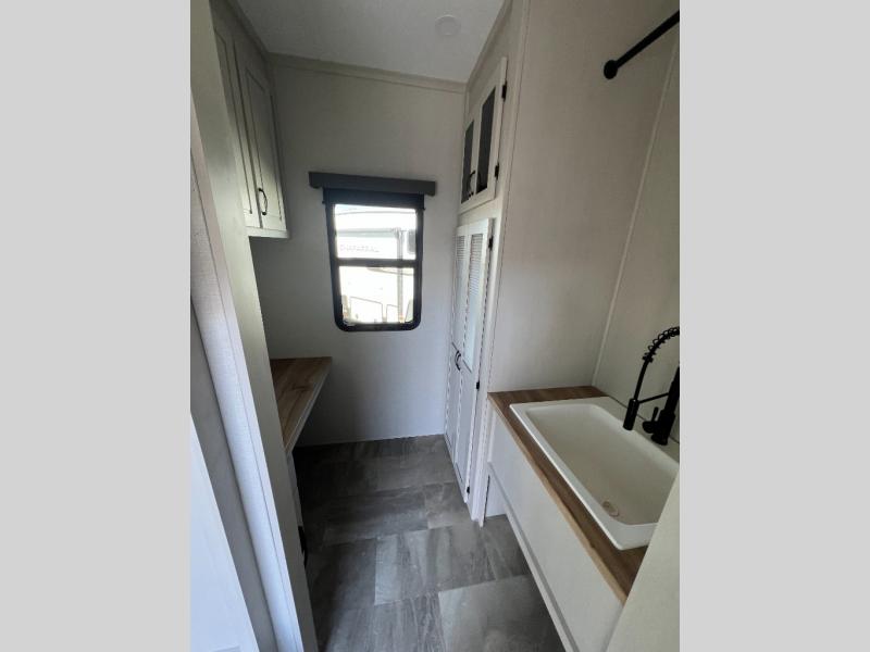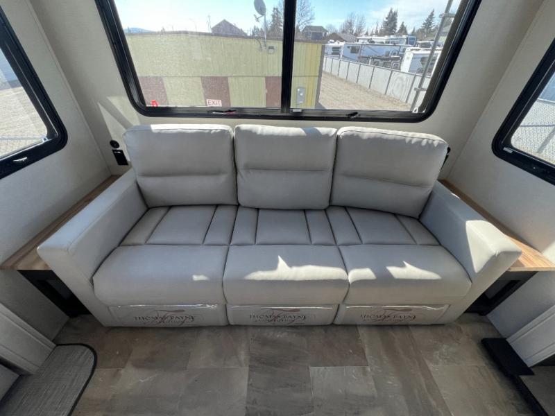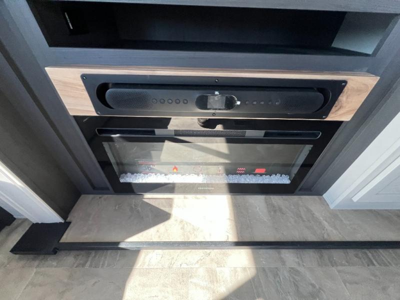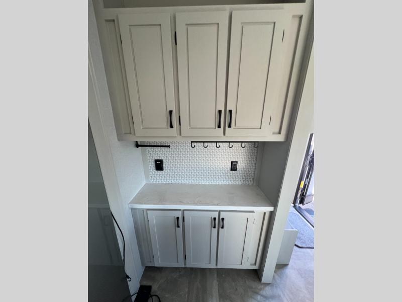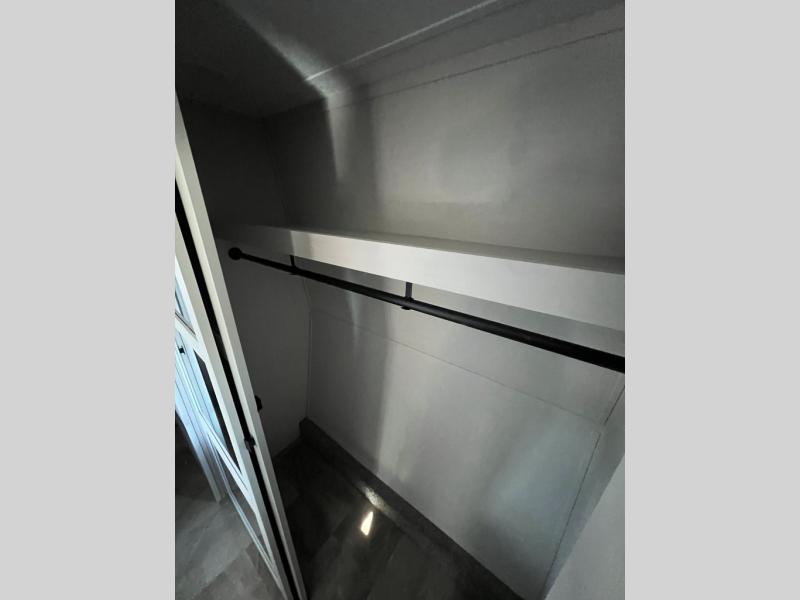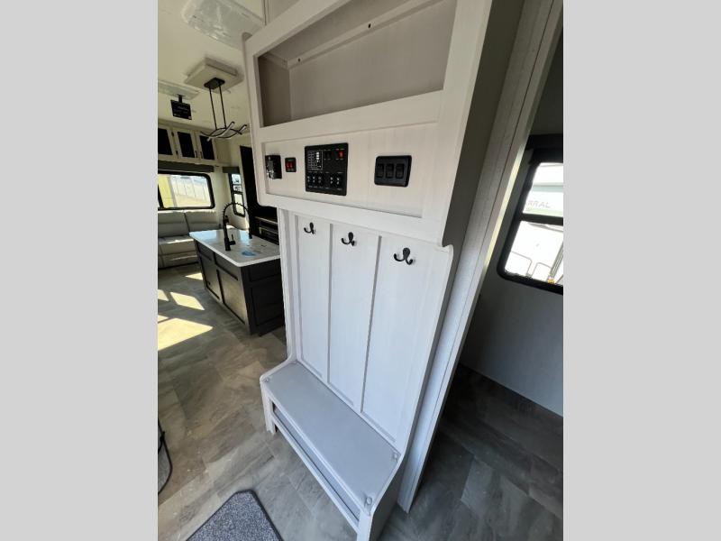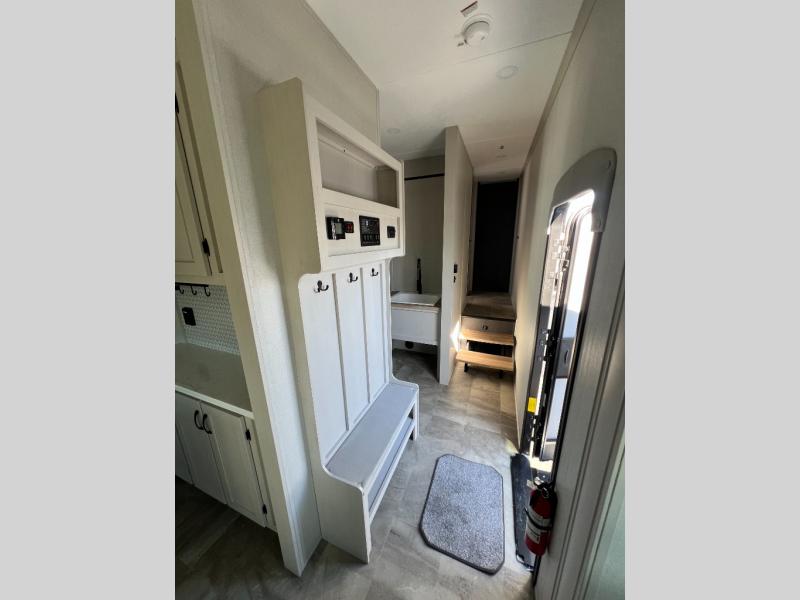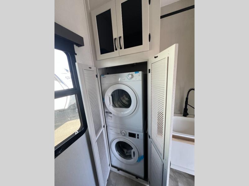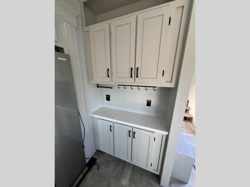 The rear living room is the perfect place to unwind, featuring a 78” trifold sofa, theater seating, overhead cabinets, and an entertainment center. Whether you're watching a movie, reading a book, or simply enjoying the company of loved ones, this room has everything you need to relax and recharge. The spacious kitchen is fitted with a kitchen island, refrigerator, microwave, free-standing table, hutch, and overhead cabinets. Perfect for preparing your favorite meals and enjoy with family. With a convenient coat bench, desk with flip-up storage, washer, and dryer, you'll have everything you need to stay organized and comfortable on the go. The full bathroom is an enormous oasis with a linen closet for added convenience. Also with a front bedroom featuring a king bed, dresser, shelves, and wardrobe, you'll have the perfect place to rest and recharge after a long day of adventure, also plenty of space for storing all your belongings and staying organized on the road.