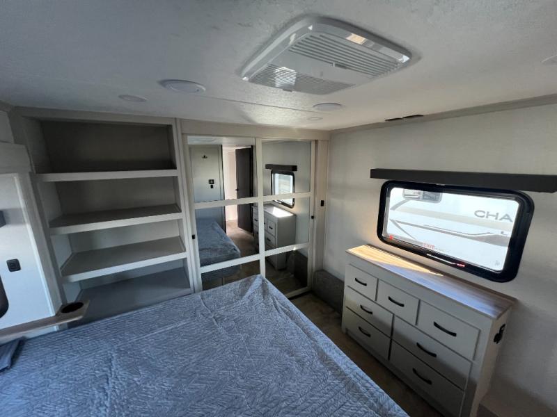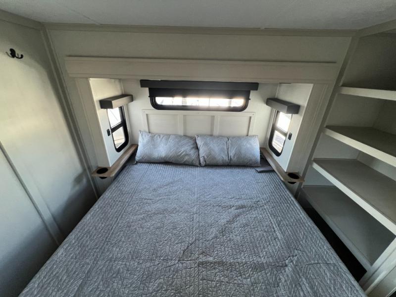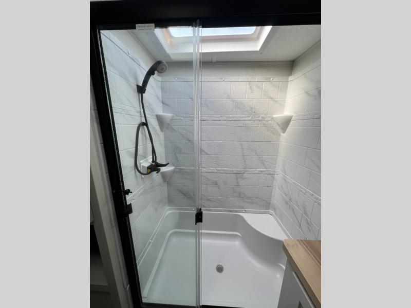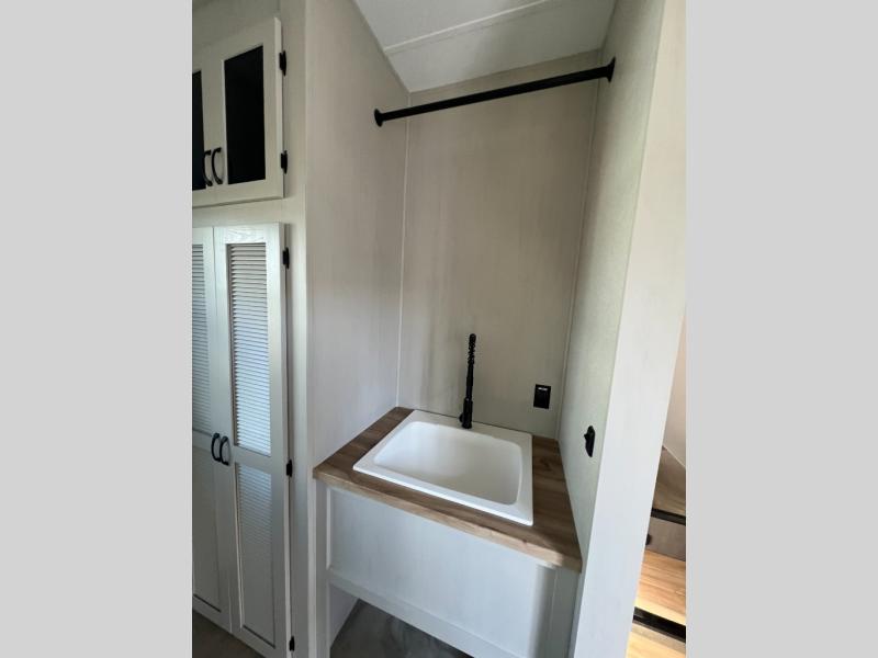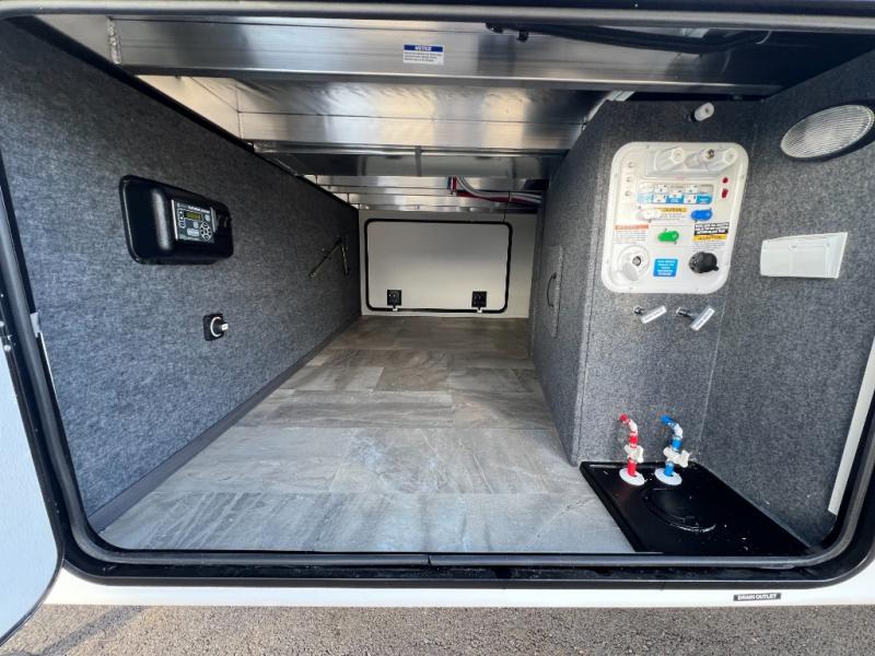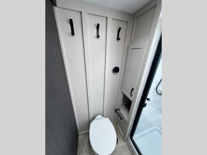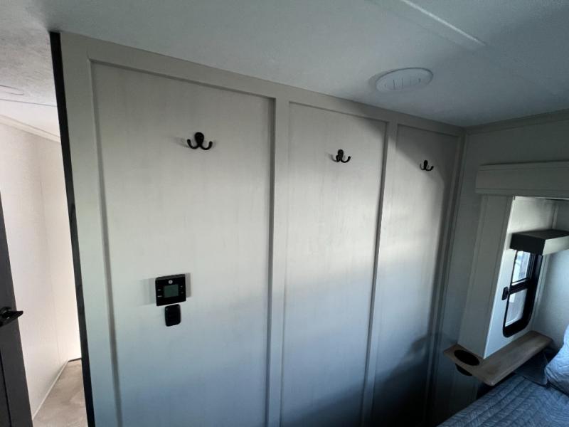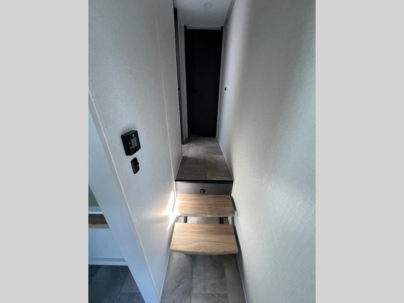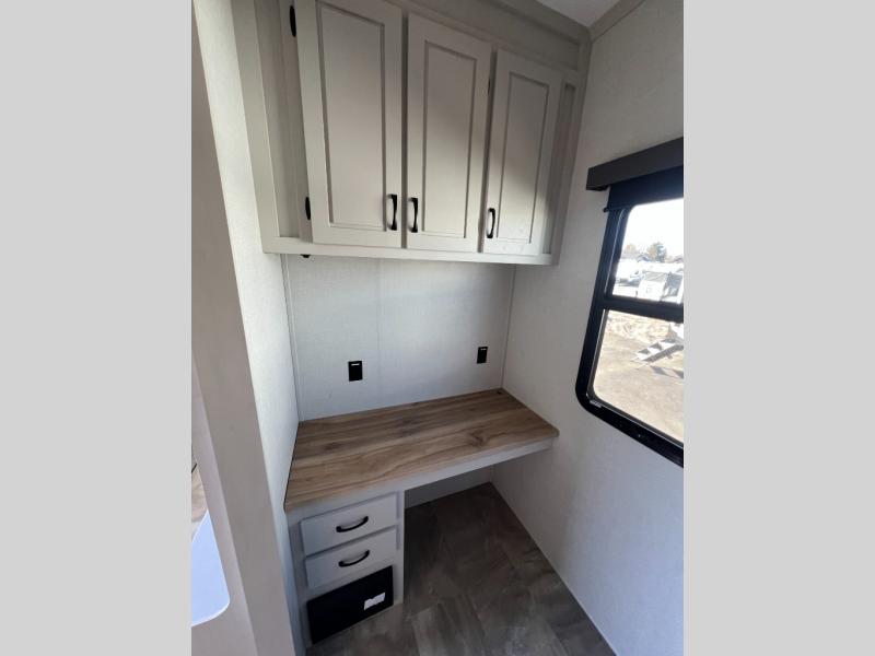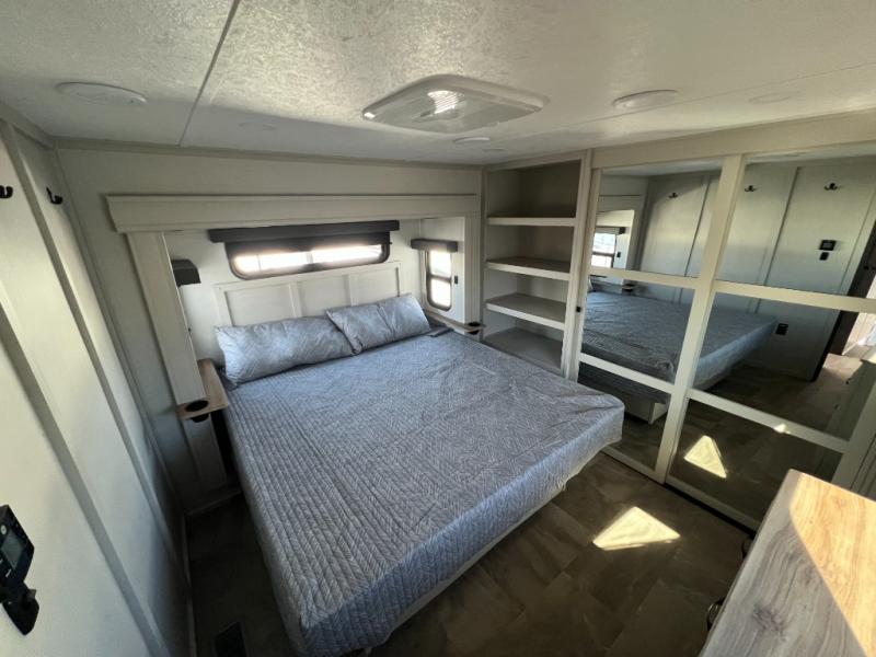 The rear living room is the perfect place to unwind, featuring a 78” trifold sofa, theater seating, overhead cabinets, and an entertainment center. Whether you're watching a movie, reading a book, or simply enjoying the company of loved ones, this room has everything you need to relax and recharge. The spacious kitchen is fitted with a kitchen island, refrigerator, microwave, free-standing table, hutch, and overhead cabinets. Perfect for preparing your favorite meals and enjoy with family. With a convenient coat bench, desk with flip-up storage, washer, and dryer, you'll have everything you need to stay organized and comfortable on the go. The full bathroom is an enormous oasis with a linen closet for added convenience. Also with a front bedroom featuring a king bed, dresser, shelves, and wardrobe, you'll have the perfect place to rest and recharge after a long day of adventure, also plenty of space for storing all your belongings and staying organized on the road.