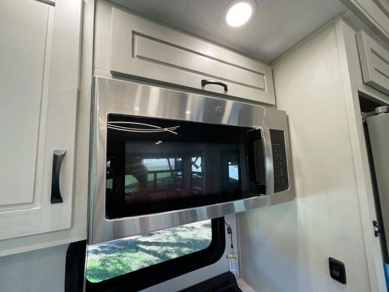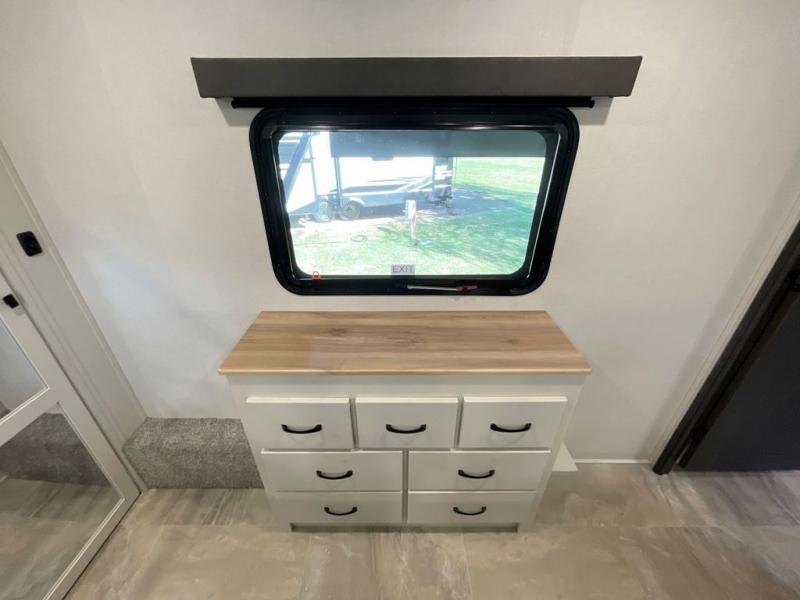The rear living room is the perfect place to unwind, featuring a 78” trifold sofa, theater seating, overhead cabinets, and an entertainment center. Whether you're watching a movie, reading a book, or simply enjoying the company of loved ones, this room has everything you need to relax and recharge. The spacious kitchen is fitted with a kitchen island, refrigerator, microwave, free-standing table, hutch, and overhead cabinets. Perfect for preparing your favorite meals and enjoy with family. With a convenient coat bench, desk with flip-up storage, washer, and dryer, you'll have everything you need to stay organized and comfortable on the go. The full bathroom is an enormous oasis with a linen closet for added convenience. Also with a front bedroom featuring a king bed, dresser, shelves, and wardrobe, you'll have the perfect place to rest and recharge after a long day of adventure, also plenty of space for storing all your belongings and staying organized on the road.