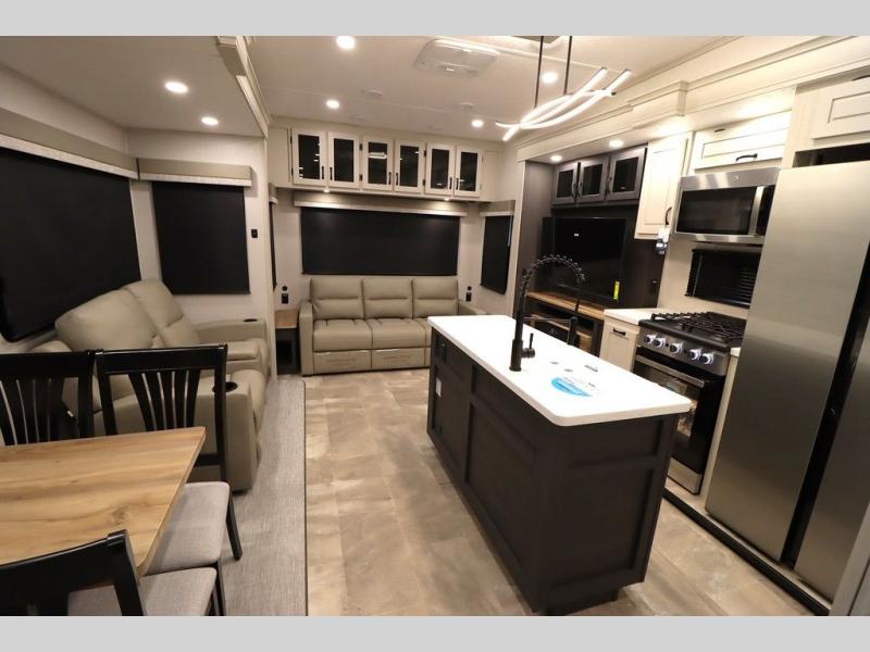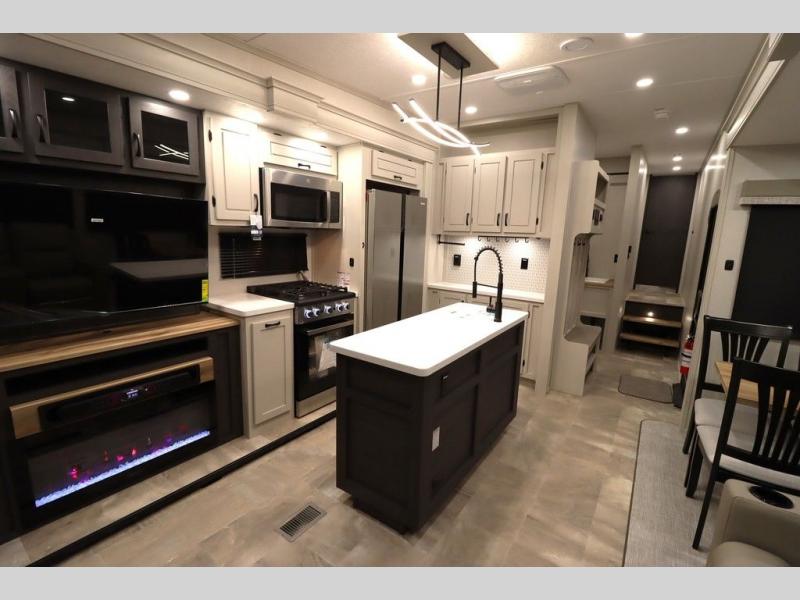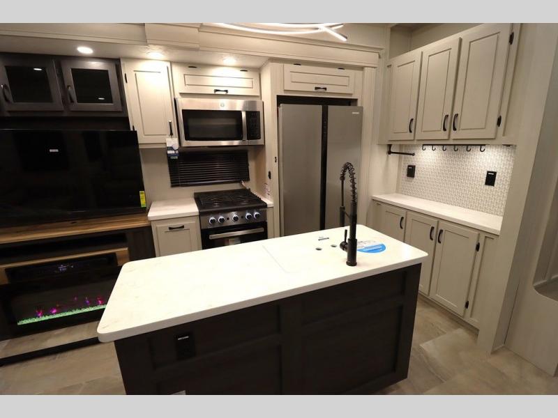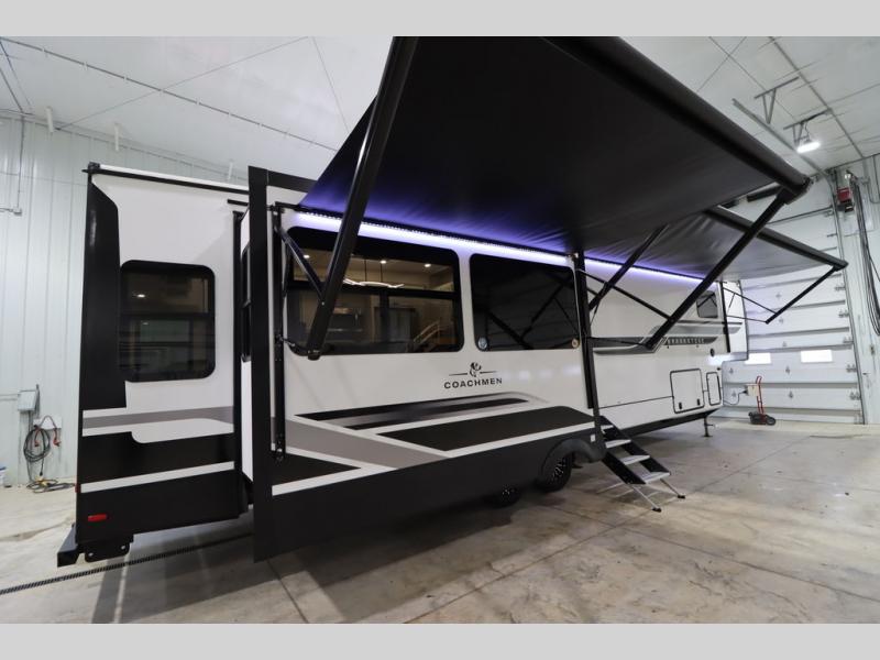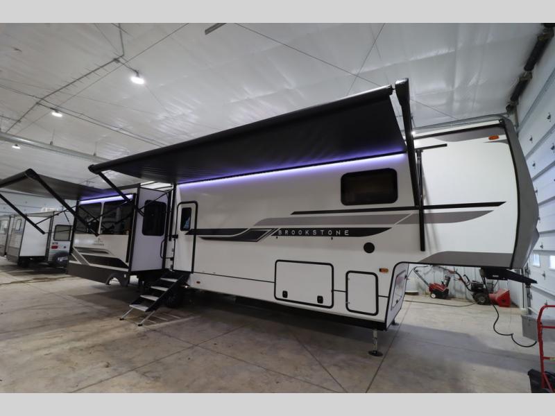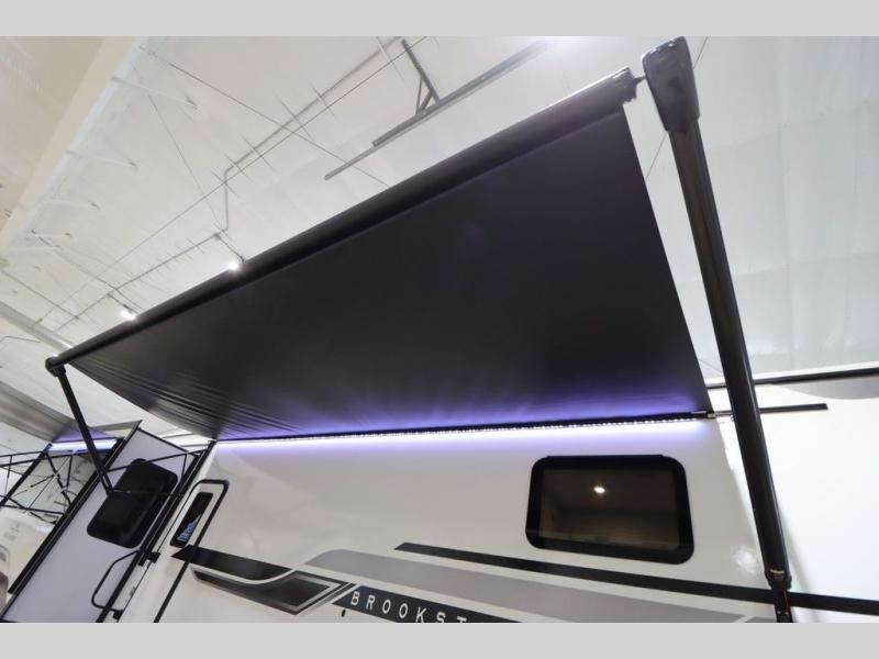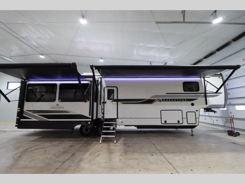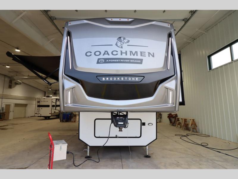 The Brookstone fifth wheels by Coachmen are coming to you with wide-body comfort, home-like amenities, and unique designs for a truly luxurious RV. The Weather Shield+ consists of a 6X double Azdel aluminum cage sidewall system, a Radiant Pro weather barrier system, and more that will help you extend your camping season or go full-time. Head inside to find solid surface countertops in the kitchen, an 4K Smart LED TV in the living room, slow rise roller night shades, and the list of comforts goes on! The Brookstone also includes 6-point electric auto-leveling, four Solid Step entry steps, an electric awning with LED lights, and many more exterior conveniences!