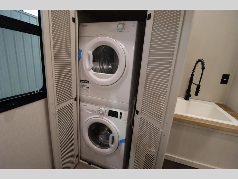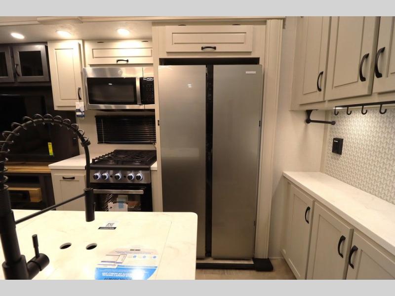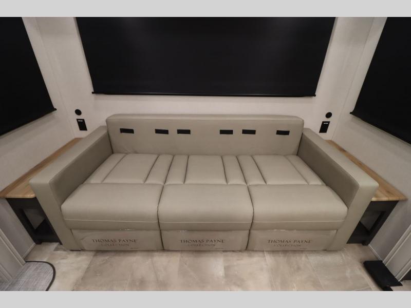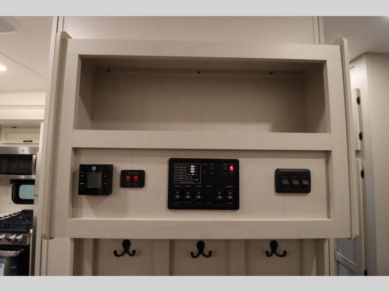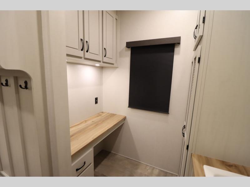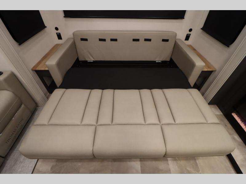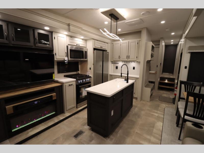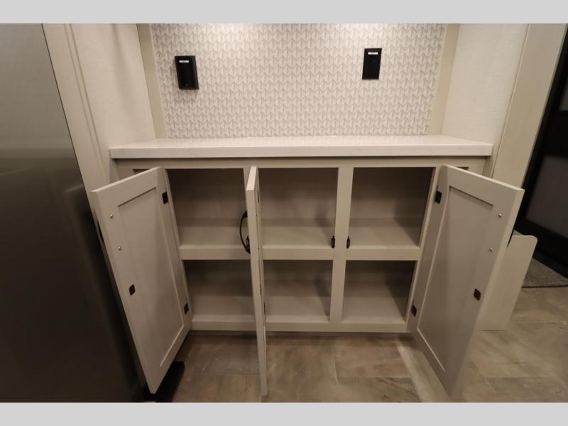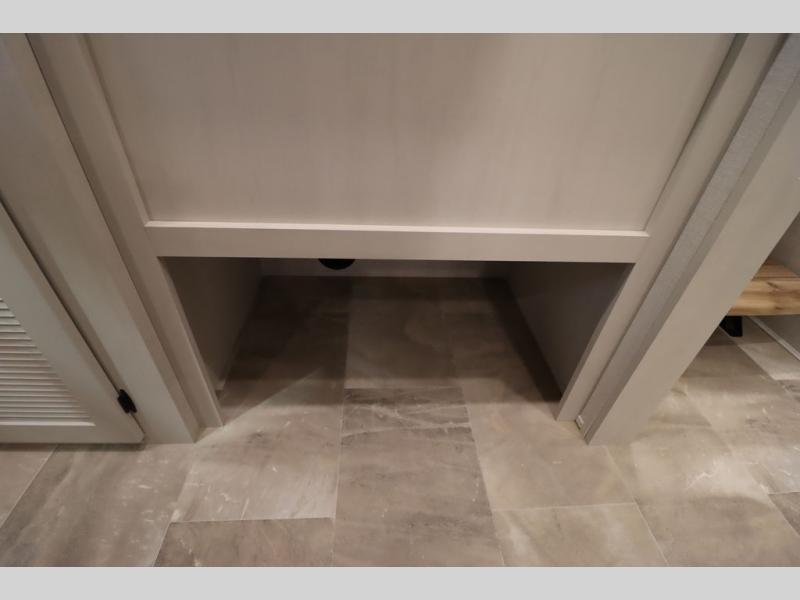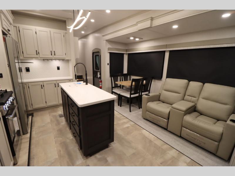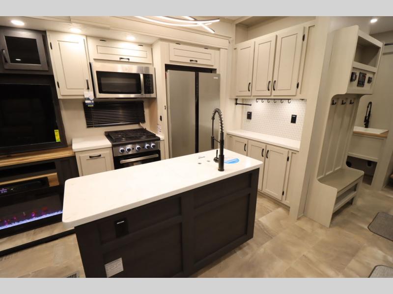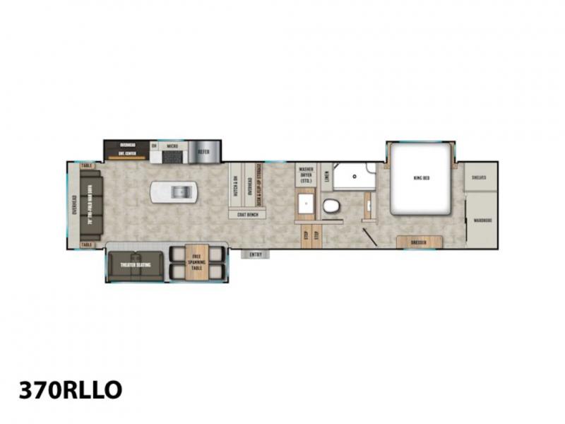 The rear living room is the perfect place to unwind, featuring a 78” trifold sofa, theater seating, overhead cabinets, and an entertainment center. Whether you're watching a movie, reading a book, or simply enjoying the company of loved ones, this room has everything you need to relax and recharge. The spacious kitchen is fitted with a kitchen island, refrigerator, microwave, free-standing table, hutch, and overhead cabinets. Perfect for preparing your favorite meals and enjoy with family. With a convenient coat bench, desk with flip-up storage, washer, and dryer, you'll have everything you need to stay organized and comfortable on the go. The full bathroom is an enormous oasis with a linen closet for added convenience. Also with a front bedroom featuring a king bed, dresser, shelves, and wardrobe, you'll have the perfect place to rest and recharge after a long day of adventure, also plenty of space for storing all your belongings and staying organized on the road.