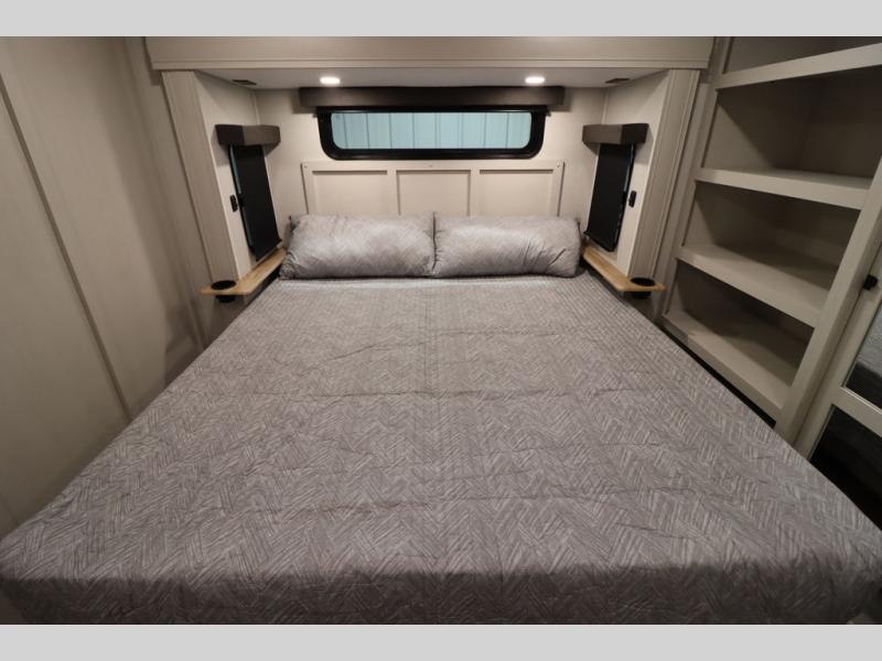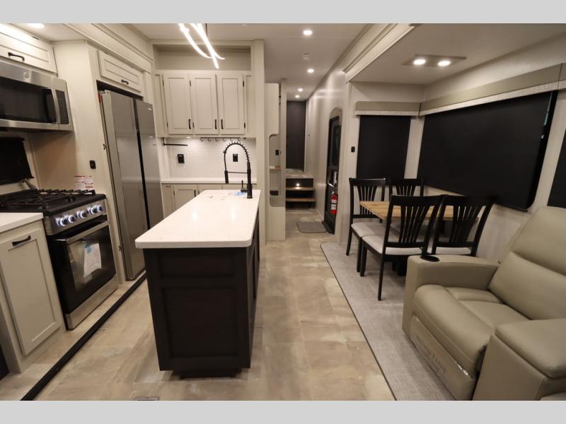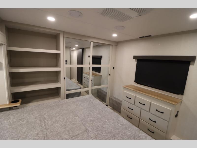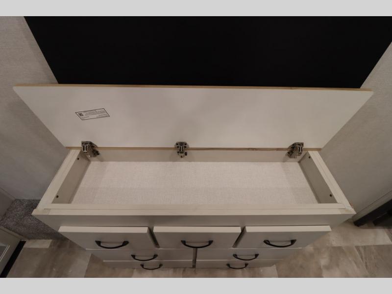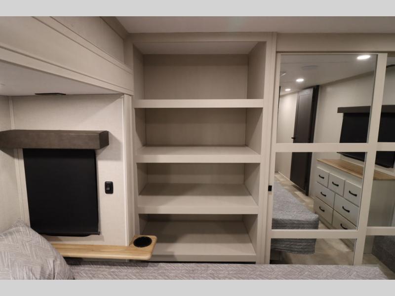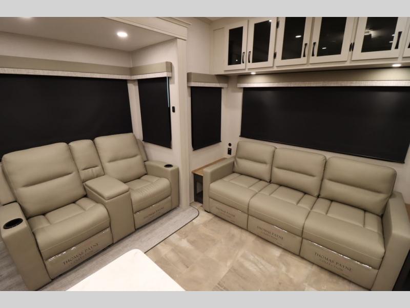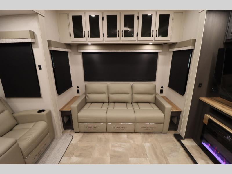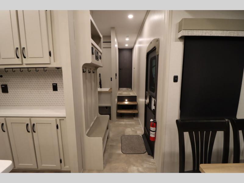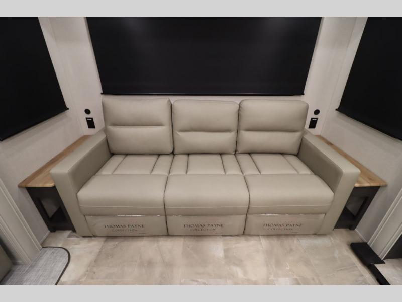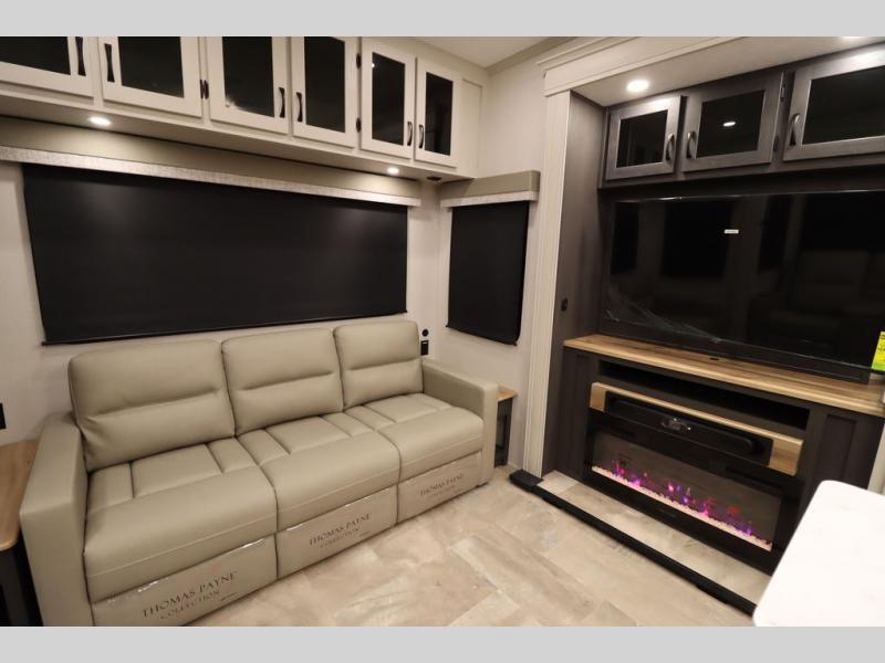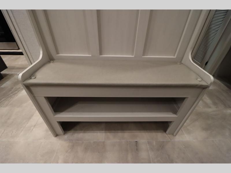 The rear living room is the perfect place to unwind, featuring a 78” trifold sofa, theater seating, overhead cabinets, and an entertainment center. Whether you're watching a movie, reading a book, or simply enjoying the company of loved ones, this room has everything you need to relax and recharge. The spacious kitchen is fitted with a kitchen island, refrigerator, microwave, free-standing table, hutch, and overhead cabinets. Perfect for preparing your favorite meals and enjoy with family. With a convenient coat bench, desk with flip-up storage, washer, and dryer, you'll have everything you need to stay organized and comfortable on the go. The full bathroom is an enormous oasis with a linen closet for added convenience. Also with a front bedroom featuring a king bed, dresser, shelves, and wardrobe, you'll have the perfect place to rest and recharge after a long day of adventure, also plenty of space for storing all your belongings and staying organized on the road.
