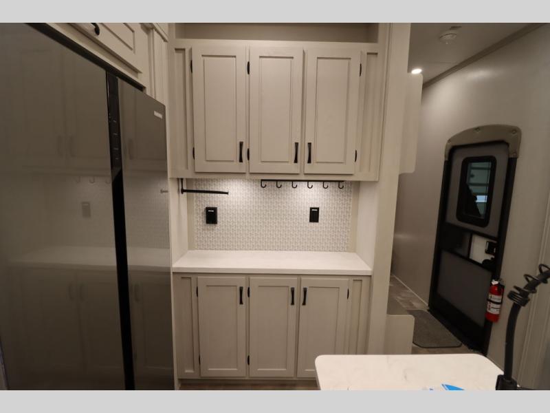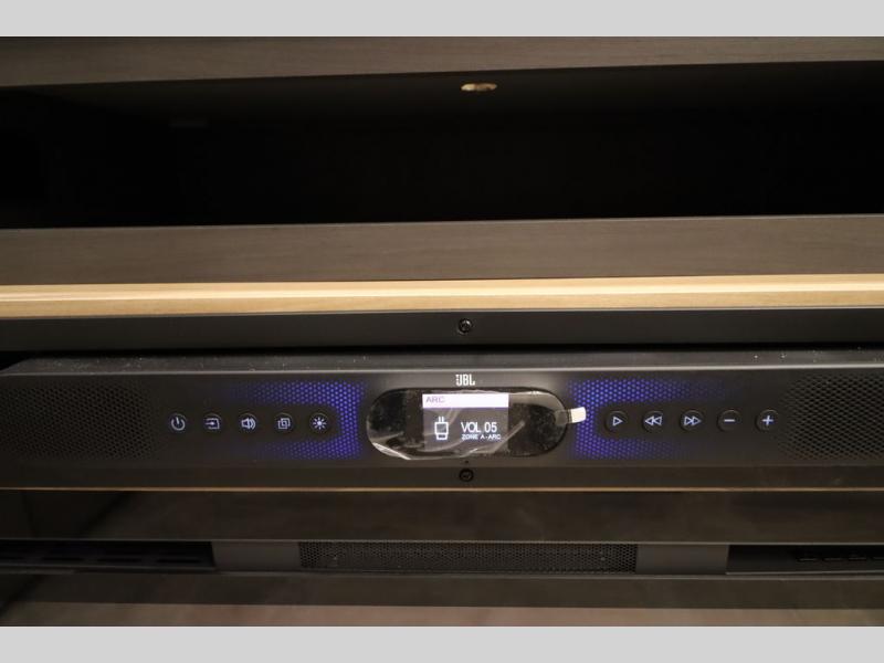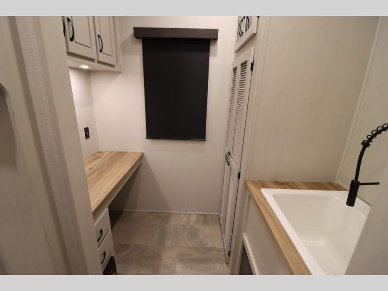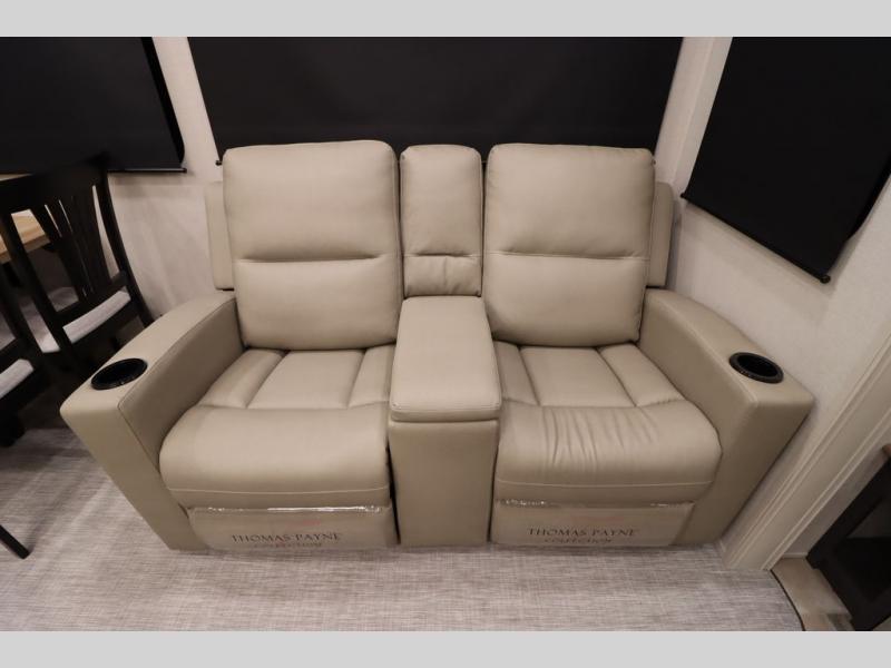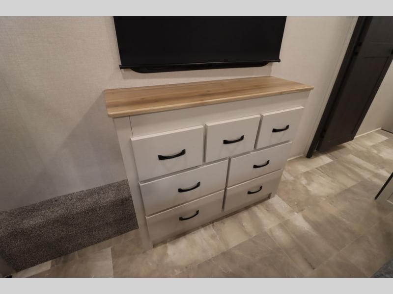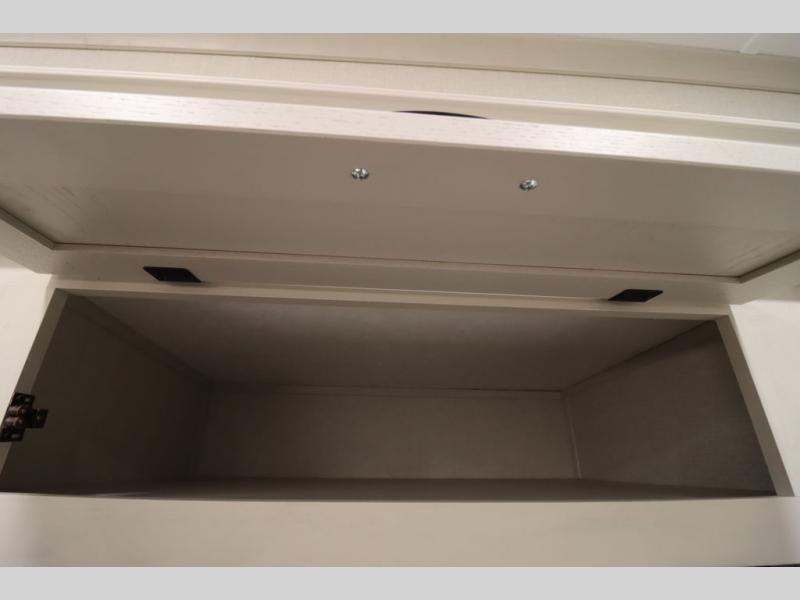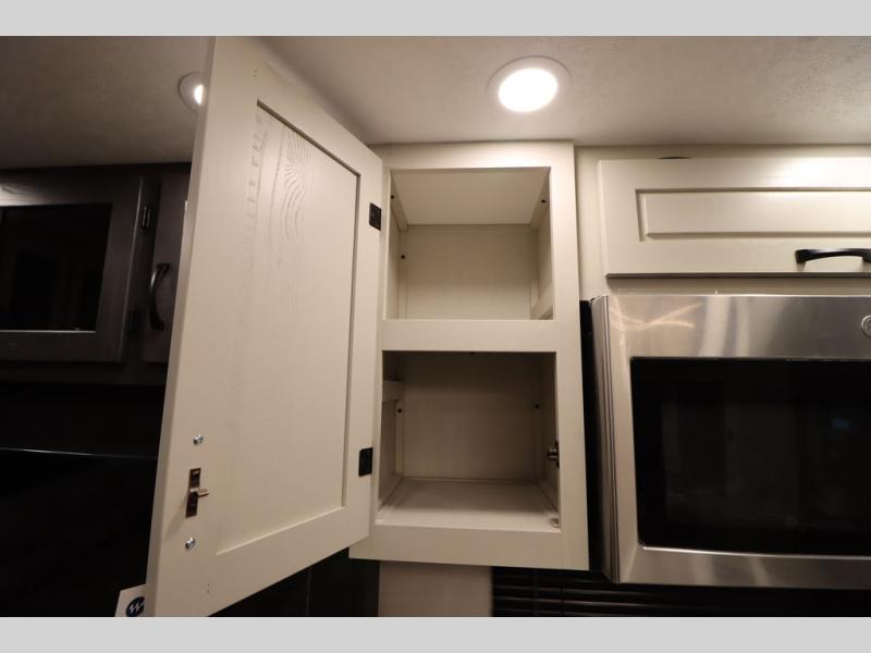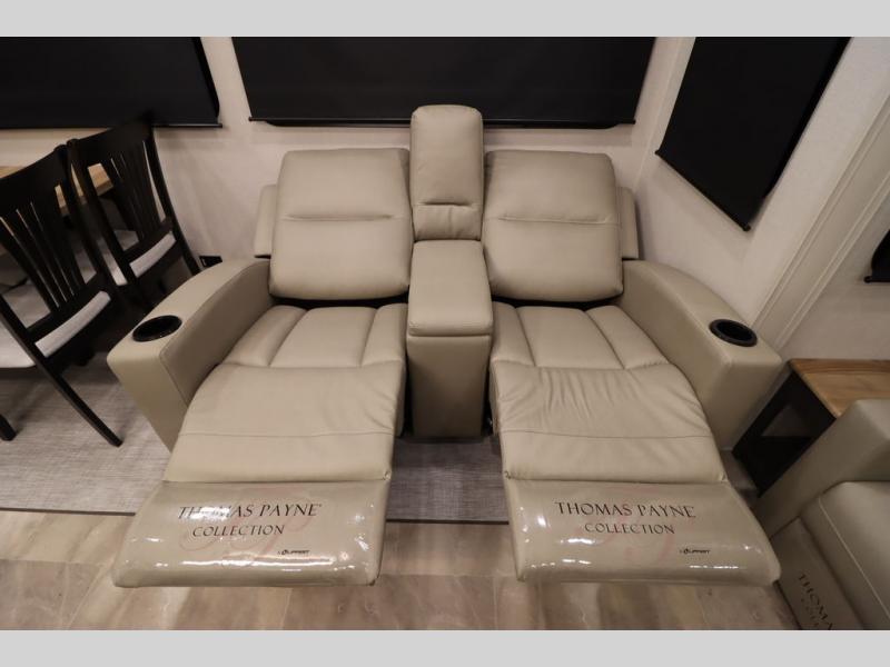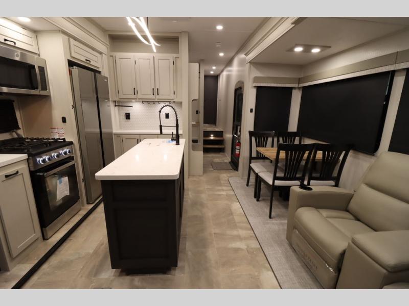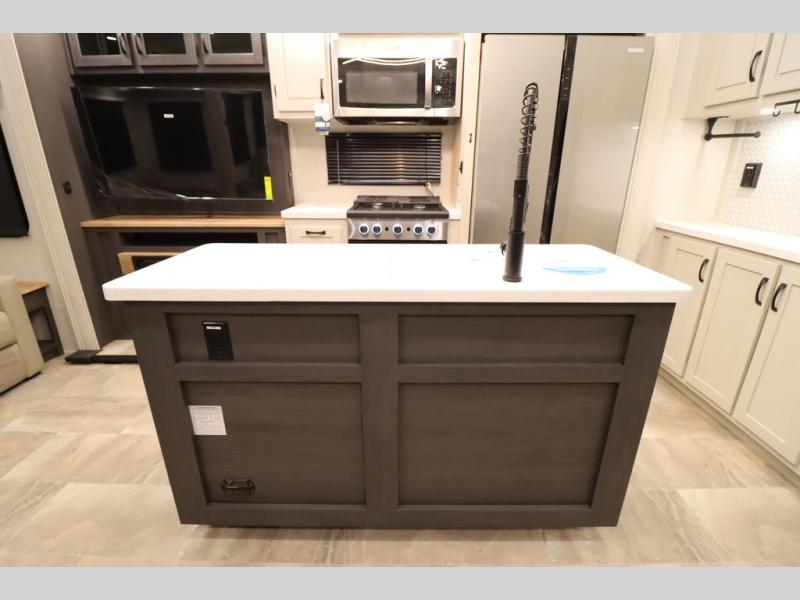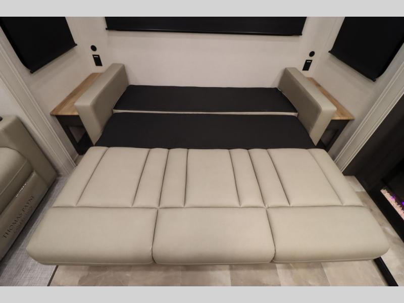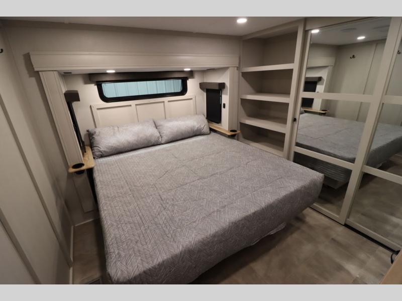 The rear living room is the perfect place to unwind, featuring a 78” trifold sofa, theater seating, overhead cabinets, and an entertainment center. Whether you're watching a movie, reading a book, or simply enjoying the company of loved ones, this room has everything you need to relax and recharge. The spacious kitchen is fitted with a kitchen island, refrigerator, microwave, free-standing table, hutch, and overhead cabinets. Perfect for preparing your favorite meals and enjoy with family. With a convenient coat bench, desk with flip-up storage, washer, and dryer, you'll have everything you need to stay organized and comfortable on the go. The full bathroom is an enormous oasis with a linen closet for added convenience. Also with a front bedroom featuring a king bed, dresser, shelves, and wardrobe, you'll have the perfect place to rest and recharge after a long day of adventure, also plenty of space for storing all your belongings and staying organized on the road.