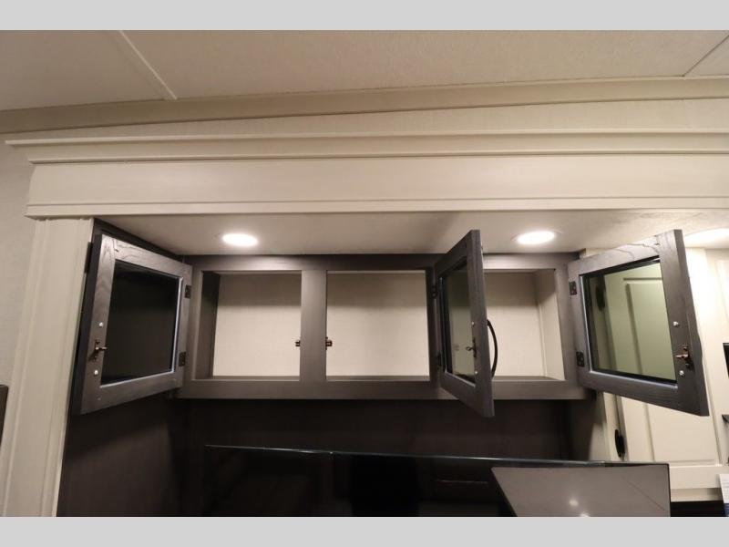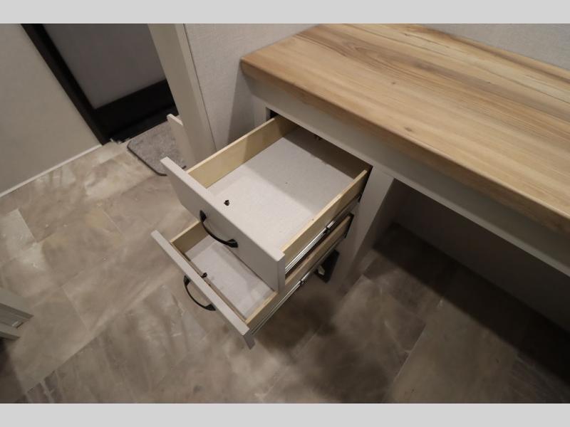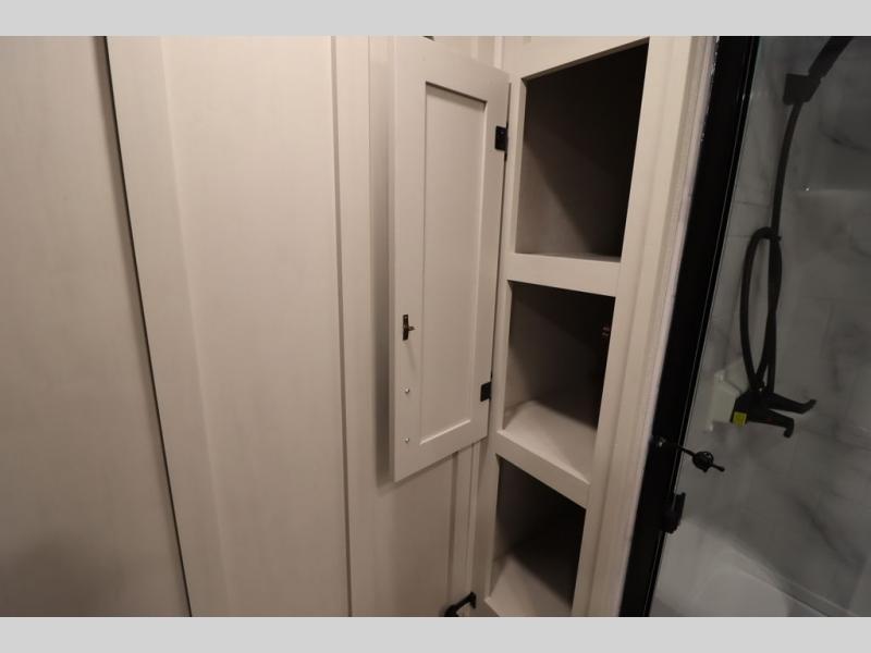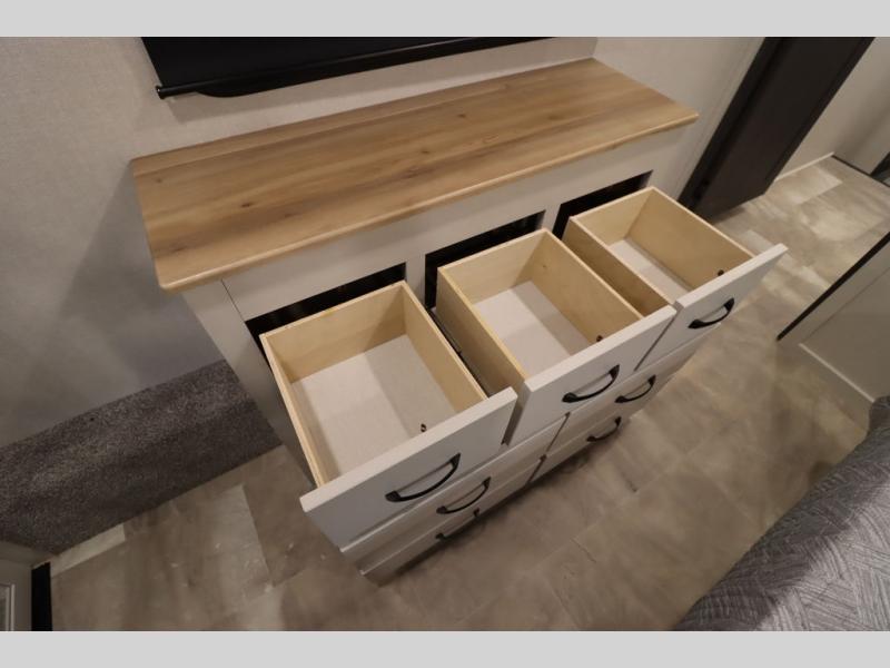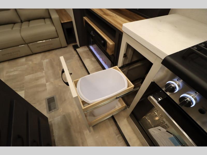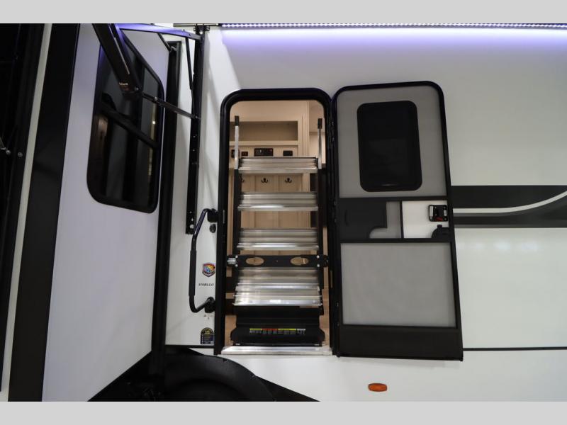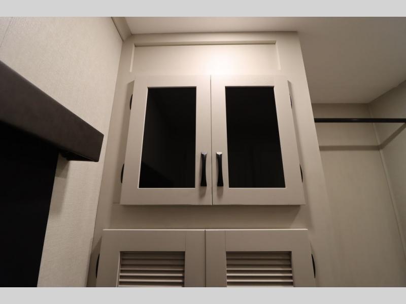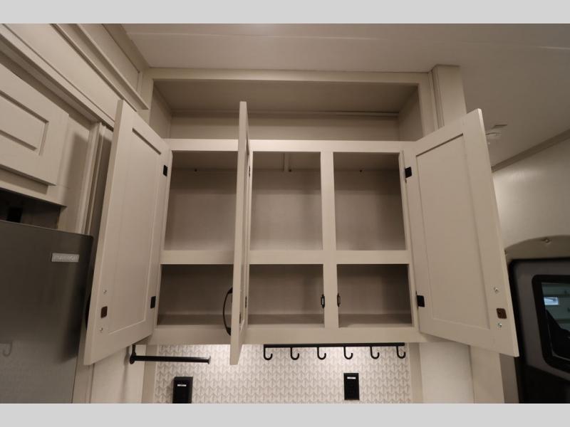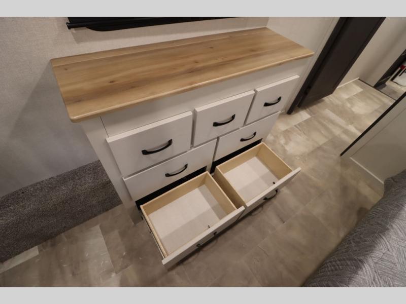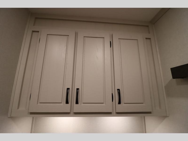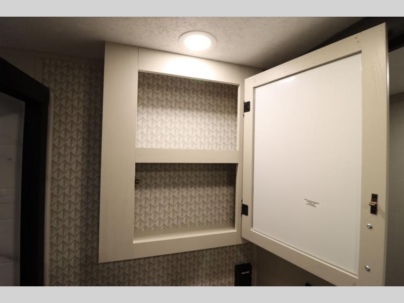 The rear living room is the perfect place to unwind, featuring a 78” trifold sofa, theater seating, overhead cabinets, and an entertainment center. Whether you're watching a movie, reading a book, or simply enjoying the company of loved ones, this room has everything you need to relax and recharge. The spacious kitchen is fitted with a kitchen island, refrigerator, microwave, free-standing table, hutch, and overhead cabinets. Perfect for preparing your favorite meals and enjoy with family. With a convenient coat bench, desk with flip-up storage, washer, and dryer, you'll have everything you need to stay organized and comfortable on the go. The full bathroom is an enormous oasis with a linen closet for added convenience. Also with a front bedroom featuring a king bed, dresser, shelves, and wardrobe, you'll have the perfect place to rest and recharge after a long day of adventure, also plenty of space for storing all your belongings and staying organized on the road.