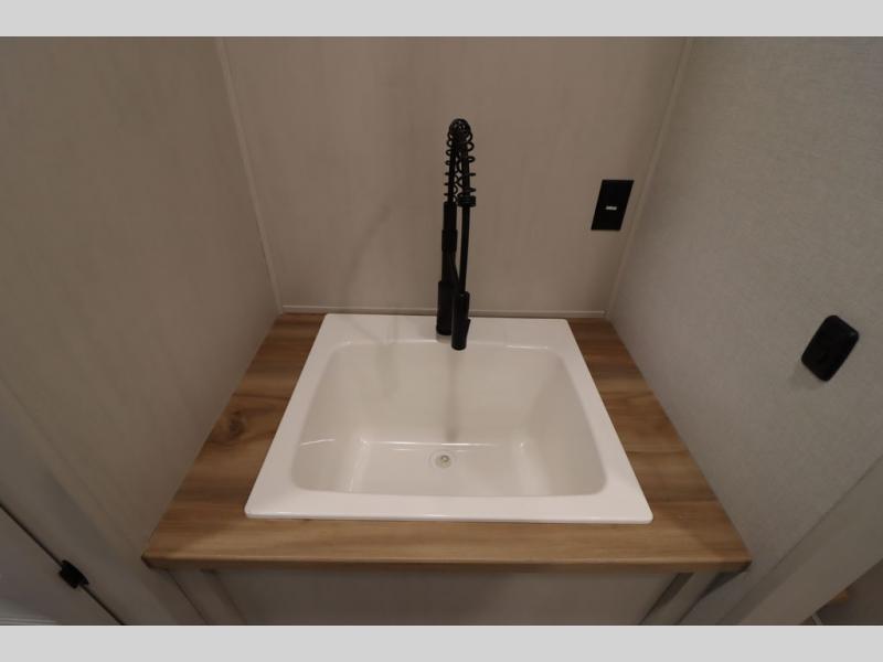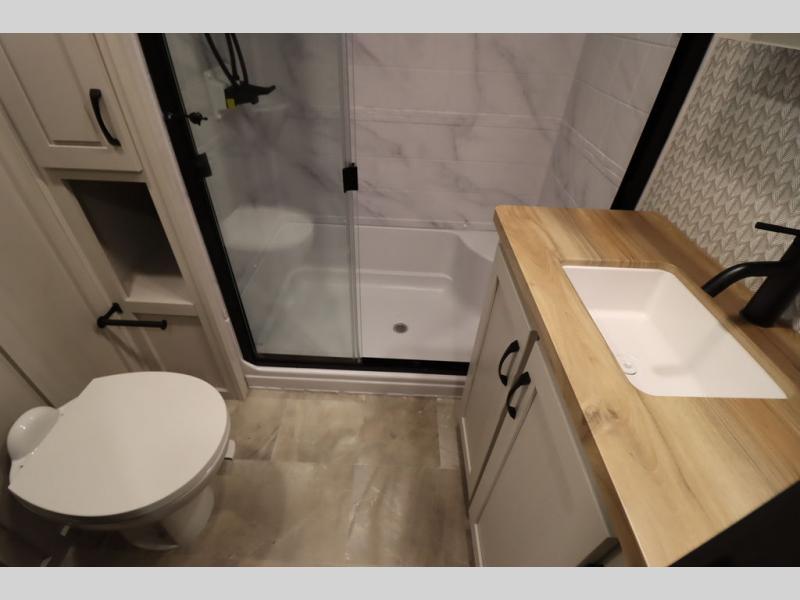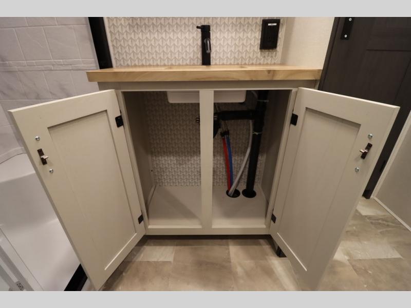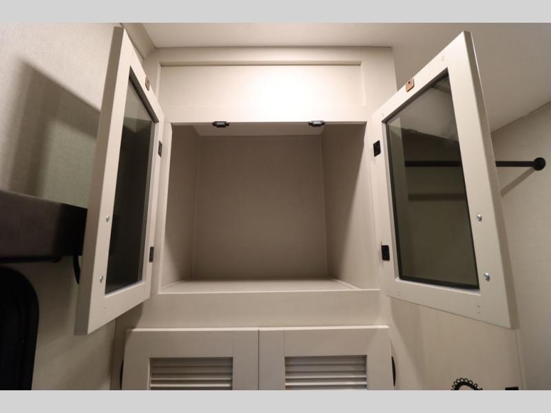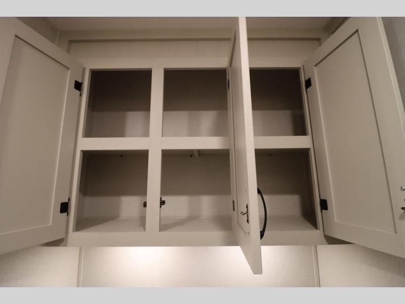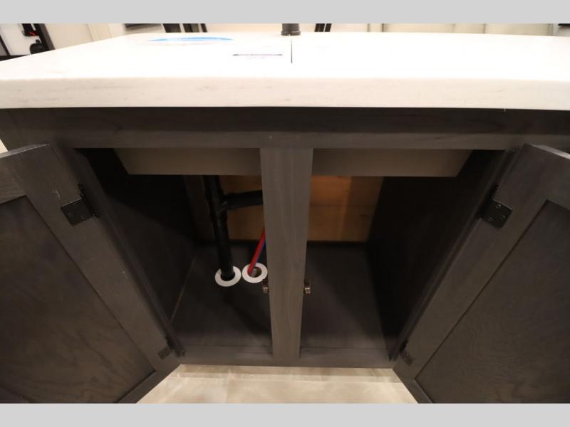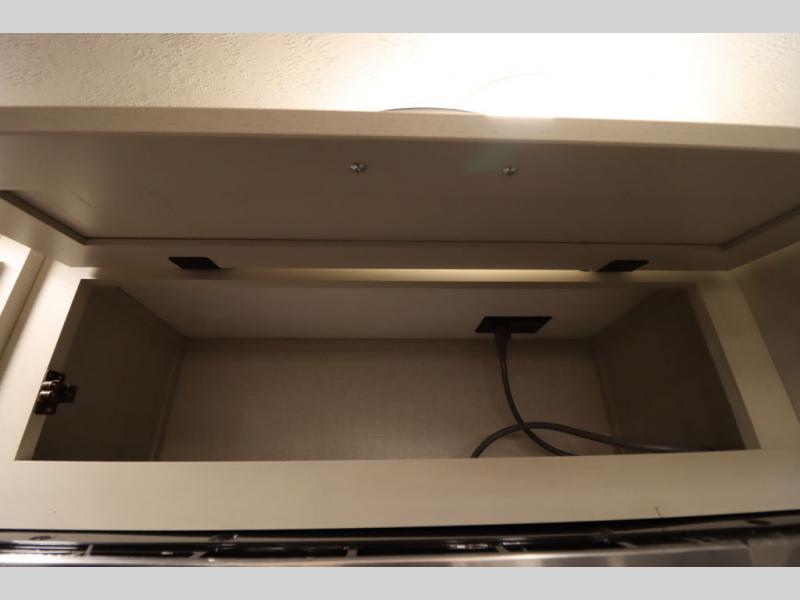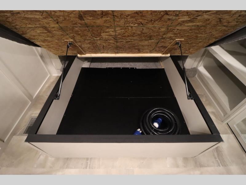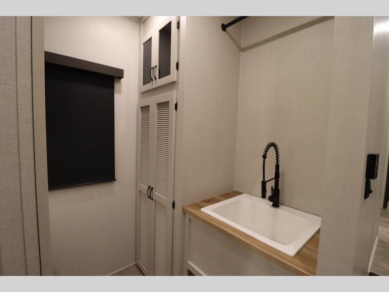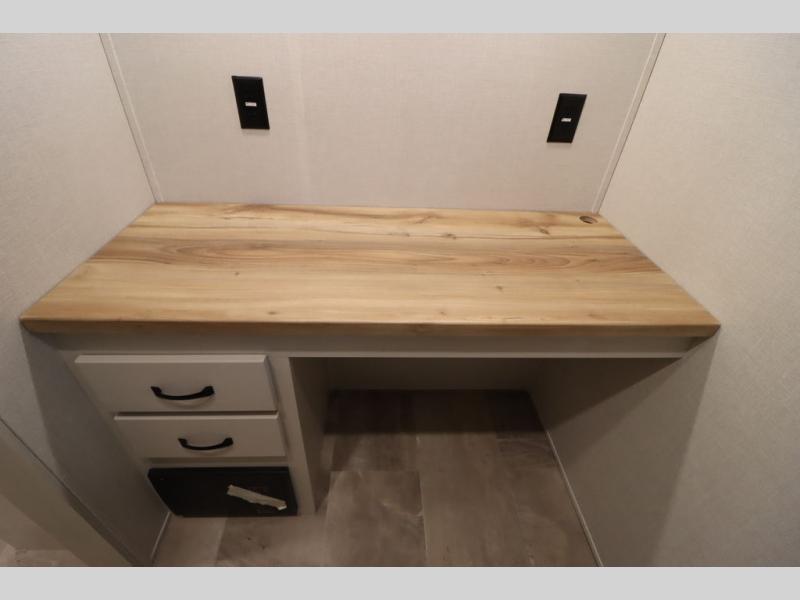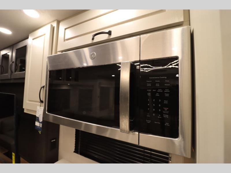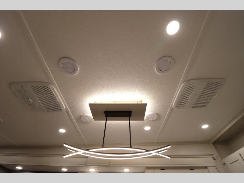 The rear living room is the perfect place to unwind, featuring a 78” trifold sofa, theater seating, overhead cabinets, and an entertainment center. Whether you're watching a movie, reading a book, or simply enjoying the company of loved ones, this room has everything you need to relax and recharge. The spacious kitchen is fitted with a kitchen island, refrigerator, microwave, free-standing table, hutch, and overhead cabinets. Perfect for preparing your favorite meals and enjoy with family. With a convenient coat bench, desk with flip-up storage, washer, and dryer, you'll have everything you need to stay organized and comfortable on the go. The full bathroom is an enormous oasis with a linen closet for added convenience. Also with a front bedroom featuring a king bed, dresser, shelves, and wardrobe, you'll have the perfect place to rest and recharge after a long day of adventure, also plenty of space for storing all your belongings and staying organized on the road.