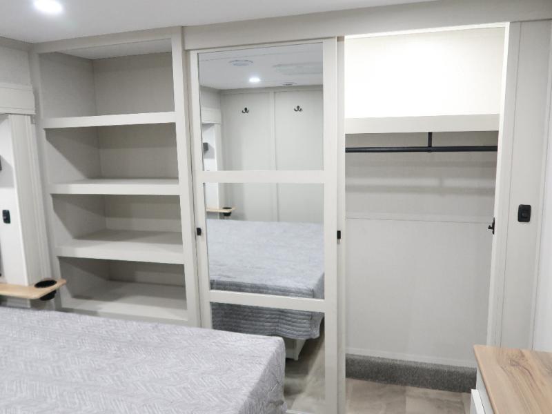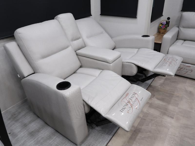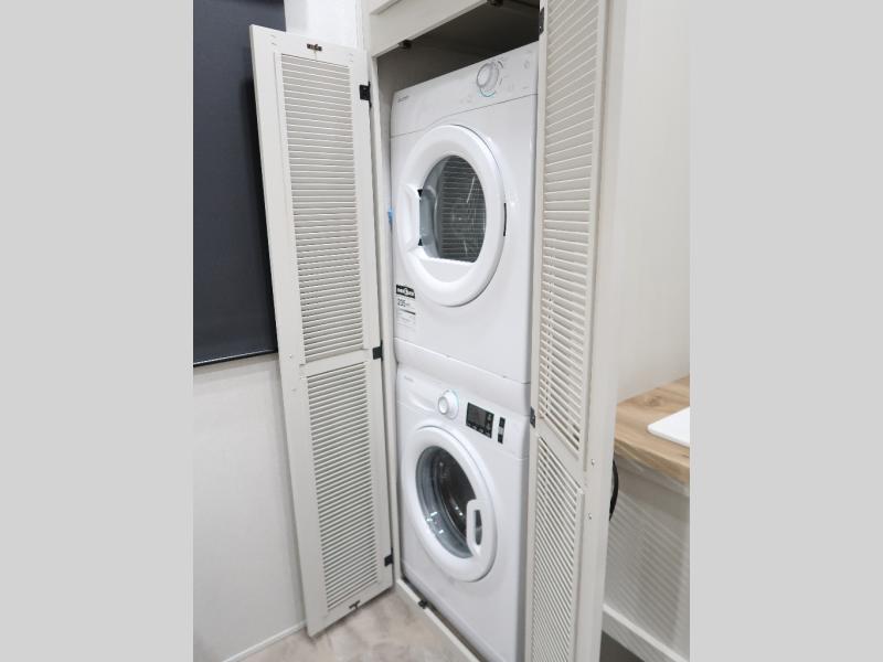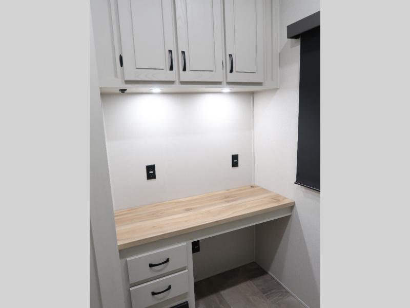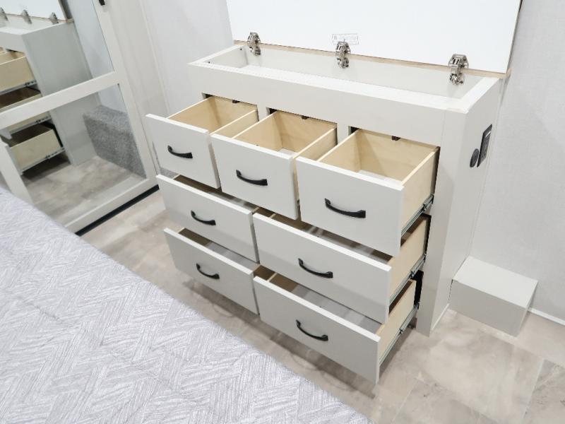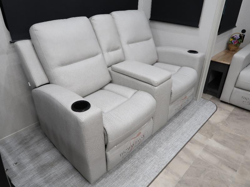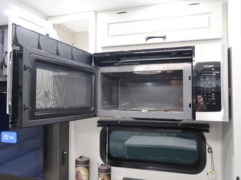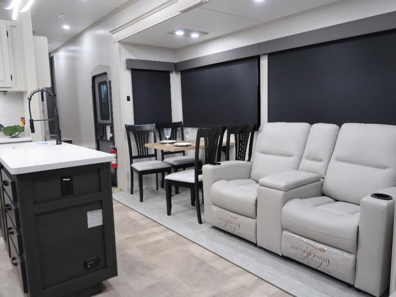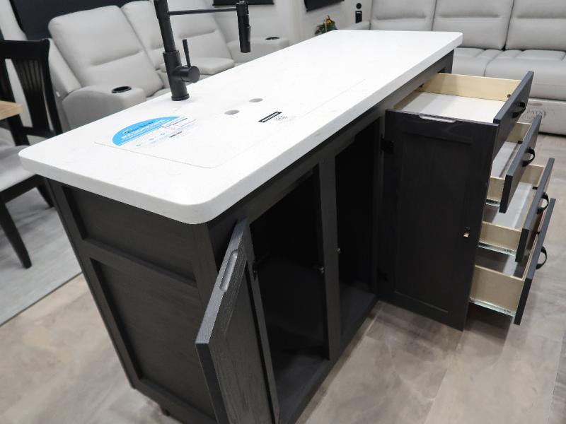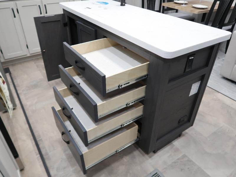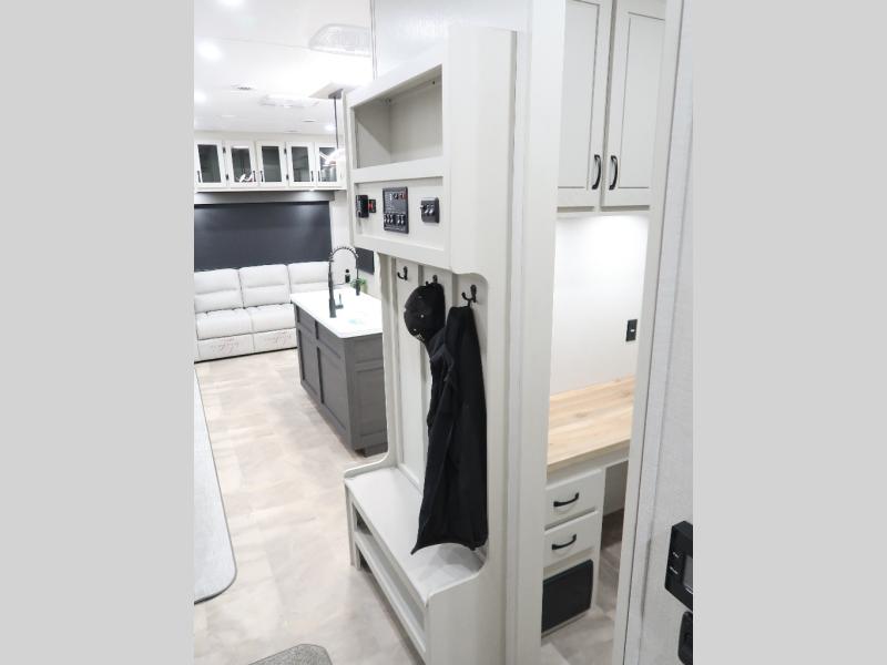 The rear living room is the perfect place to unwind, featuring a 78” trifold sofa, theater seating, overhead cabinets, and an entertainment center. Whether you're watching a movie, reading a book, or simply enjoying the company of loved ones, this room has everything you need to relax and recharge. The spacious kitchen is fitted with a kitchen island, refrigerator, microwave, free-standing table, hutch, and overhead cabinets. Perfect for preparing your favorite meals and enjoy with family. With a convenient coat bench, desk with flip-up storage, washer, and dryer, you'll have everything you need to stay organized and comfortable on the go. The full bathroom is an enormous oasis with a linen closet for added convenience. Also with a front bedroom featuring a king bed, dresser, shelves, and wardrobe, you'll have the perfect place to rest and recharge after a long day of adventure, also plenty of space for storing all your belongings and staying organized on the road.