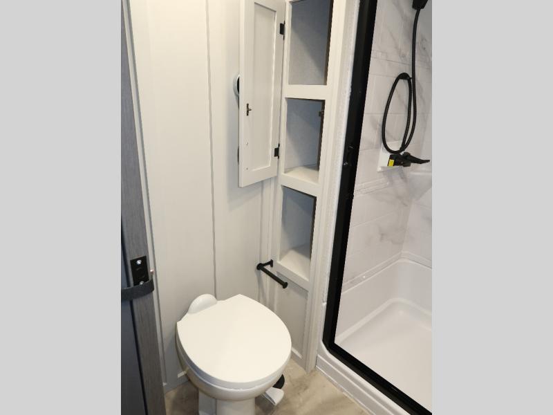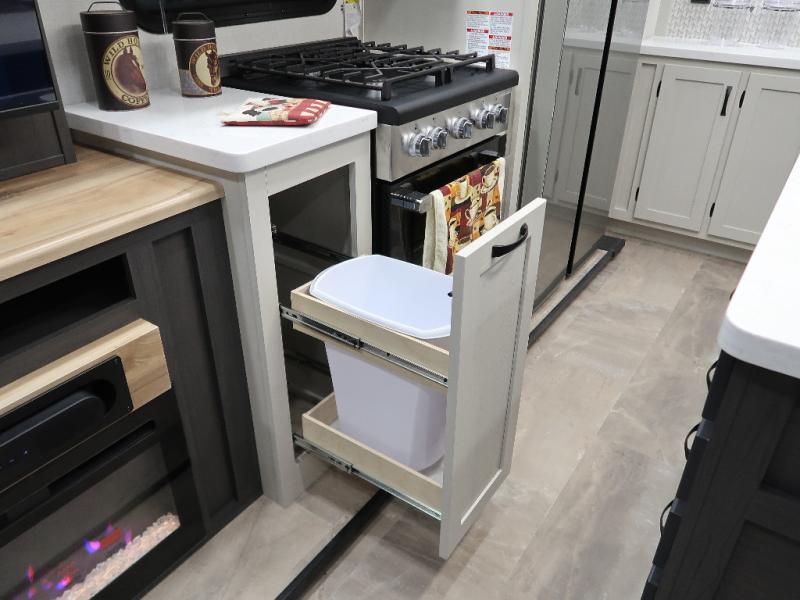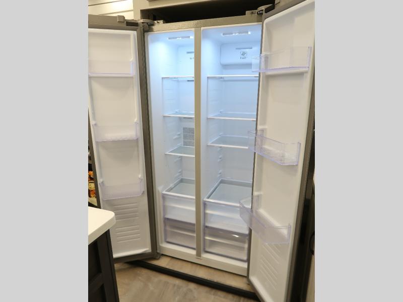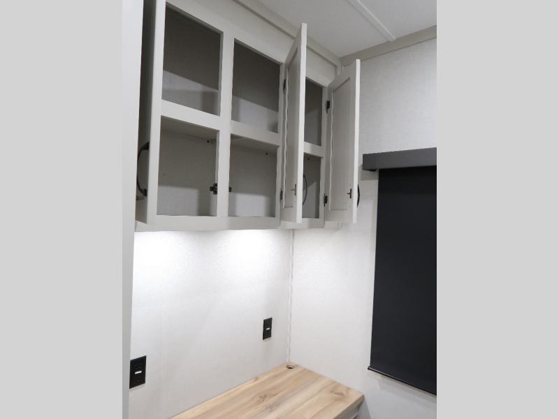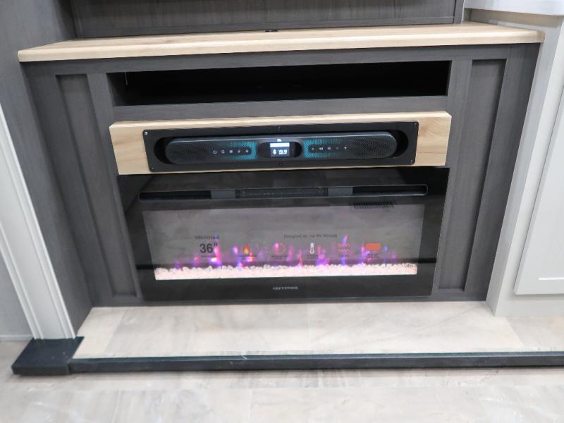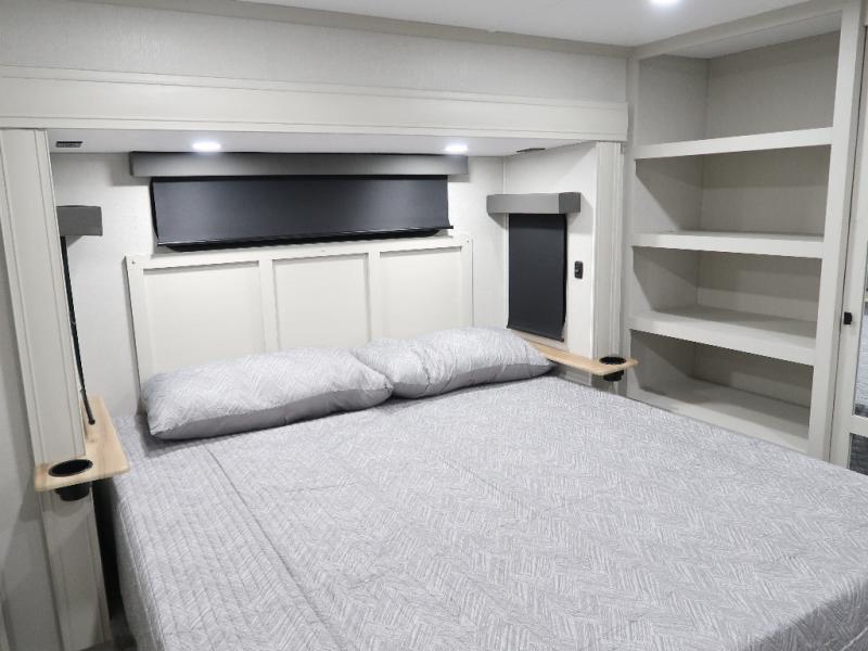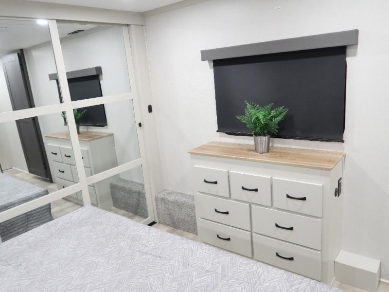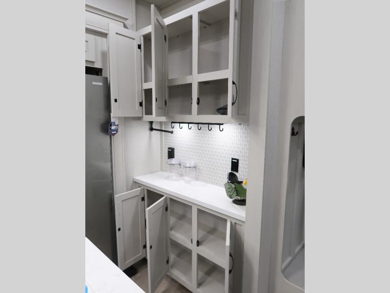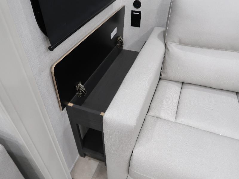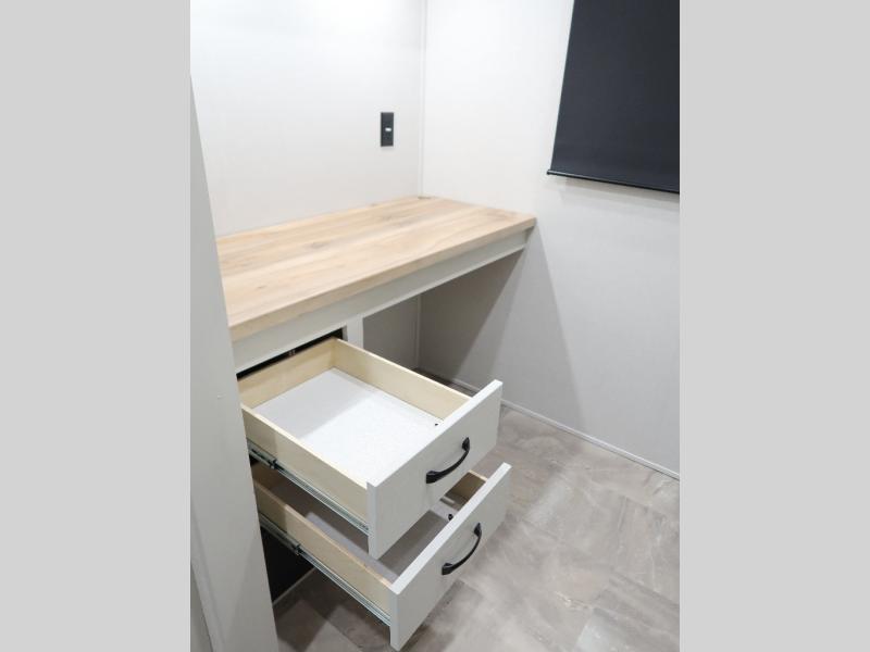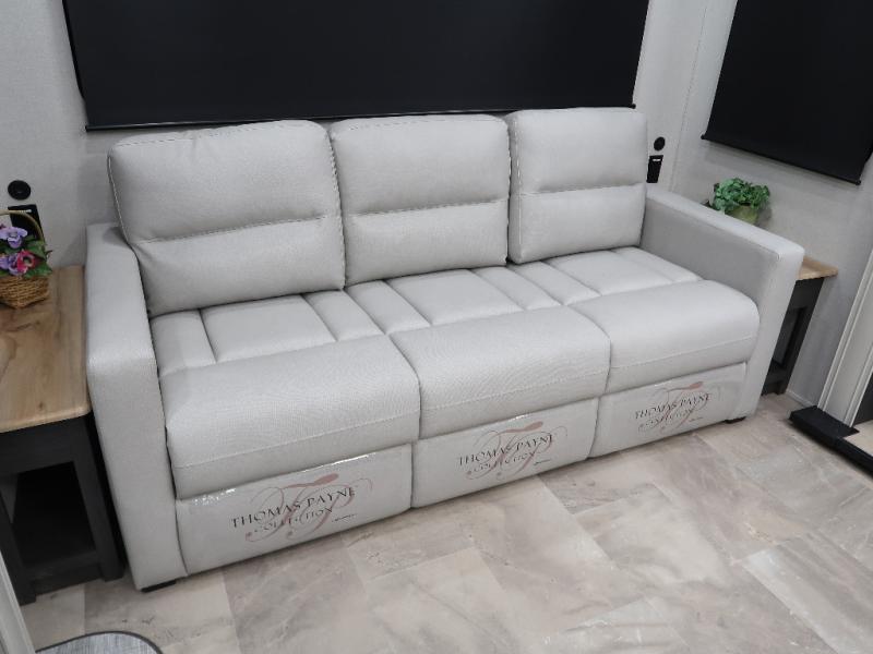 The rear living room is the perfect place to unwind, featuring a 78” trifold sofa, theater seating, overhead cabinets, and an entertainment center. Whether you're watching a movie, reading a book, or simply enjoying the company of loved ones, this room has everything you need to relax and recharge. The spacious kitchen is fitted with a kitchen island, refrigerator, microwave, free-standing table, hutch, and overhead cabinets. Perfect for preparing your favorite meals and enjoy with family. With a convenient coat bench, desk with flip-up storage, washer, and dryer, you'll have everything you need to stay organized and comfortable on the go. The full bathroom is an enormous oasis with a linen closet for added convenience. Also with a front bedroom featuring a king bed, dresser, shelves, and wardrobe, you'll have the perfect place to rest and recharge after a long day of adventure, also plenty of space for storing all your belongings and staying organized on the road.