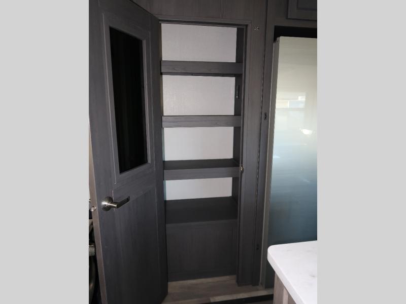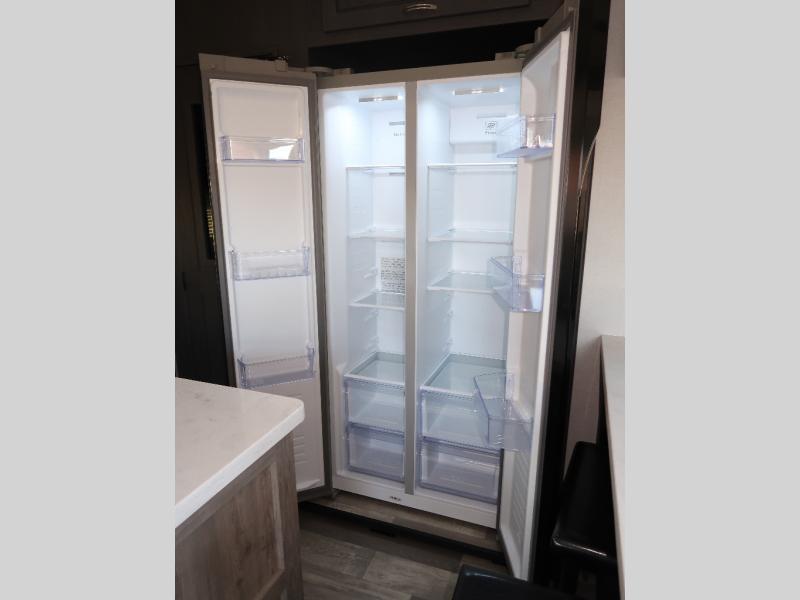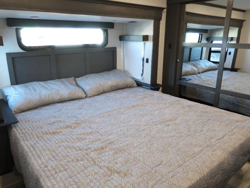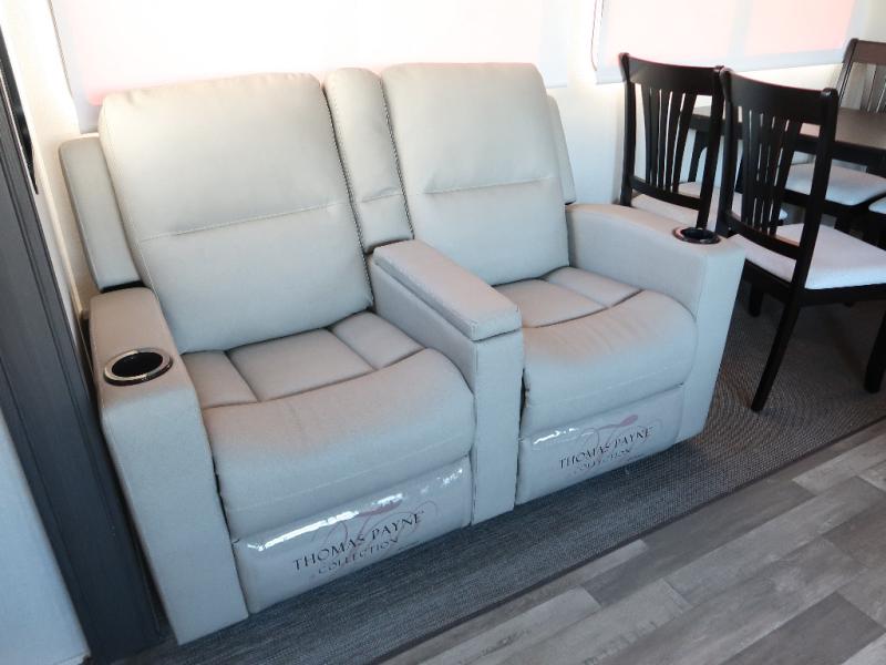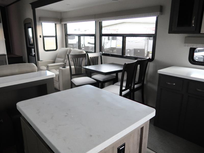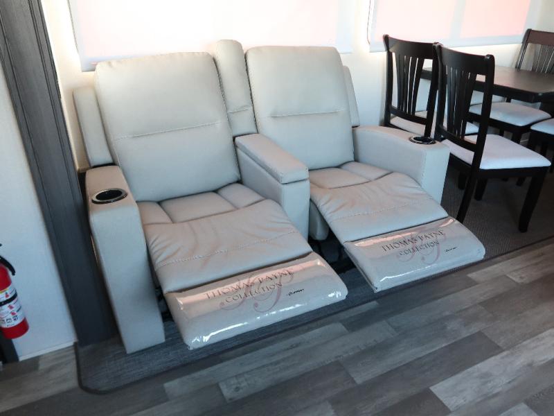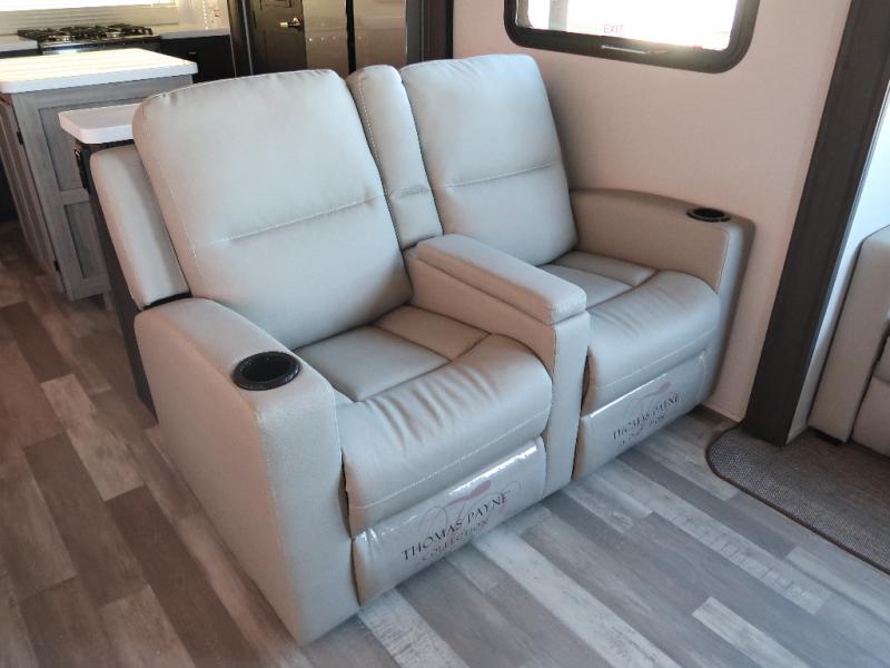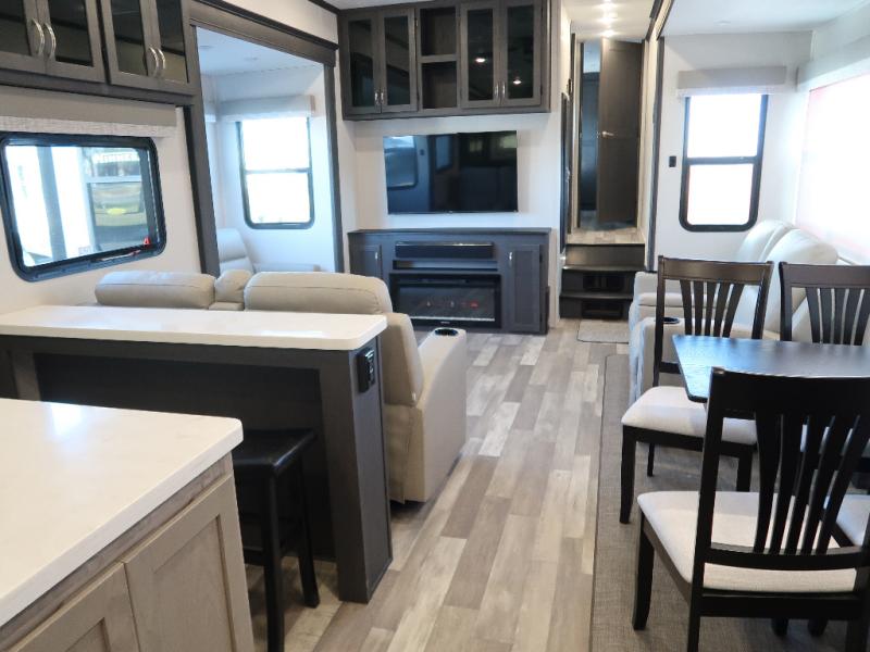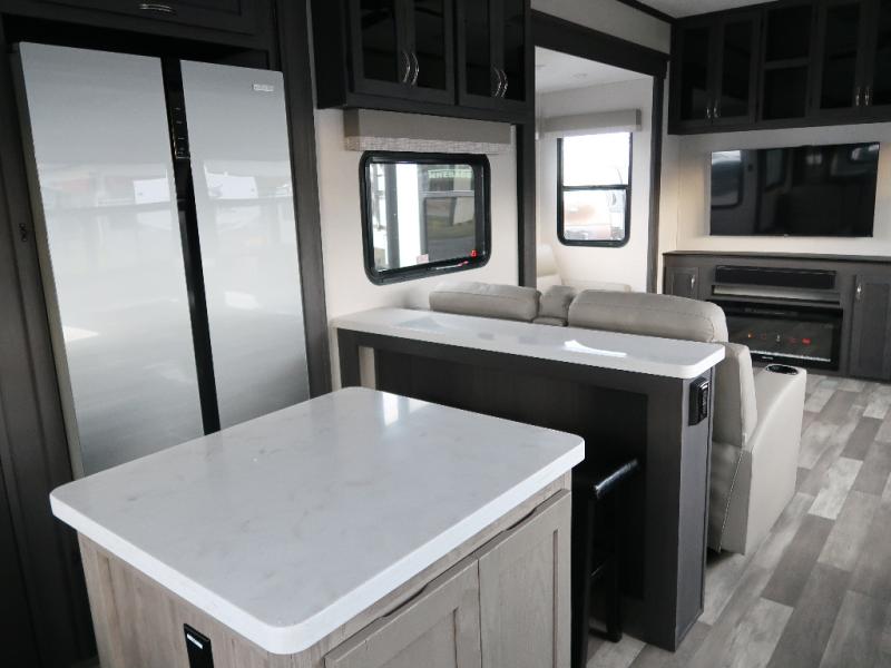 One look at this fifth wheel and you'll be sold. You'll find tons of counter space in the rear kitchen along with a kitchen island, a large pantry, and a hutch for even more storage. Visit in the main living area on the two theater seats and tri-fold sofa, or you may want to head outdoors under the two power awnings! There is even an outside refrigerator here to entertain guests. The spacious full bath will allow you to clean up after a day of adventuring, and here you'll find a full-size shower with sliding glass doors and a seat, plus a dual sink vanity. The front private bedroom will feel just like home with its king bed slide out, large wardrobe, and dresser to keep your clothes tidy.