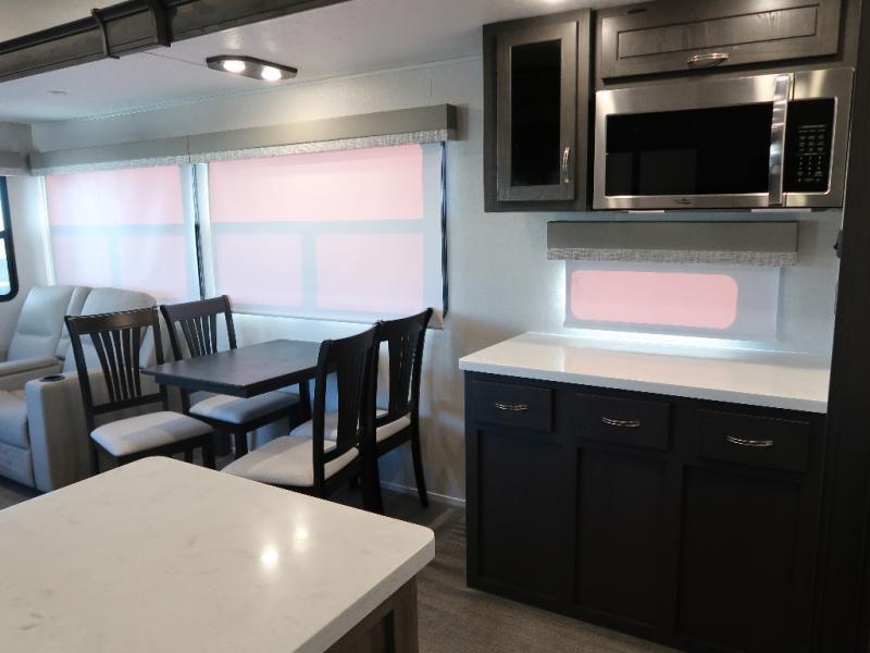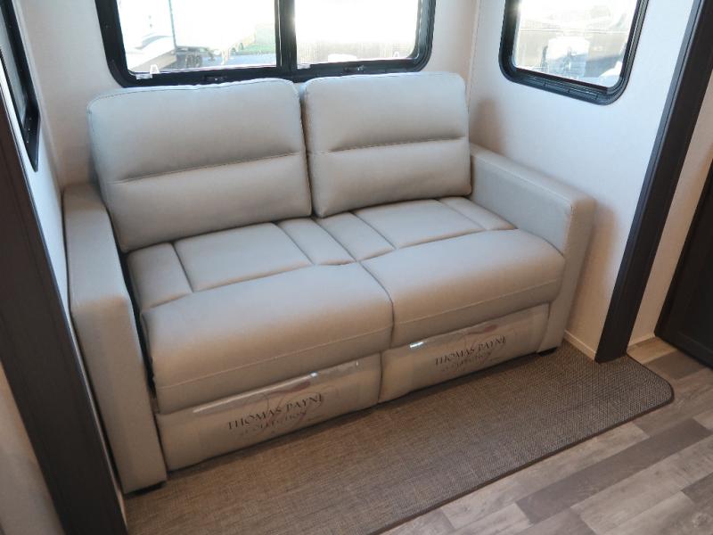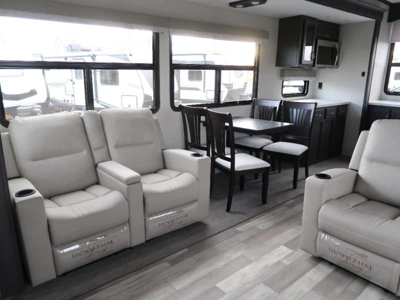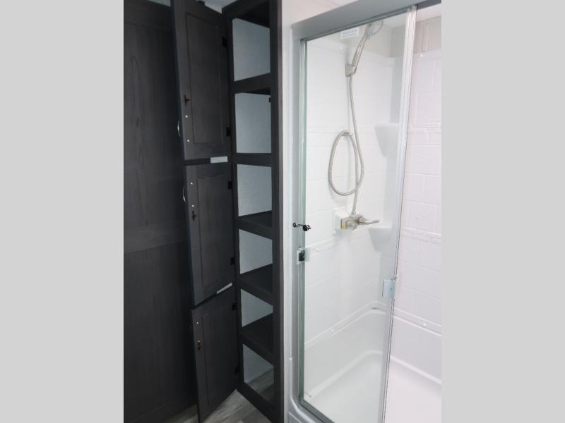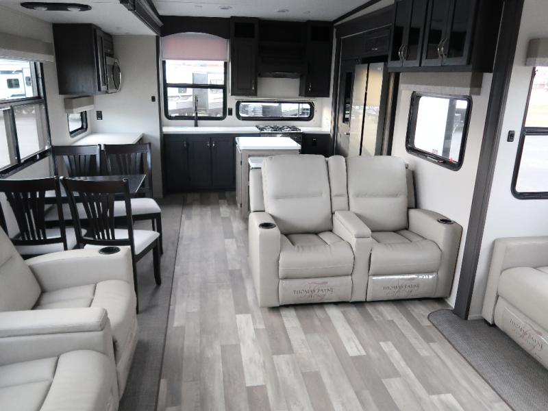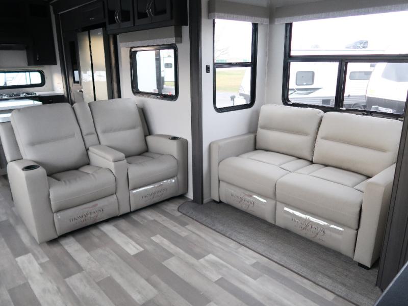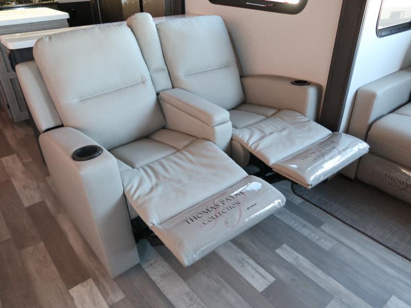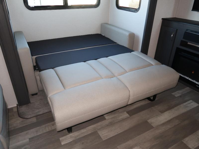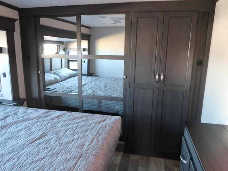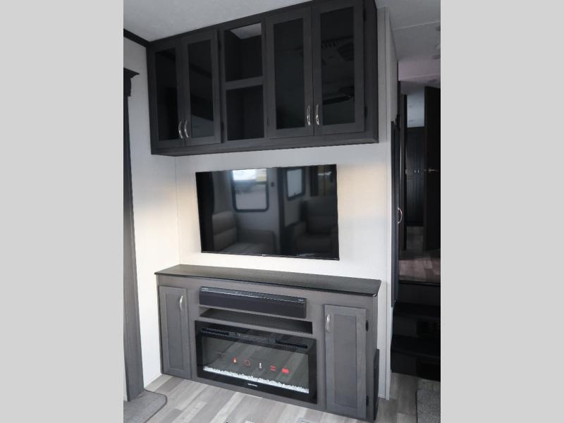 One look at this fifth wheel and you'll be sold. You'll find tons of counter space in the rear kitchen along with a kitchen island, a large pantry, and a hutch for even more storage. Visit in the main living area on the two theater seats and tri-fold sofa, or you may want to head outdoors under the two power awnings! There is even an outside refrigerator here to entertain guests. The spacious full bath will allow you to clean up after a day of adventuring, and here you'll find a full-size shower with sliding glass doors and a seat, plus a dual sink vanity. The front private bedroom will feel just like home with its king bed slide out, large wardrobe, and dresser to keep your clothes tidy.