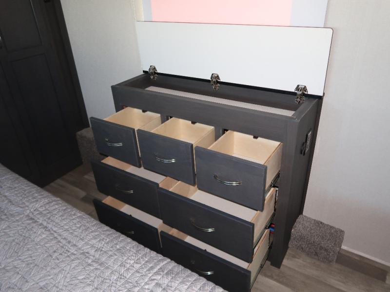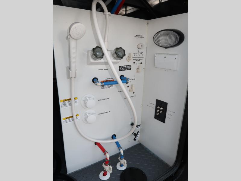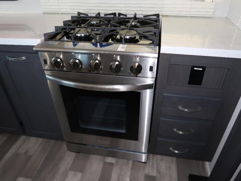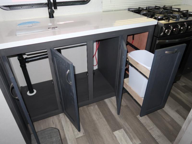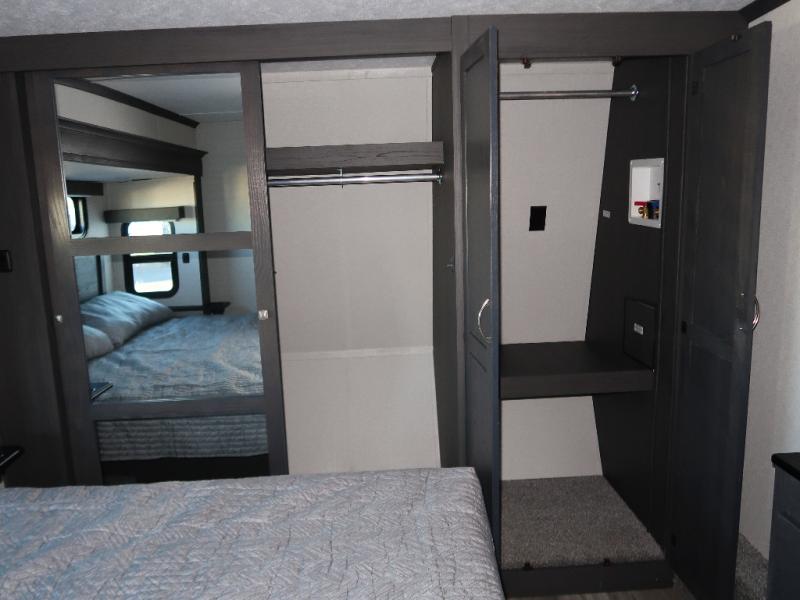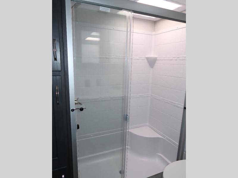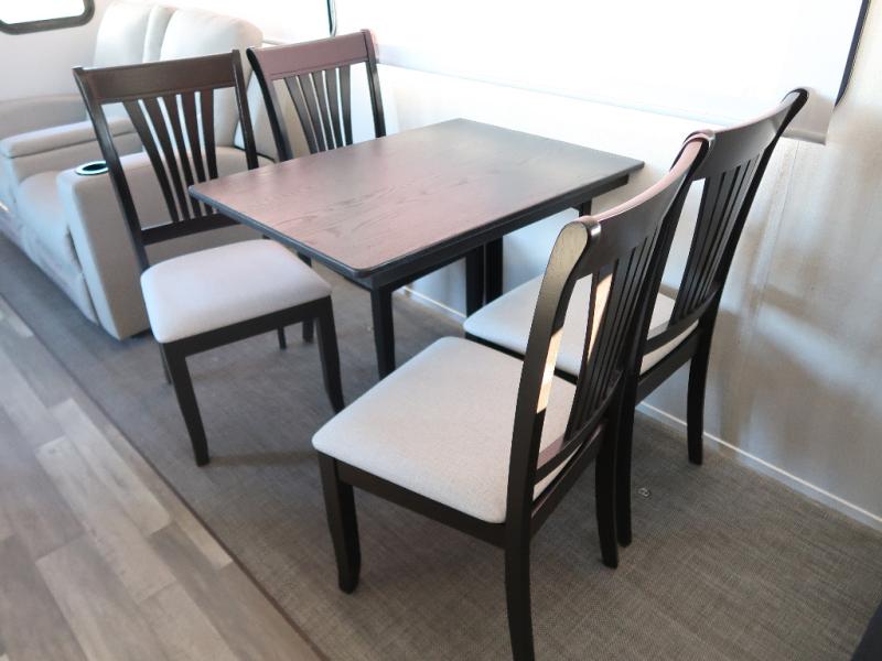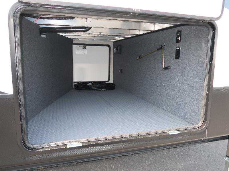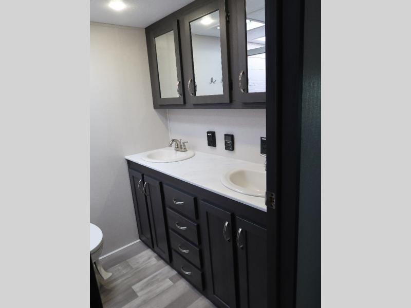 One look at this fifth wheel and you'll be sold. You'll find tons of counter space in the rear kitchen along with a kitchen island, a large pantry, and a hutch for even more storage. Visit in the main living area on the two theater seats and tri-fold sofa, or you may want to head outdoors under the two power awnings! There is even an outside refrigerator here to entertain guests. The spacious full bath will allow you to clean up after a day of adventuring, and here you'll find a full-size shower with sliding glass doors and a seat, plus a dual sink vanity. The front private bedroom will feel just like home with its king bed slide out, large wardrobe, and dresser to keep your clothes tidy.