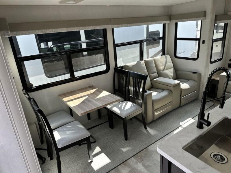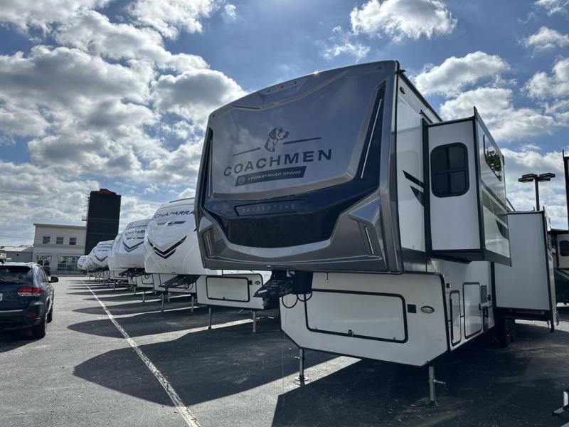 The Brookstone fifth wheels by Coachmen are coming to you with wide-body comfort, home-like amenities, and unique designs for a truly luxurious RV. The Weather Shield+ consists of a 6X double Azdel aluminum cage sidewall system, a Radiant Pro weather barrier system, and more that will help you extend your camping season or go full-time. Head inside to find solid surface countertops in the kitchen, an XL HD LED TV in the living room, slow rise roller night shades, and the list of comforts goes on! The Brookstone also includes 6-point electric auto-leveling, four Solid Step entry steps, an electric awning with LED lights, and many more exterior conveniences!