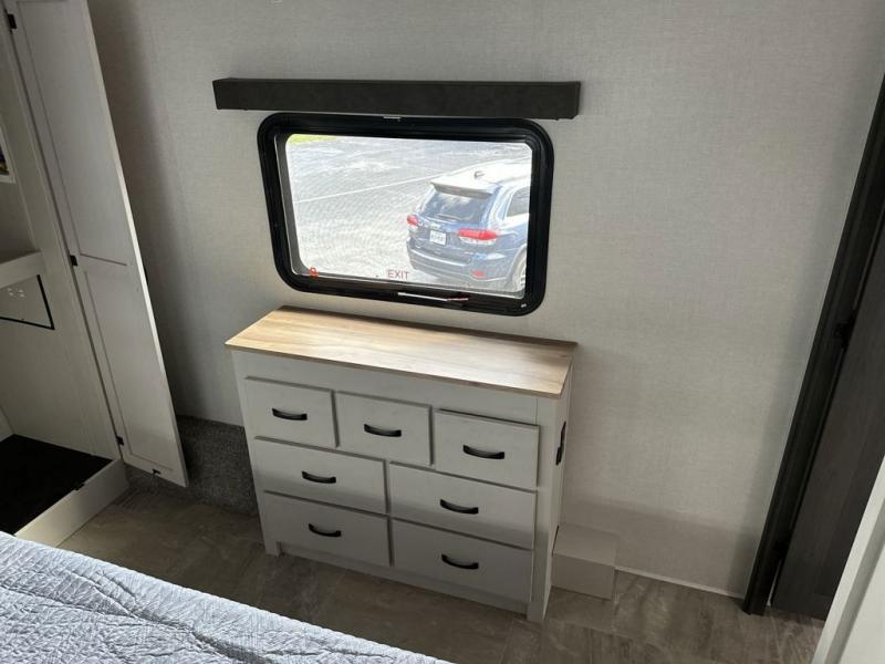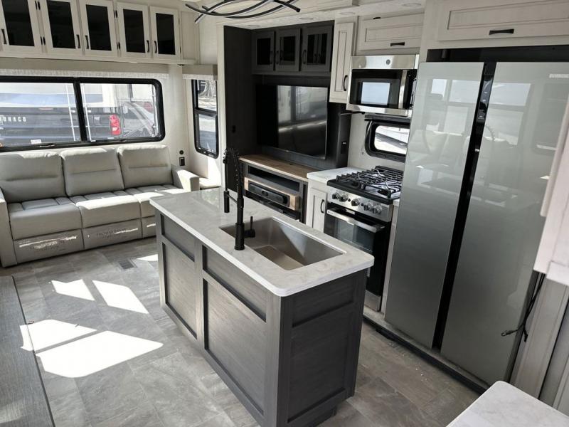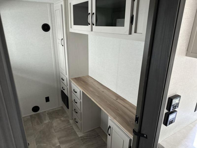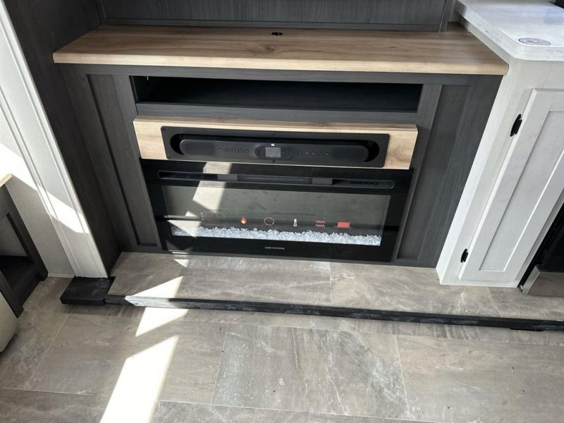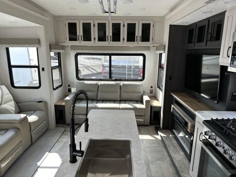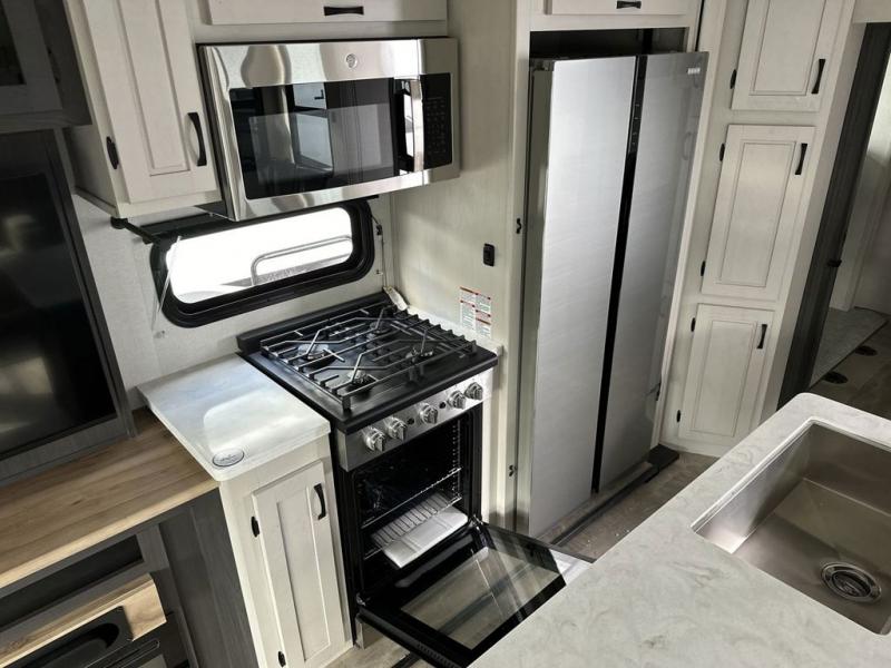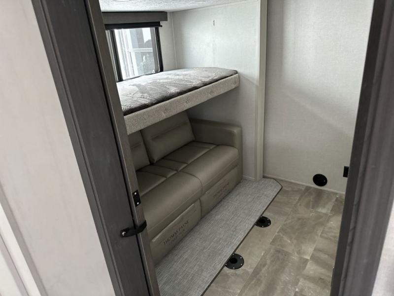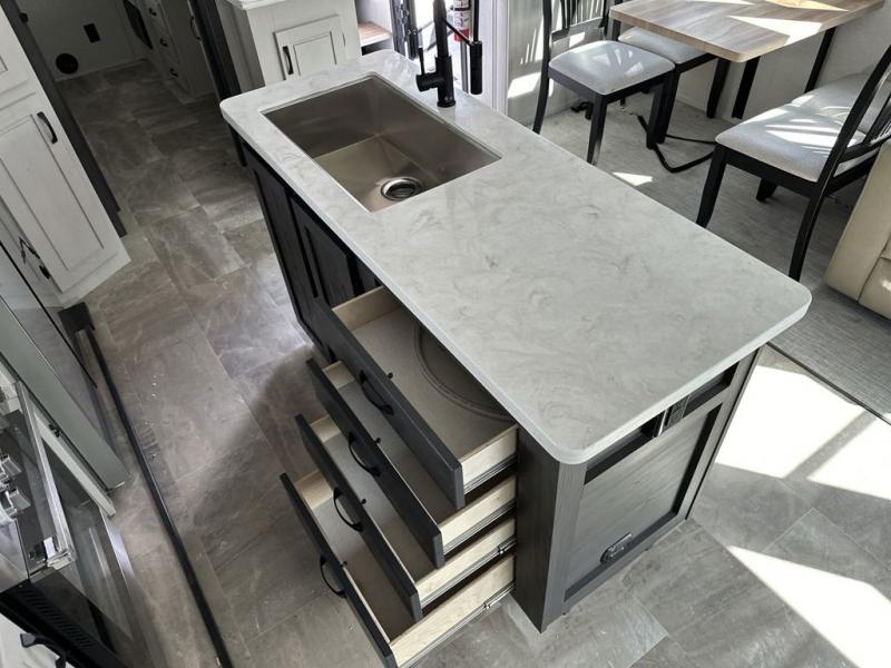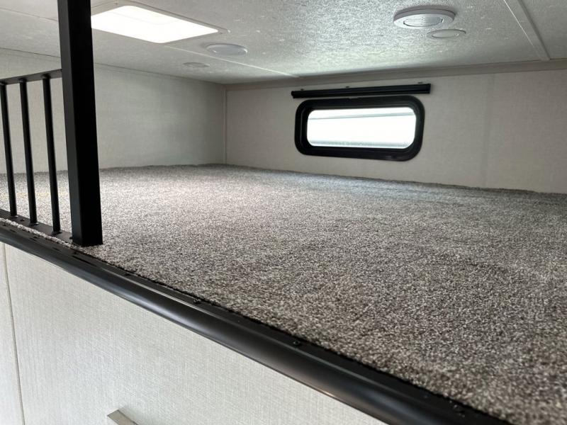 This family-friendly fifth wheel can sleep six to eight comfortably between the king bed, the tri-fold sofa, and the middle bunkhouse with a loft above! There is plenty of counter space in the bunkhouse, plus a sofa with a removable table and a wardrobe for clothes. The kitchen is any chef's dream with its residential cooktop, 15.6 cu. ft. 12V refrigerator, and kitchen island for more counter space. While dinner is being made, you can play a game of cards at the free-standing table, relax on the tri-fold sofa, or visit outdoors under the 20' power awning with LED lights. You won't be left wanting for storage space in this model thanks to the overhead cabinets, plus the bedroom dresser and large wardrobe. There is even a wardrobe with washer and dryer prep if you choose to go full-time!