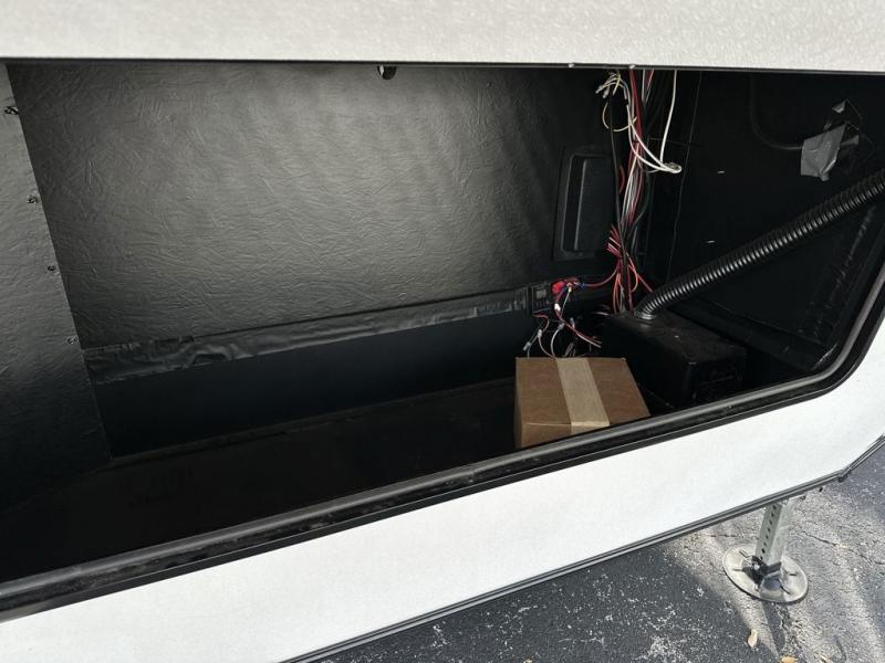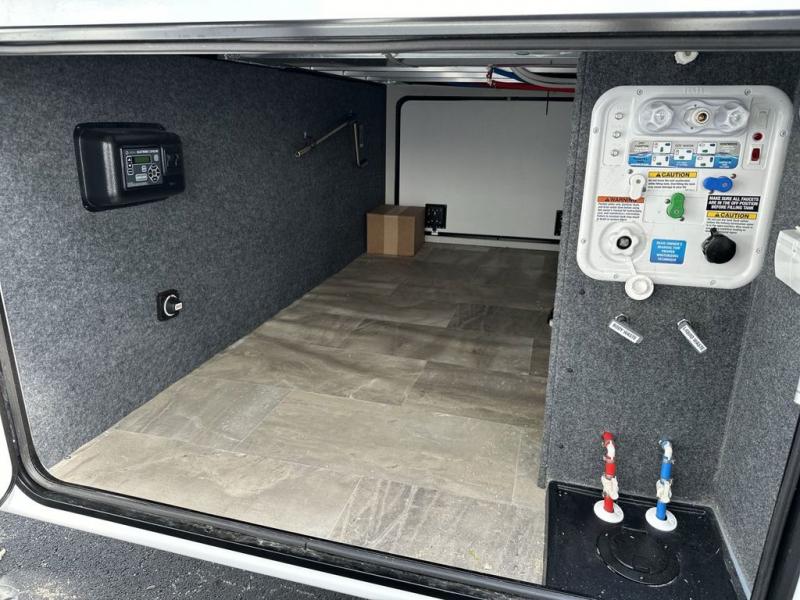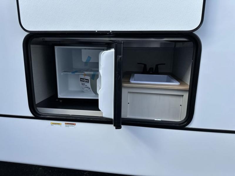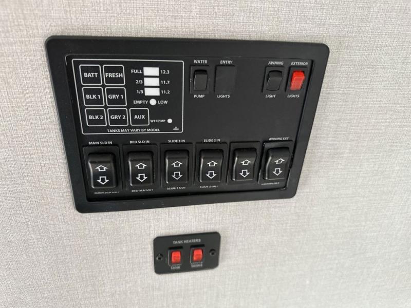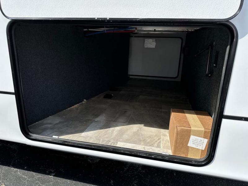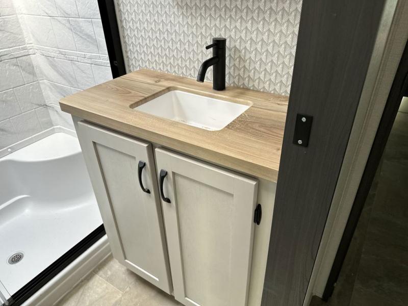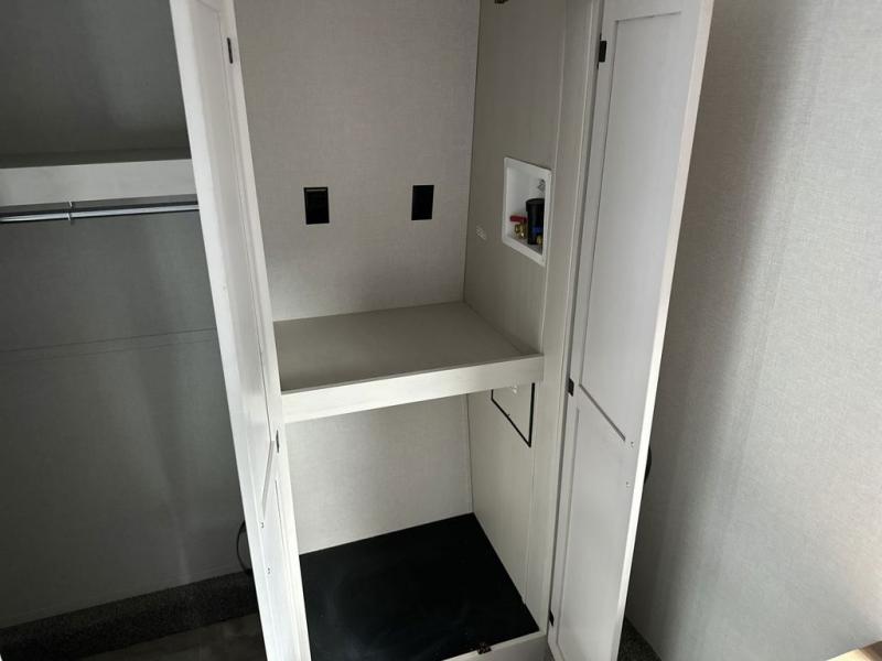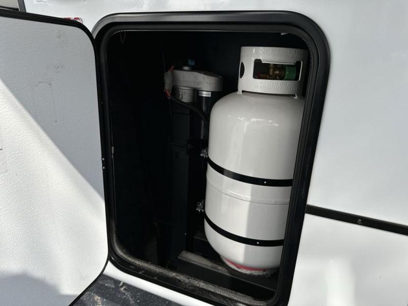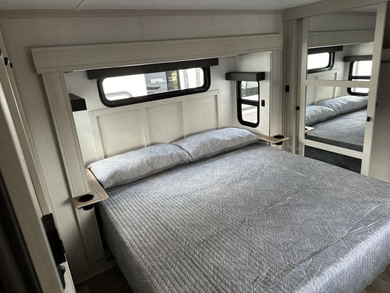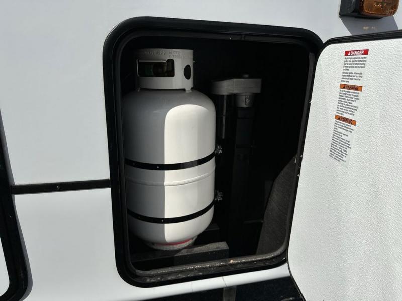 This family-friendly fifth wheel can sleep six to eight comfortably between the king bed, the tri-fold sofa, and the middle bunkhouse with a loft above! There is plenty of counter space in the bunkhouse, plus a sofa with a removable table and a wardrobe for clothes. The kitchen is any chef's dream with its residential cooktop, 15.6 cu. ft. 12V refrigerator, and kitchen island for more counter space. While dinner is being made, you can play a game of cards at the free-standing table, relax on the tri-fold sofa, or visit outdoors under the 20' power awning with LED lights. You won't be left wanting for storage space in this model thanks to the overhead cabinets, plus the bedroom dresser and large wardrobe. There is even a wardrobe with washer and dryer prep if you choose to go full-time!