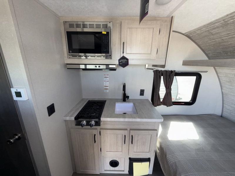 Lightweight camping is easier than you think with this travel trailer in tow! The front 54" x 74" queen bed will provide a great night's rest each night, while the little ones or your guests take the bunk beds. There is a handy shelf above the front bed for your belongings plus additional bedroom storage. A private bath includes a 24" x 32" shower and a toilet with a mirror behind it so you can freshen up each day. You'll also find a two burner cooktop and microwave oven to make meals each day plus a 3.3 cu. ft. 12V refrigerator for food storage!