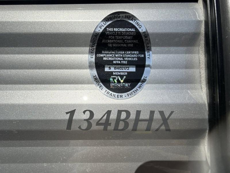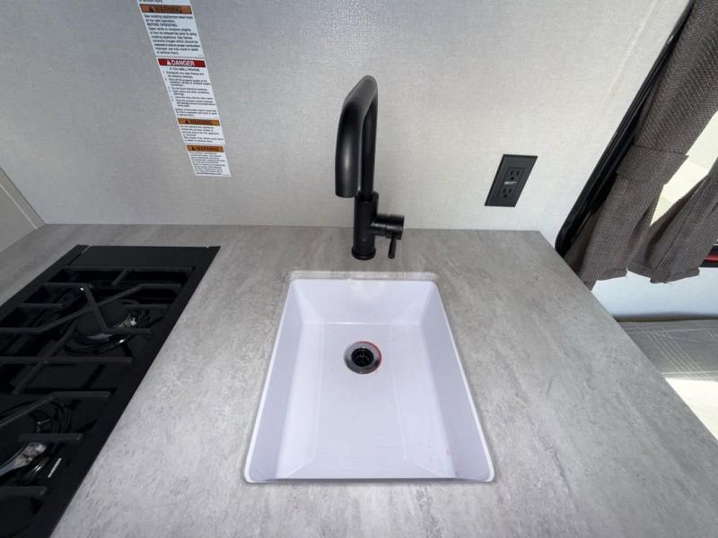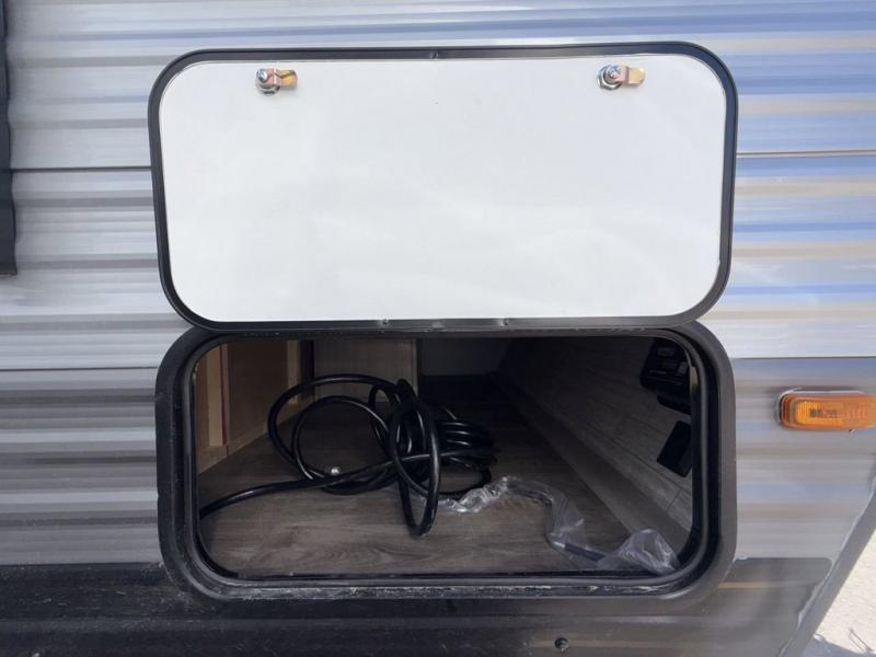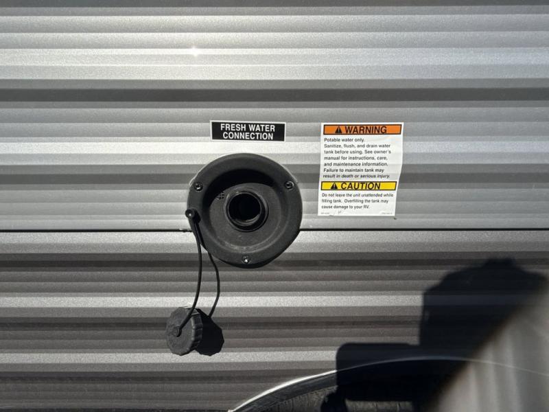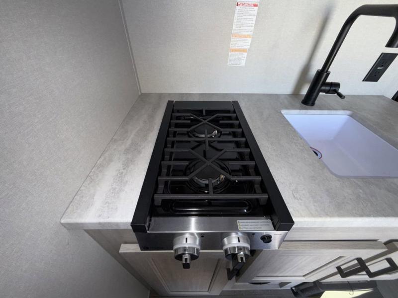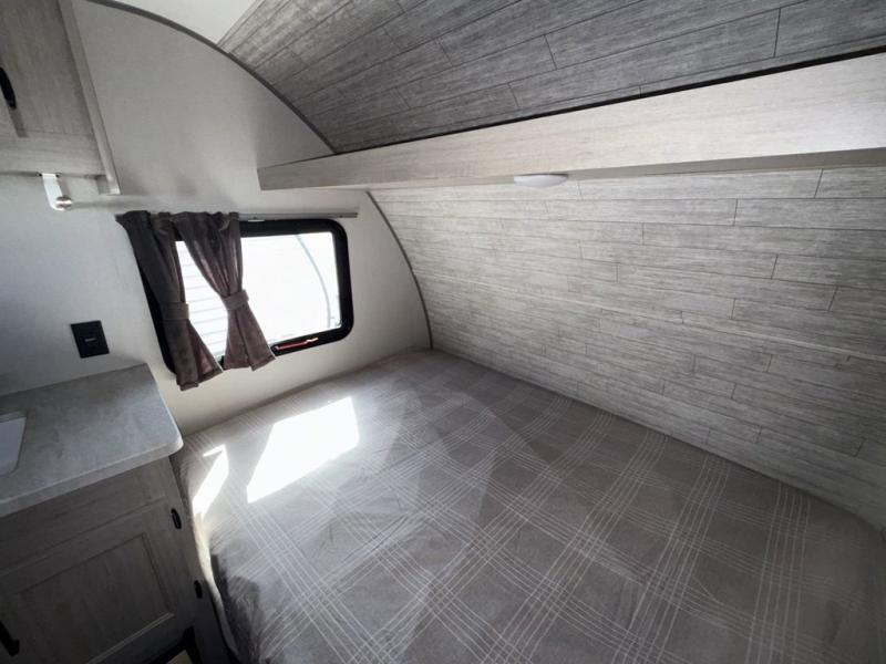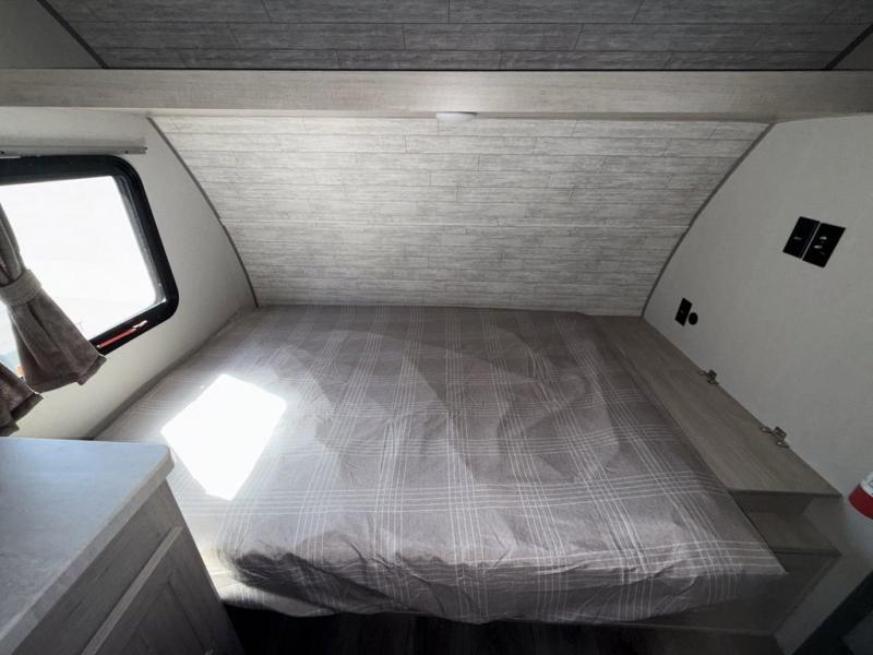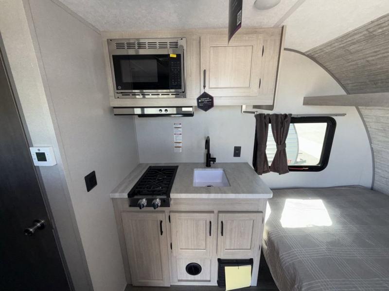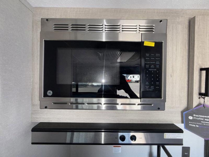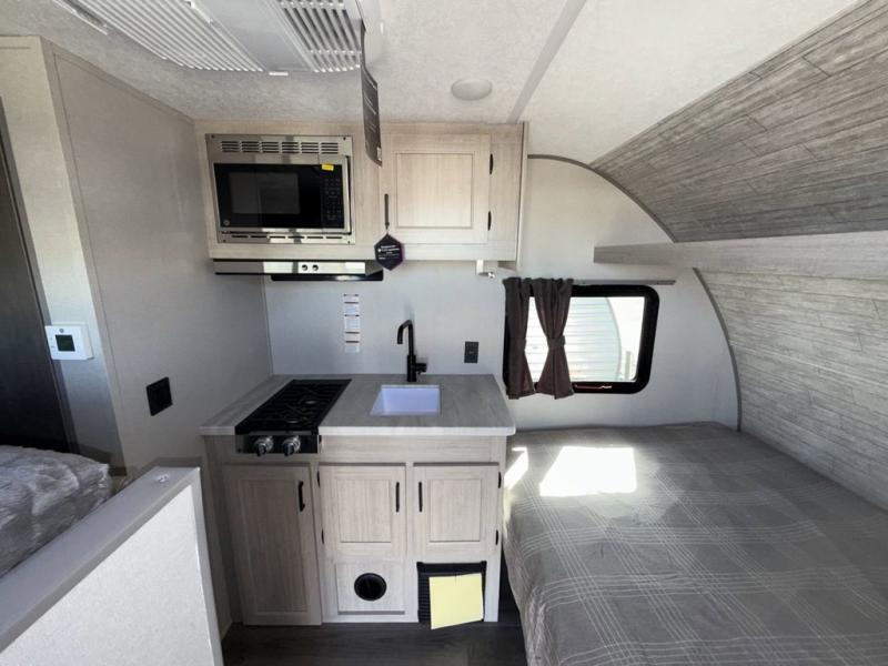 Lightweight camping is easier than you think with this travel trailer in tow! The front 54" x 74" queen bed will provide a great night's rest each night, while the little ones or your guests take the bunk beds. There is a handy shelf above the front bed for your belongings plus additional bedroom storage. A private bath includes a 24" x 32" shower and a toilet with a mirror behind it so you can freshen up each day. You'll also find a two burner cooktop and microwave oven to make meals each day plus a 3.3 cu. ft. 12V refrigerator for food storage!