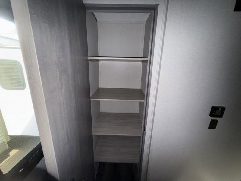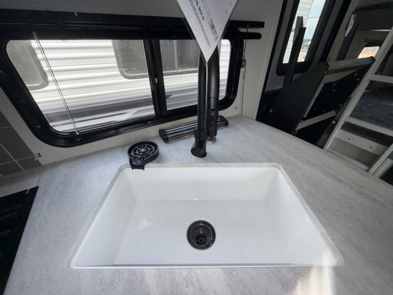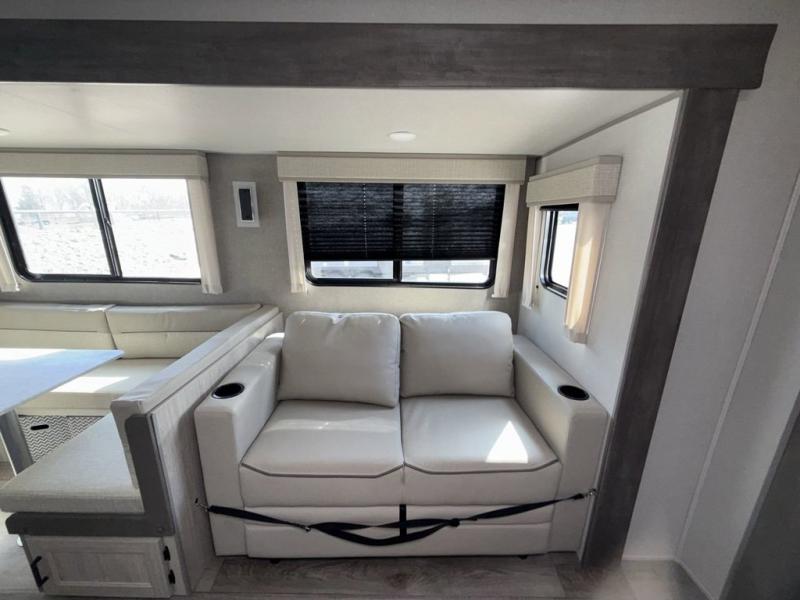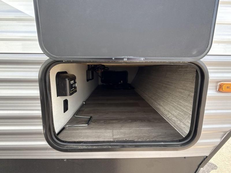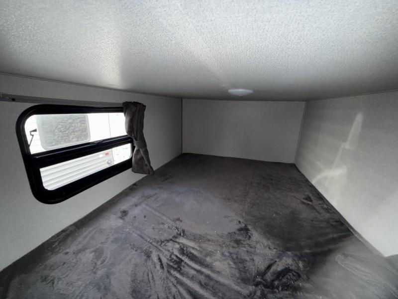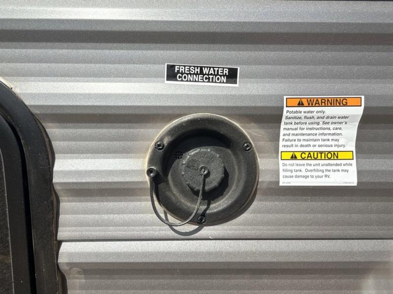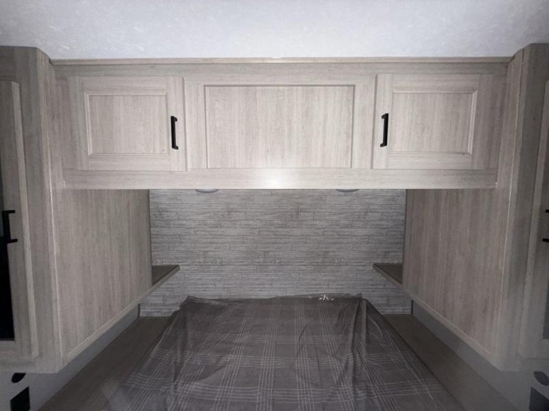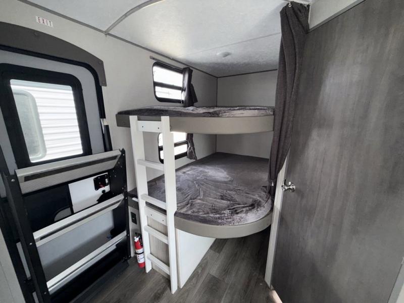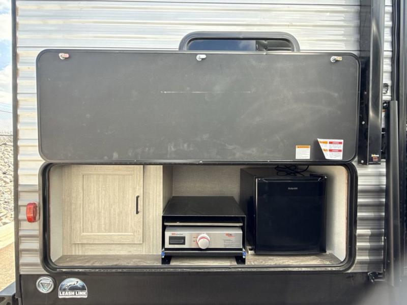 When you enjoy camping with your own accommodations and space for the whole crew, hitch this trailer up and head to the campgrounds! After loading everything easily thanks to the dual entry doors and all the interior and exterior storage, you will have no worries that you left anything behind. The electric awning is easy to set up, like the large slide out, and the awning offers multicolor LED lights to choose from by using the remote. When you are outside the cook might like to make a meal using the outside camper kitchen. The interior kitchen offers full amenities including a pantry, and everyone can enjoy the angled entertainment center. There are double-size bunks with a ladder for the kids and a walk-around queen bed for the owner to sleep on, plus furniture in the living area that doubles as additional sleeping space!