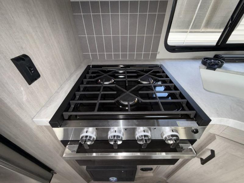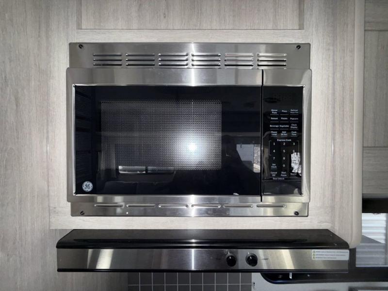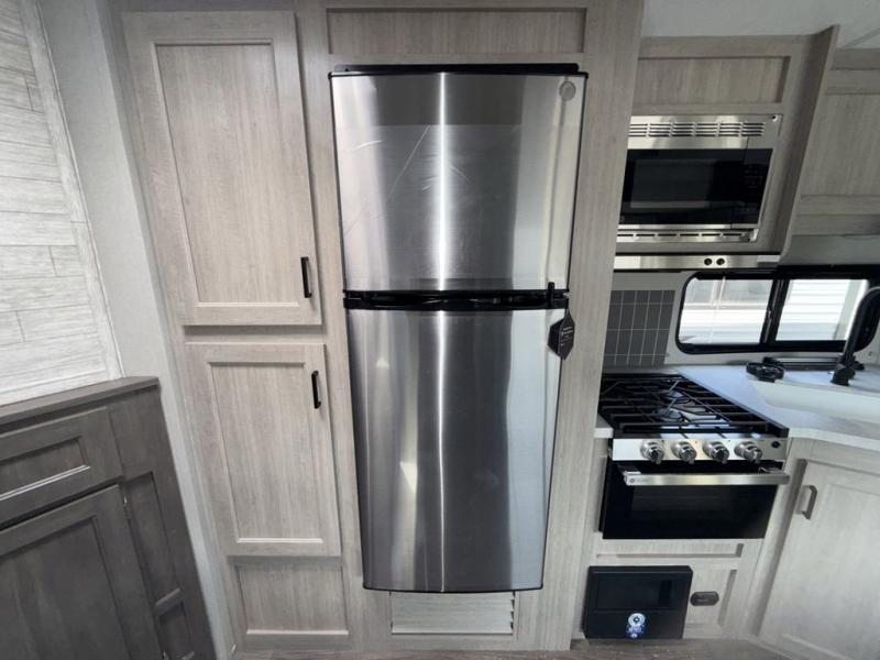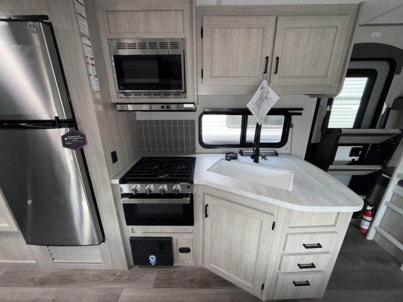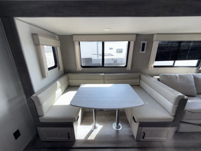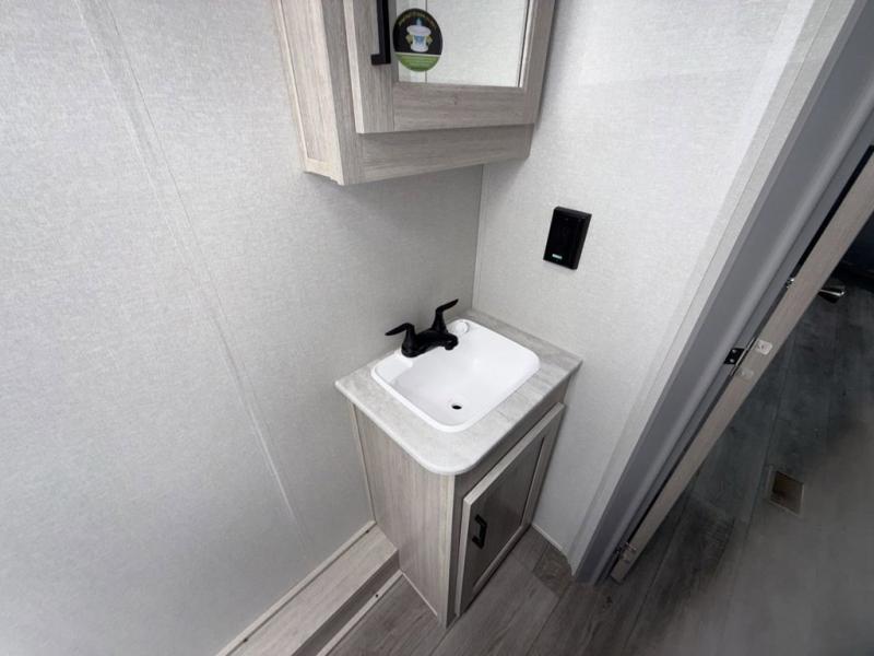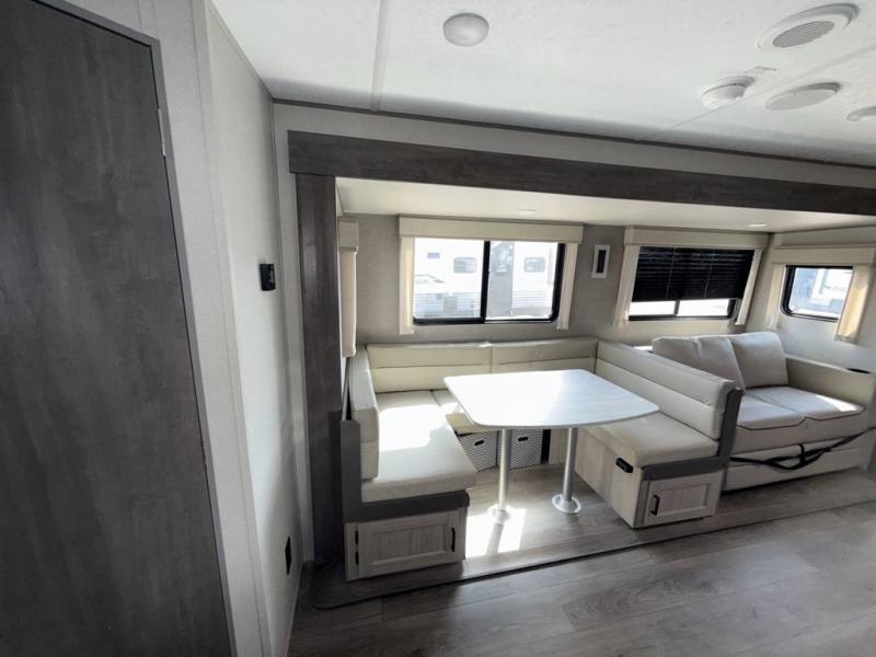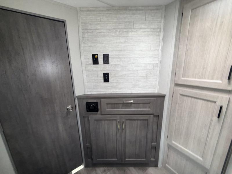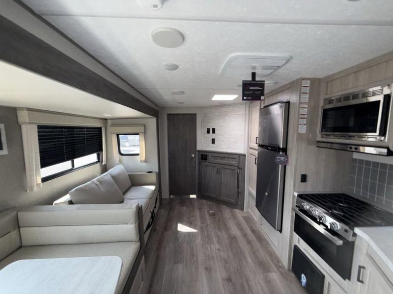 When you enjoy camping with your own accommodations and space for the whole crew, hitch this trailer up and head to the campgrounds! After loading everything easily thanks to the dual entry doors and all the interior and exterior storage, you will have no worries that you left anything behind. The electric awning is easy to set up, like the large slide out, and the awning offers multicolor LED lights to choose from by using the remote. When you are outside the cook might like to make a meal using the outside camper kitchen. The interior kitchen offers full amenities including a pantry, and everyone can enjoy the angled entertainment center. There are double-size bunks with a ladder for the kids and a walk-around queen bed for the owner to sleep on, plus furniture in the living area that doubles as additional sleeping space!