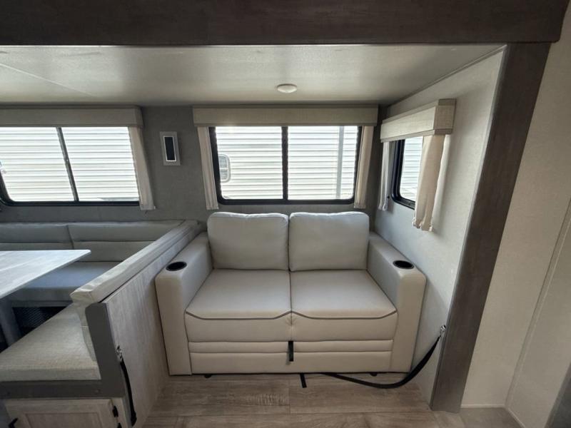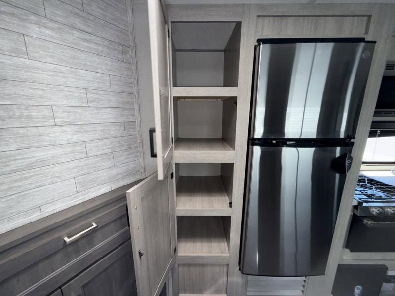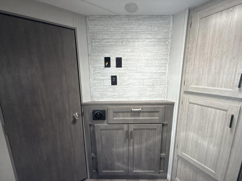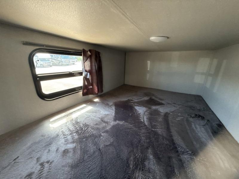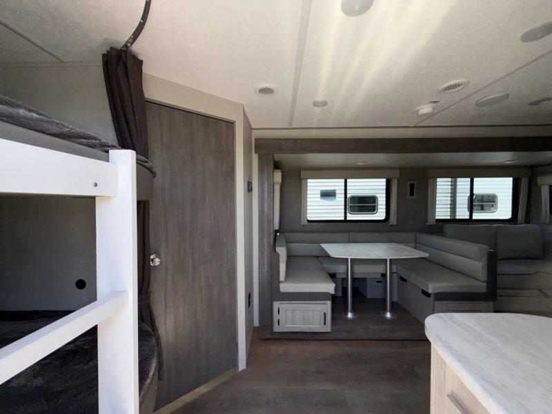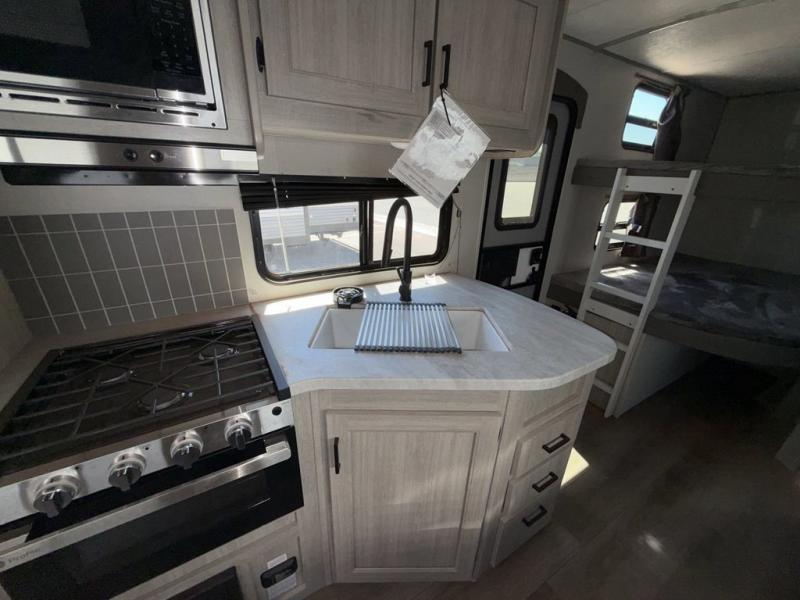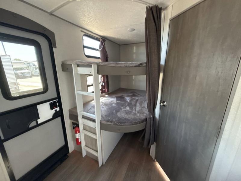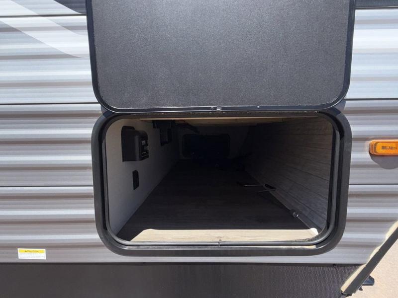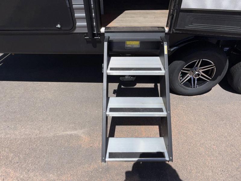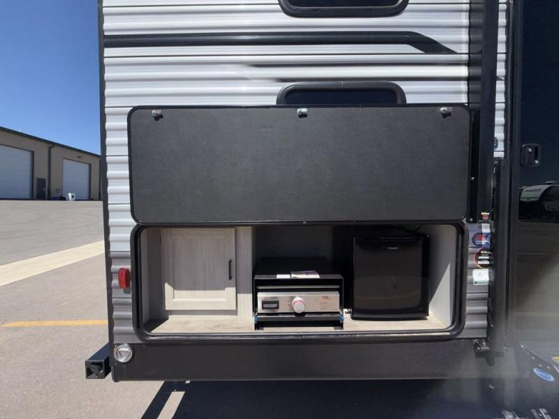 When you enjoy camping with your own accommodations and space for the whole crew, hitch this trailer up and head to the campgrounds! After loading everything easily thanks to the dual entry doors and all the interior and exterior storage, you will have no worries that you left anything behind. The electric awning is easy to set up, like the large slide out, and the awning offers multicolor LED lights to choose from by using the remote. When you are outside the cook might like to make a meal using the outside camper kitchen. The interior kitchen offers full amenities including a pantry, and everyone can enjoy the angled entertainment center. There are double-size bunks with a ladder for the kids and a walk-around queen bed for the owner to sleep on, plus furniture in the living area that doubles as additional sleeping space!