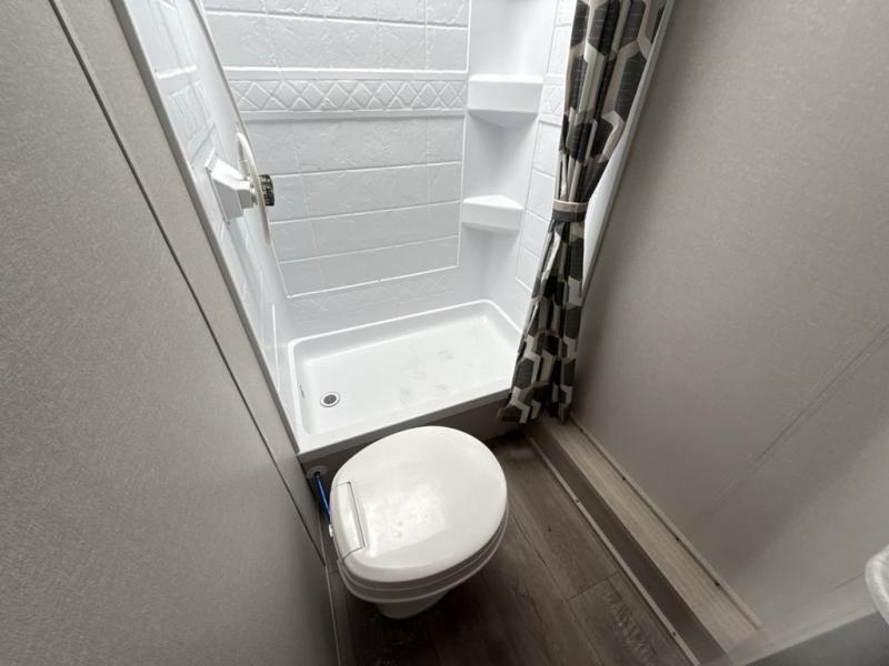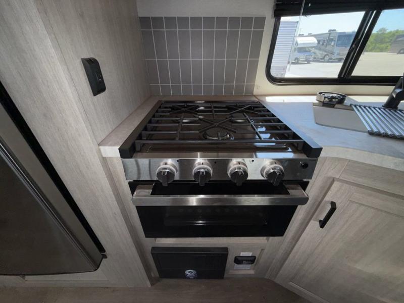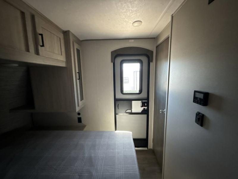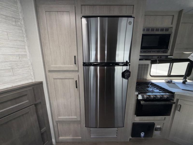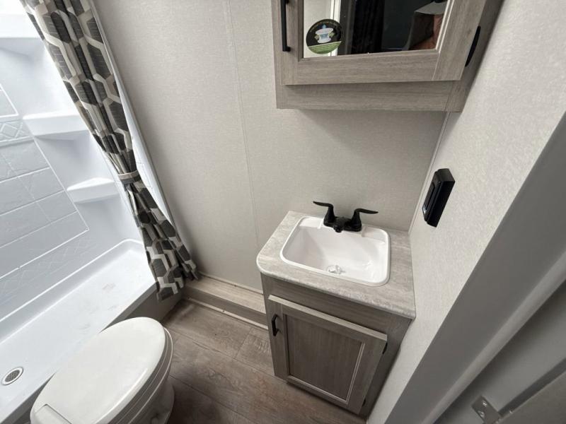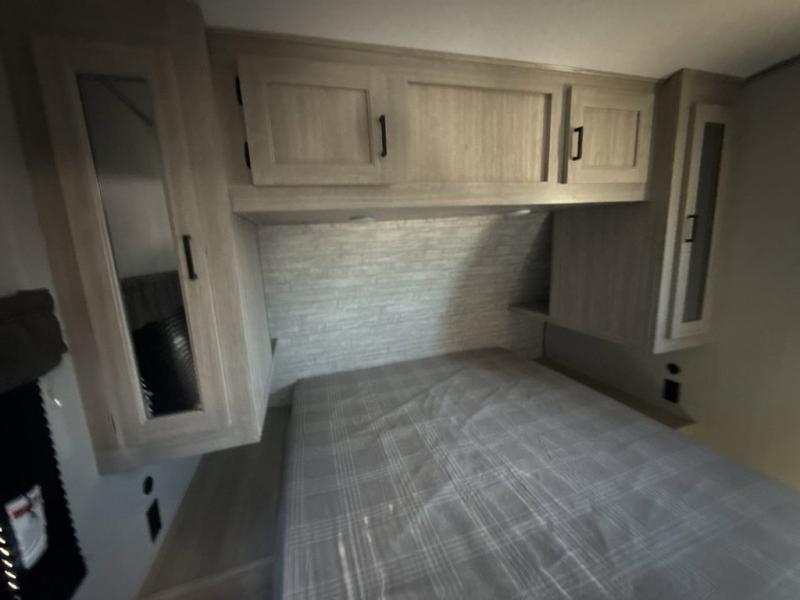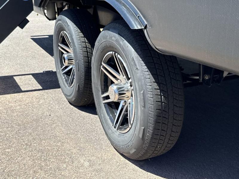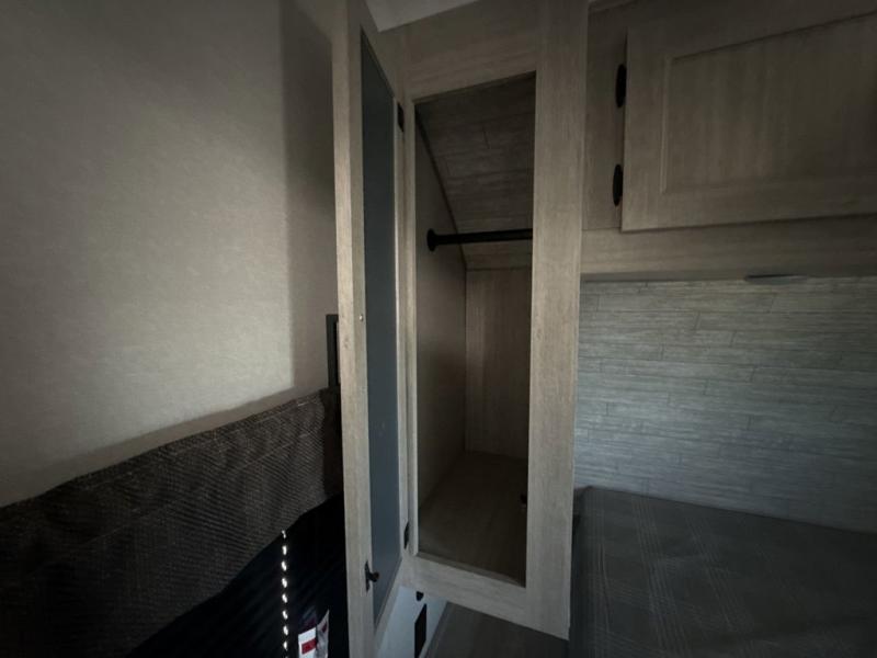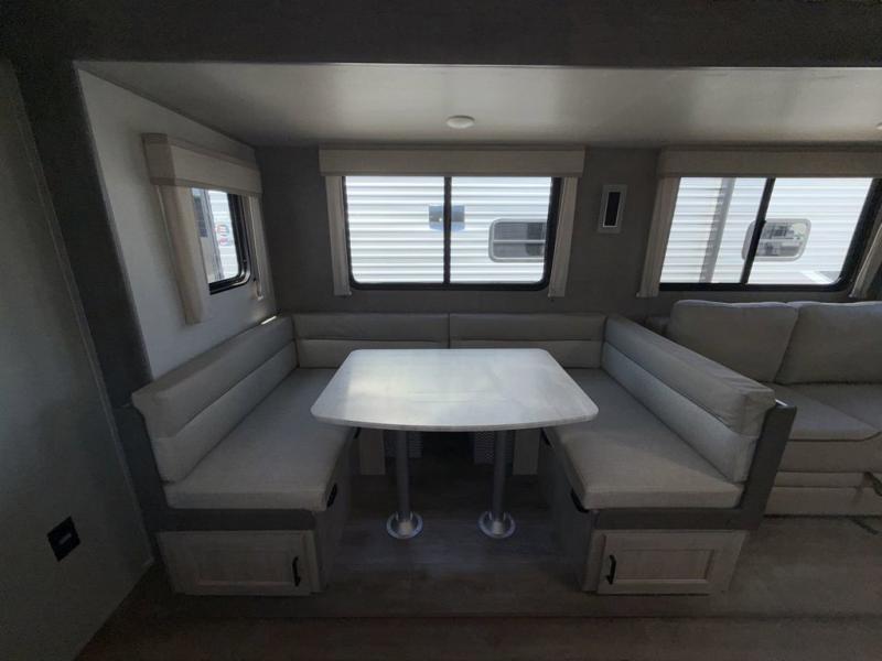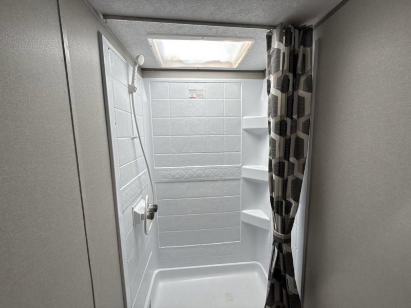 When you enjoy camping with your own accommodations and space for the whole crew, hitch this trailer up and head to the campgrounds! After loading everything easily thanks to the dual entry doors and all the interior and exterior storage, you will have no worries that you left anything behind. The electric awning is easy to set up, like the large slide out, and the awning offers multicolor LED lights to choose from by using the remote. When you are outside the cook might like to make a meal using the outside camper kitchen. The interior kitchen offers full amenities including a pantry, and everyone can enjoy the angled entertainment center. There are double-size bunks with a ladder for the kids and a walk-around queen bed for the owner to sleep on, plus furniture in the living area that doubles as additional sleeping space!