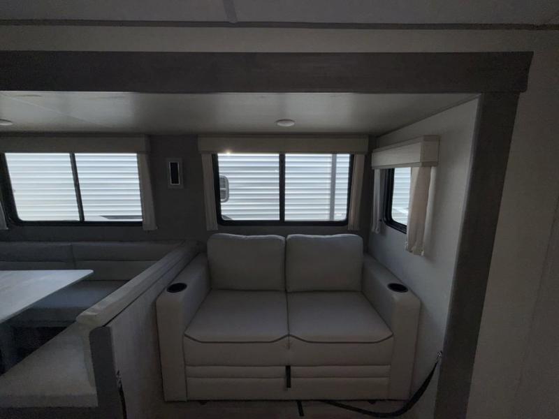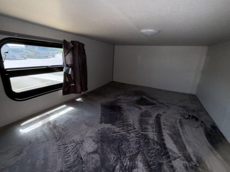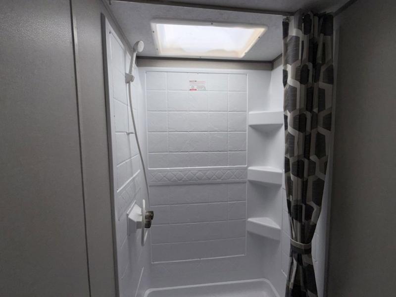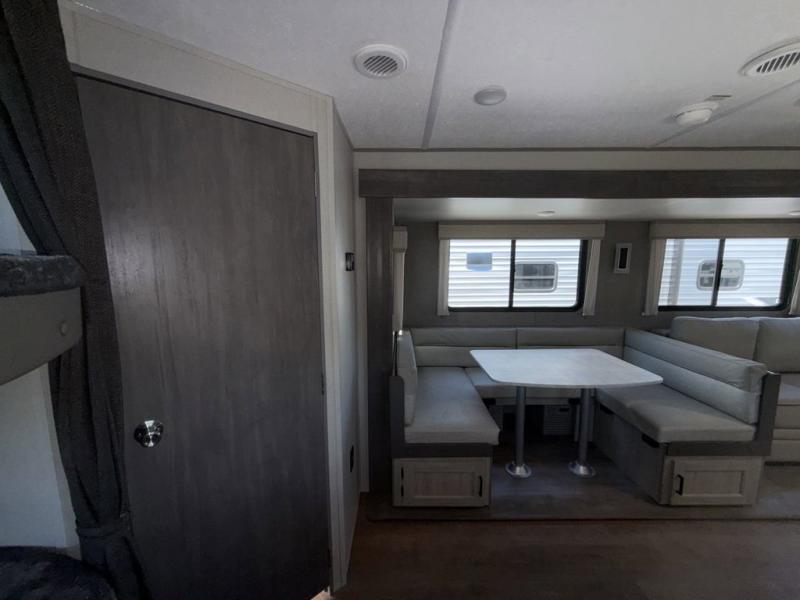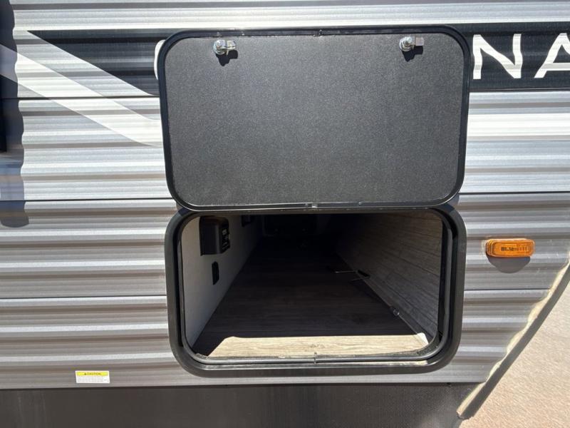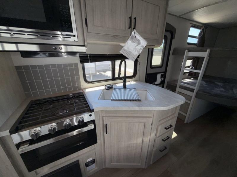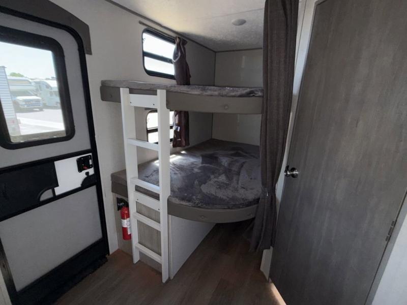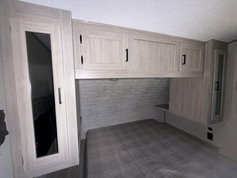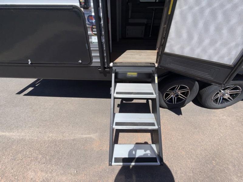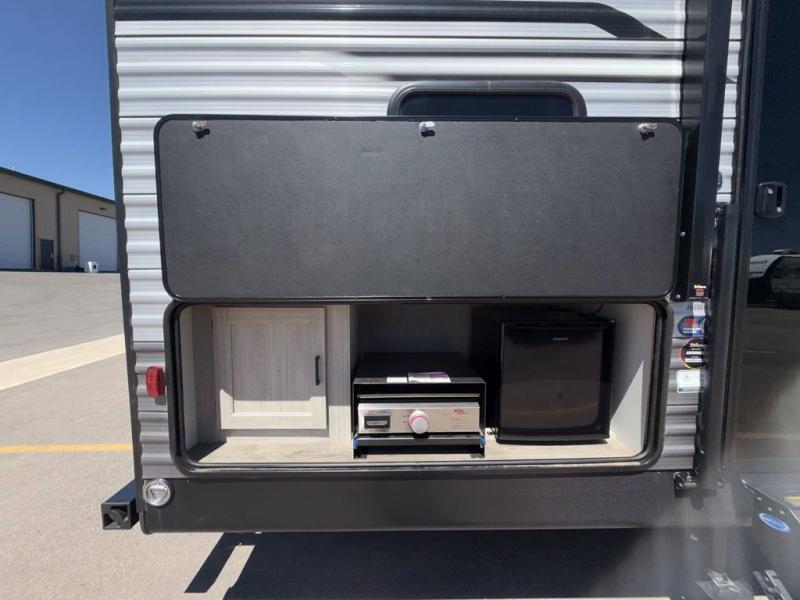 When you enjoy camping with your own accommodations and space for the whole crew, hitch this trailer up and head to the campgrounds! After loading everything easily thanks to the dual entry doors and all the interior and exterior storage, you will have no worries that you left anything behind. The electric awning is easy to set up, like the large slide out, and the awning offers multicolor LED lights to choose from by using the remote. When you are outside the cook might like to make a meal using the outside camper kitchen. The interior kitchen offers full amenities including a pantry, and everyone can enjoy the angled entertainment center. There are double-size bunks with a ladder for the kids and a walk-around queen bed for the owner to sleep on, plus furniture in the living area that doubles as additional sleeping space!