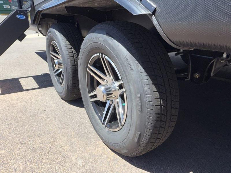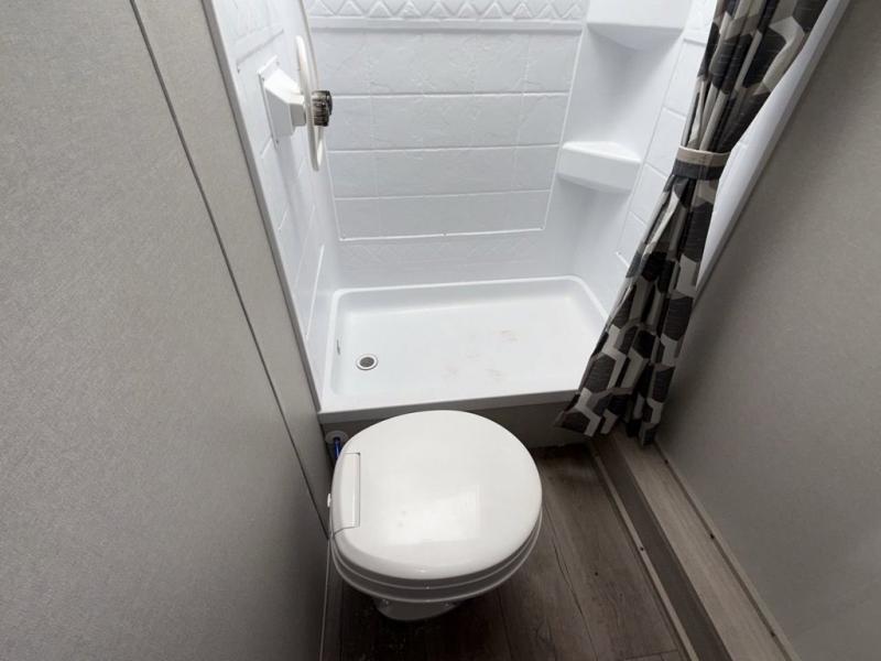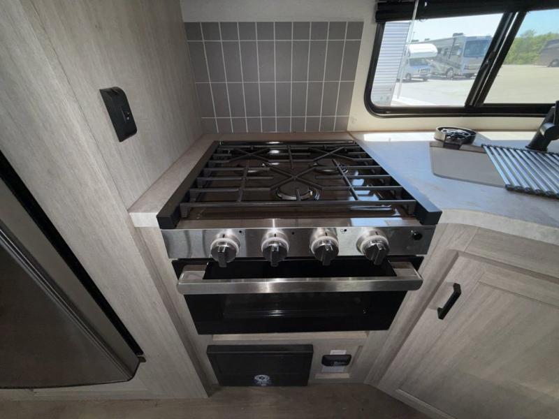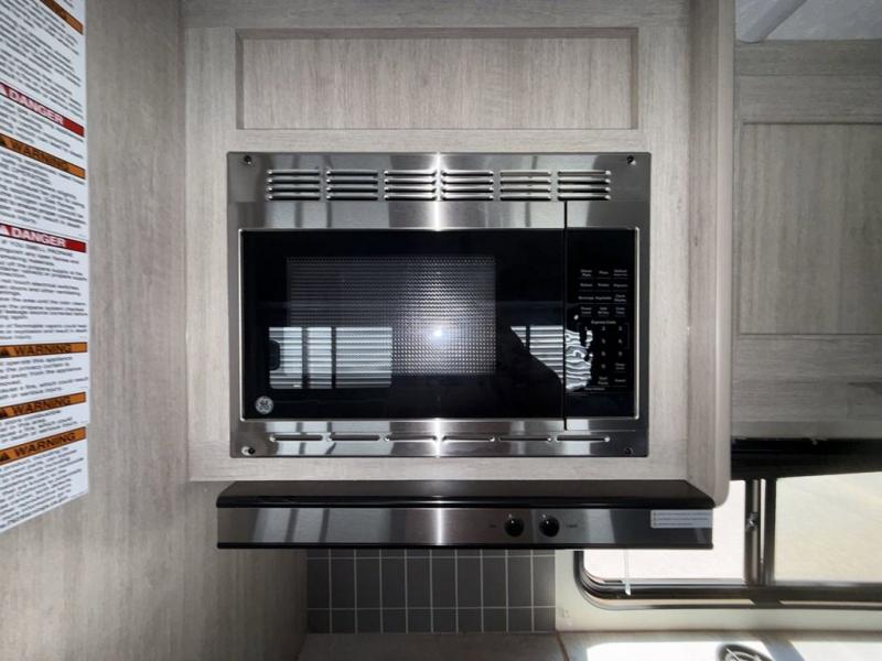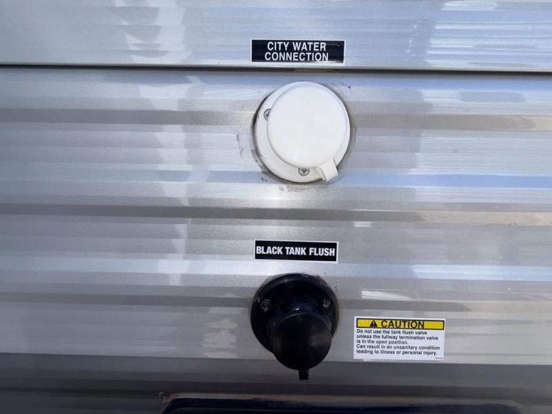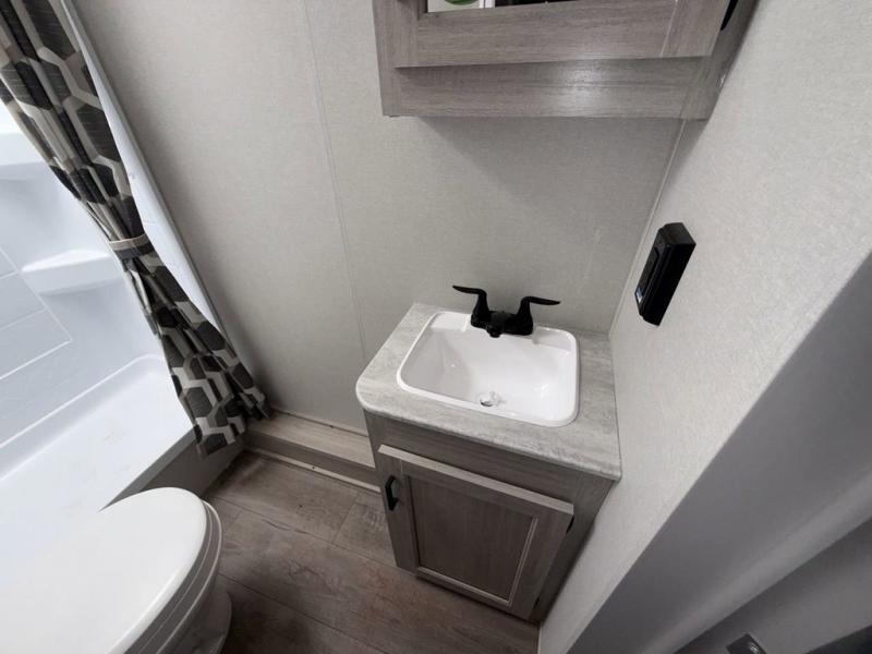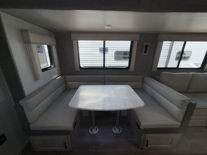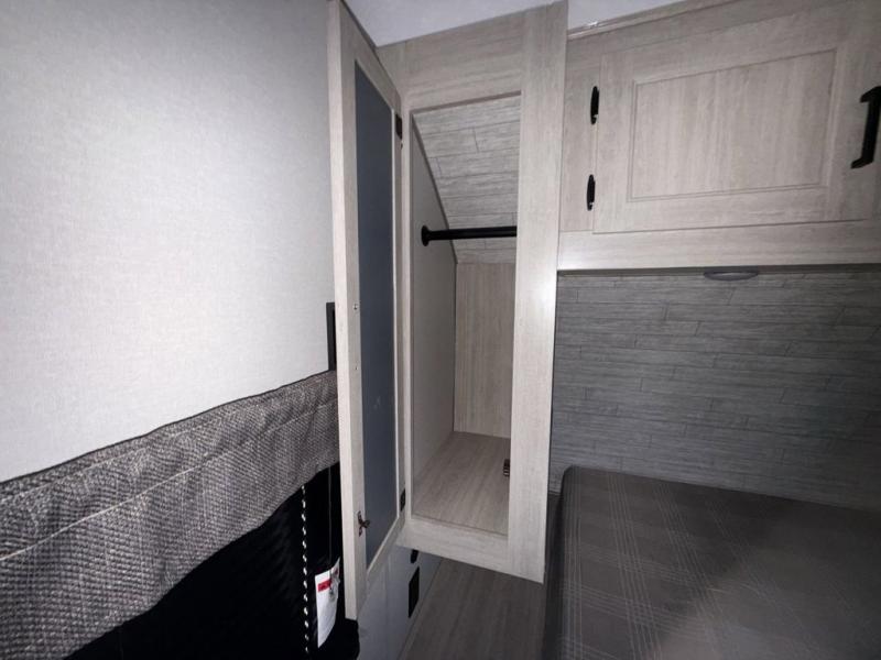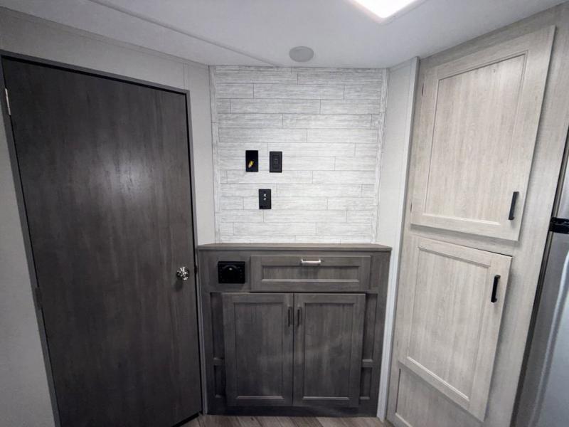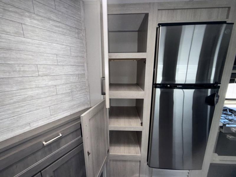 When you enjoy camping with your own accommodations and space for the whole crew, hitch this trailer up and head to the campgrounds! After loading everything easily thanks to the dual entry doors and all the interior and exterior storage, you will have no worries that you left anything behind. The electric awning is easy to set up, like the large slide out, and the awning offers multicolor LED lights to choose from by using the remote. When you are outside the cook might like to make a meal using the outside camper kitchen. The interior kitchen offers full amenities including a pantry, and everyone can enjoy the angled entertainment center. There are double-size bunks with a ladder for the kids and a walk-around queen bed for the owner to sleep on, plus furniture in the living area that doubles as additional sleeping space!