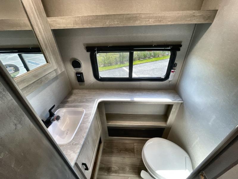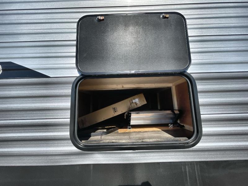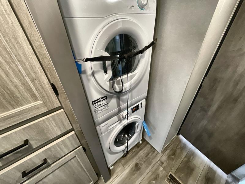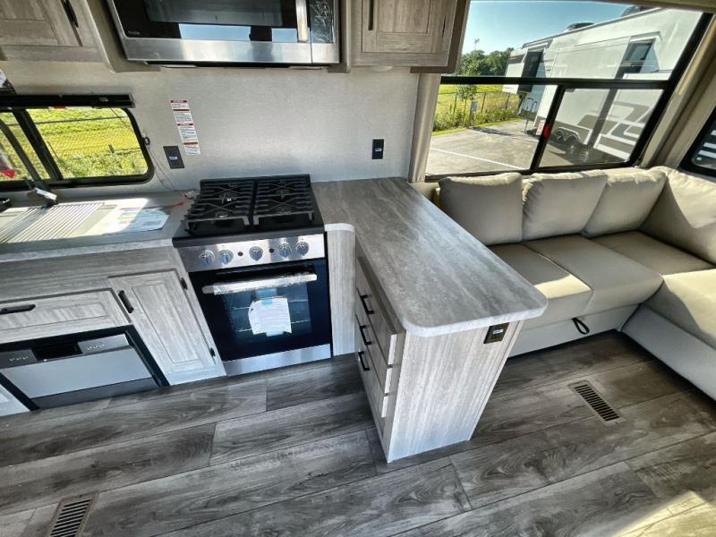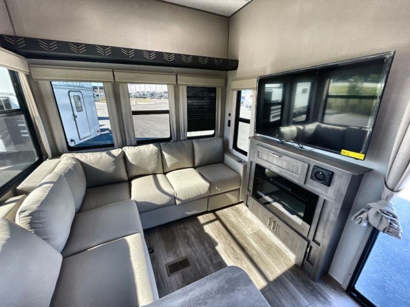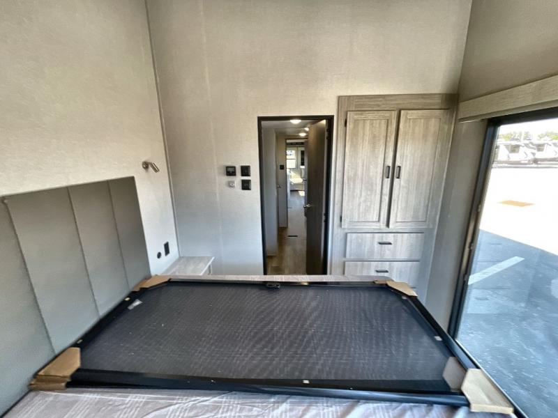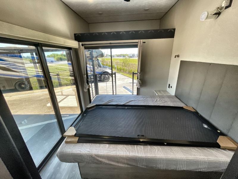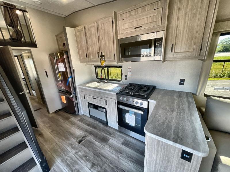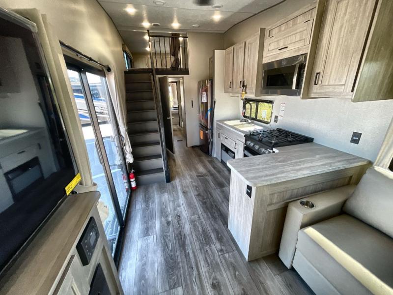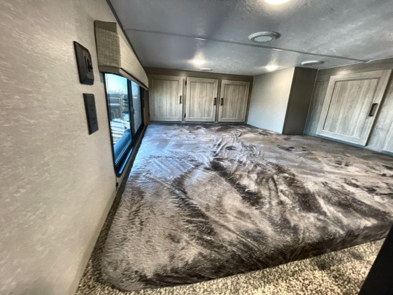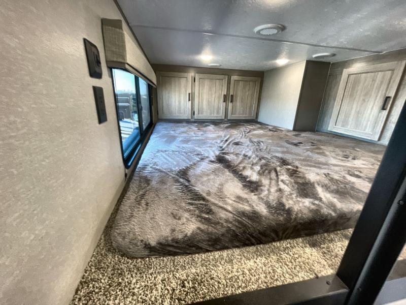 Plan to stay awhile in this spacious destination trailer with a loft! The loft includes cabinets so the little ones can keep their things picked up, and you'll appreciate tons of storage on the main level as well. You'll find your own space in the rear bedroom that includes a patio door that leads to the covered porch, a 60" x 74" queen bed, a wardrobe with drawers, plus a high ceiling that will make this space feel more open. There is a 48" x 30" shower with a seat to freshen up each day and a private toilet and sink so two people can use this space at once, or you can shut the two main doors to make one big bathroom! The front living area will be a favorite place to hang out since there is an L-shaped sectional sofa, and the full kitchen will allow you to make your best meals while you're away from home. The high kitchen/living room ceiling is another great feature on this unit, making your space more open!
