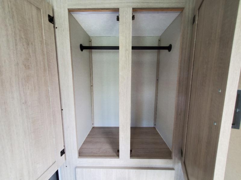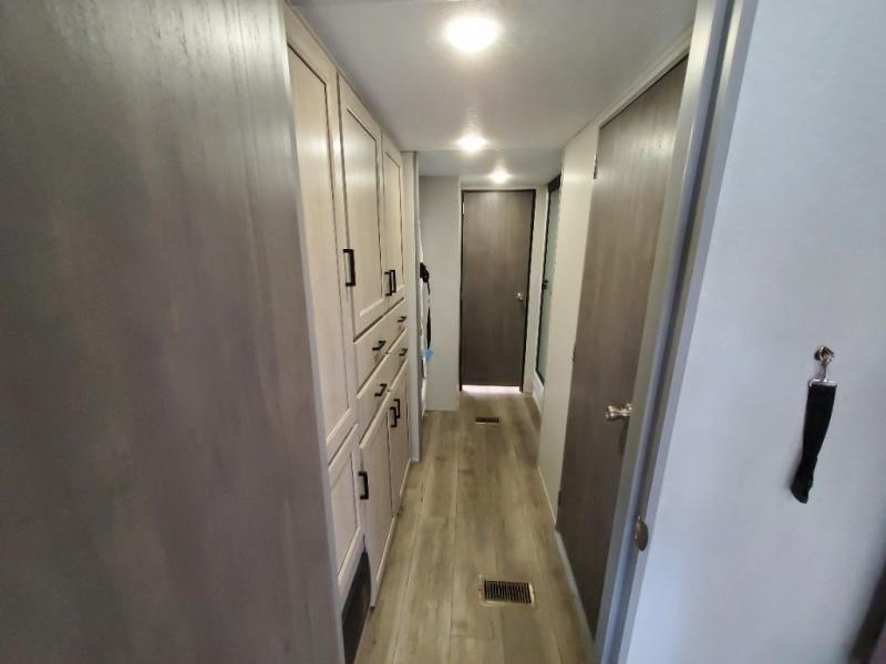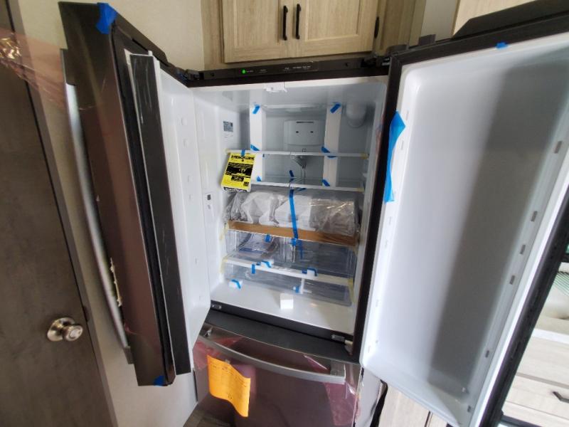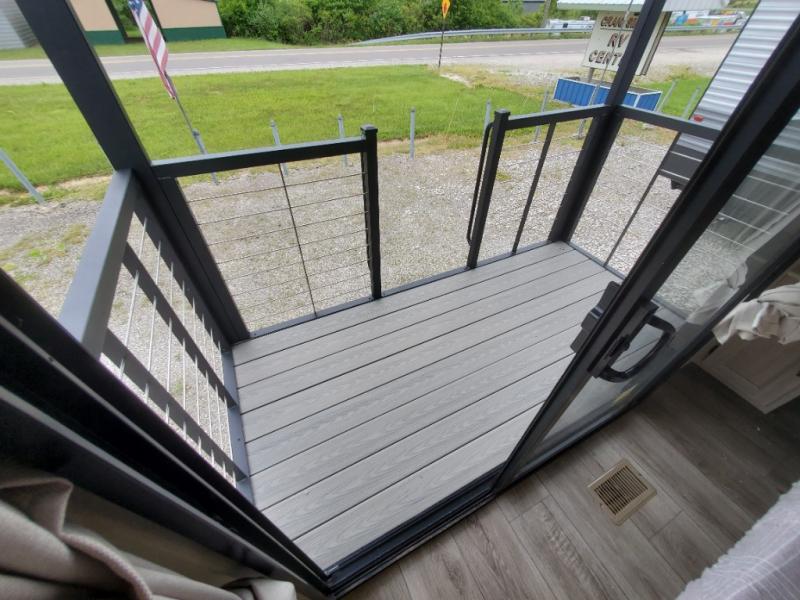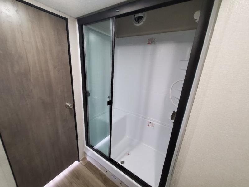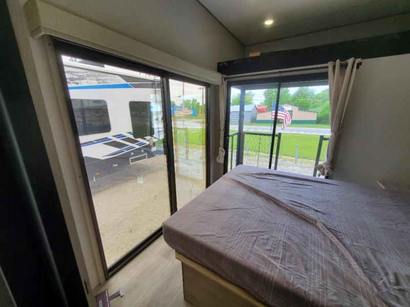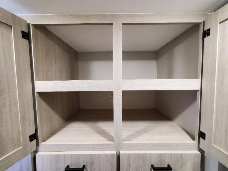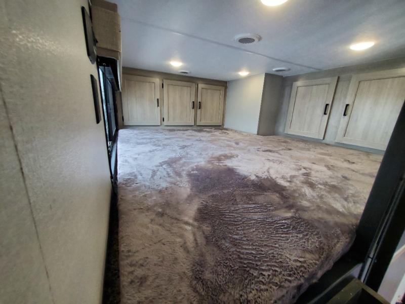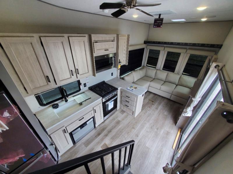 Plan to stay awhile in this spacious destination trailer with a loft! The loft includes cabinets so the little ones can keep their things picked up, and you'll appreciate tons of storage on the main level as well. You'll find your own space in the rear bedroom that includes a patio door that leads to the covered porch, a 60" x 74" queen bed, a wardrobe with drawers, plus a high ceiling that will make this space feel more open. There is a 48" x 30" shower with a seat to freshen up each day and a private toilet and sink so two people can use this space at once, or you can shut the two main doors to make one big bathroom! The front living area will be a favorite place to hang out since there is an L-shaped sectional sofa, and the full kitchen will allow you to make your best meals while you're away from home. The high kitchen/living room ceiling is another great feature on this unit, making your space more open!